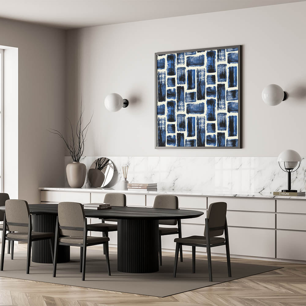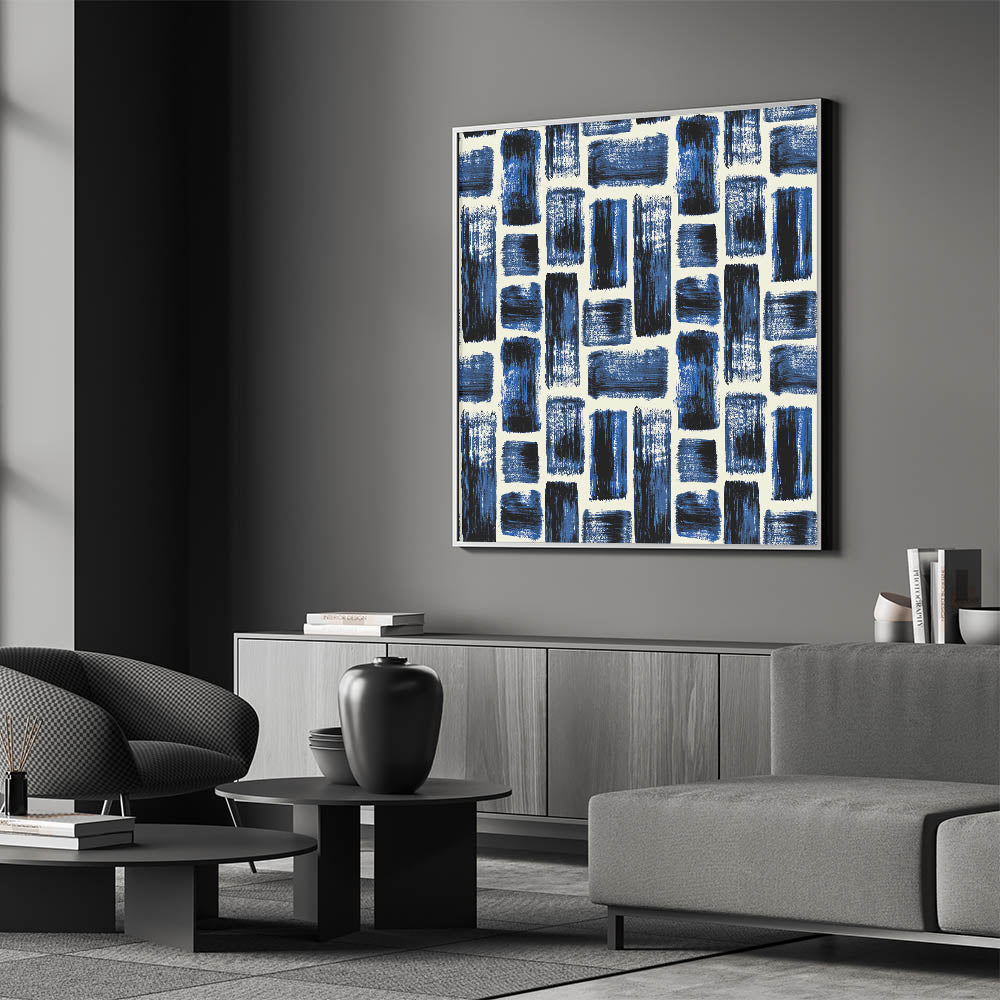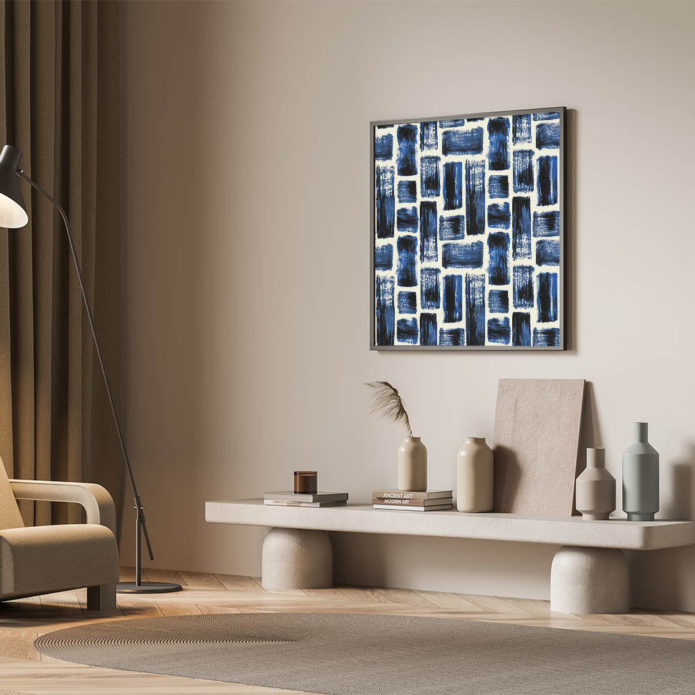 Bold and energetic, this design from our Earthen Harmony Abstracts introduces texture and rhythm to any space. Structured brushstroke patterns in navy, royal blue, and black bring contemporary contrast to this striking abstract wall art. With its balanced grid layout, it’s a sophisticated statement for modern abstract art lovers.