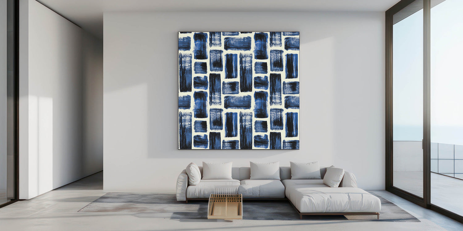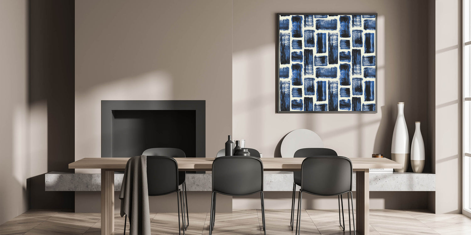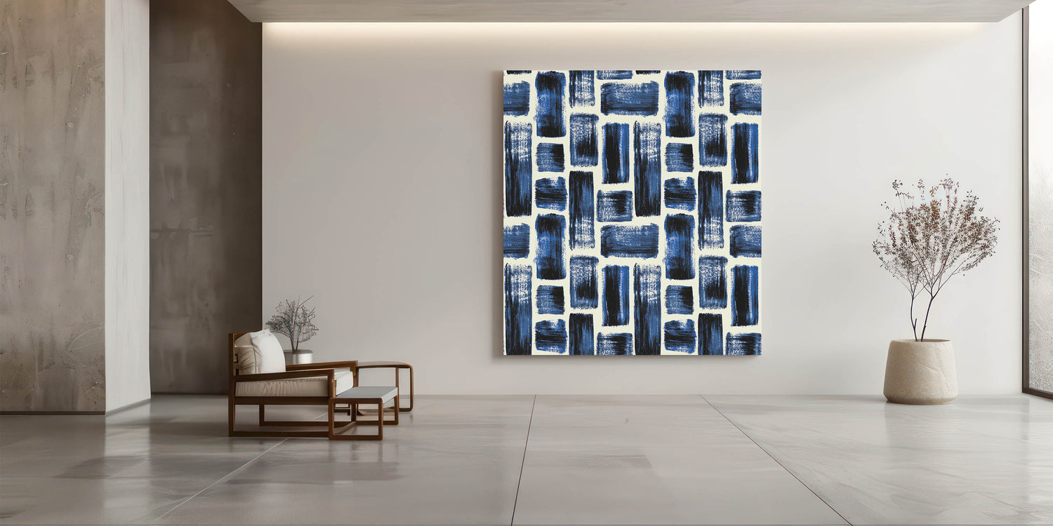 Bold and energetic, this design from our Earthen Harmony Abstracts introduces texture and rhythm to any space. Structured brushstroke patterns in navy, royal blue, and black bring contemporary contrast to this striking abstract wall art. With its balanced grid layout, it’s a sophisticated statement for modern abstract art lovers.