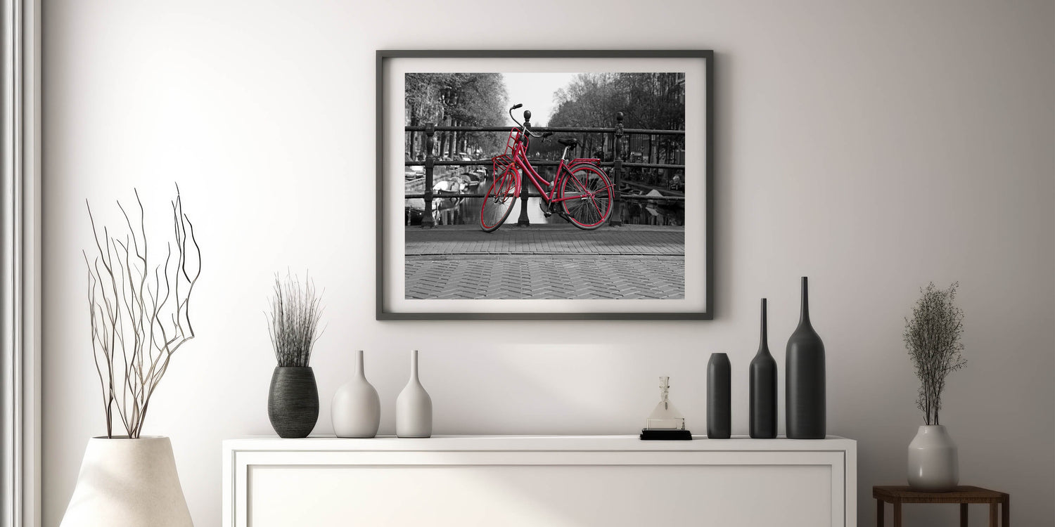 Add a pop of color to your space with this striking artwork from our Amsterdam art collection, featuring a bold red bicycle parked against a classic canal bridge. This piece captures the essence of iconic Amsterdam scenes, combining the charm of the city’s renowned canal bridges with a touch of vibrant modernity.