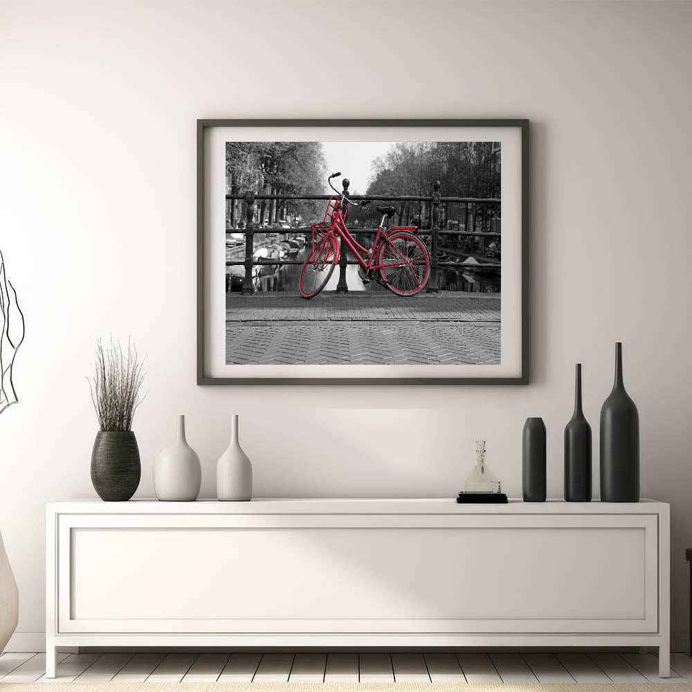 - High-quality Amsterdam prints with exceptional detail, showcasing a red bicycle in a black and white setting.