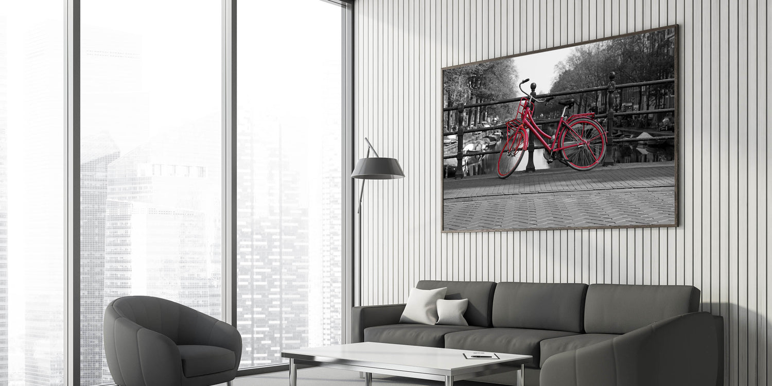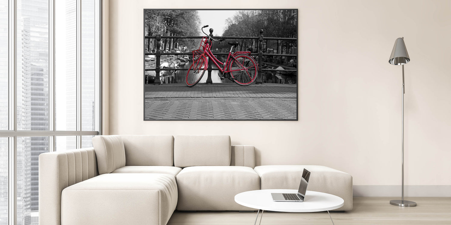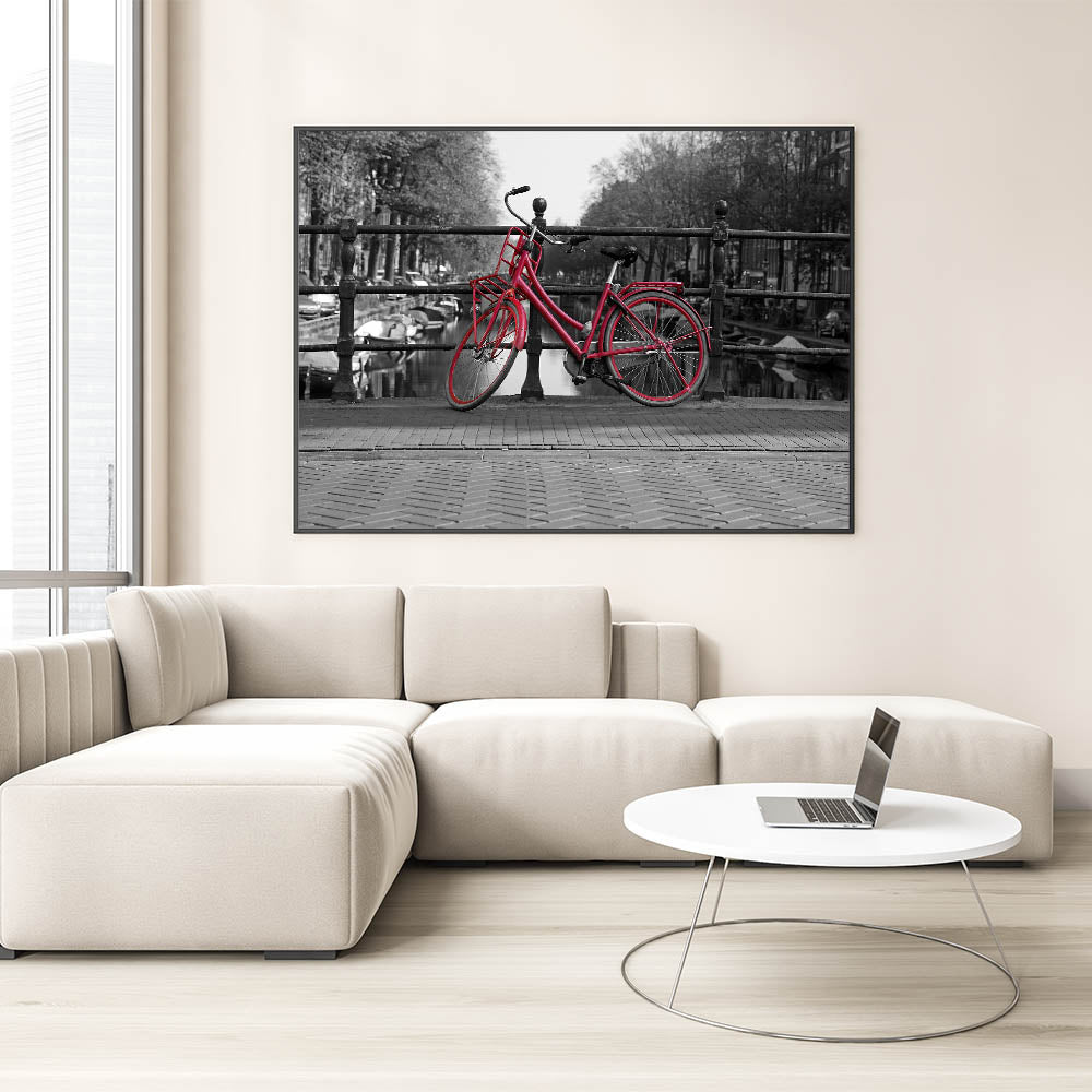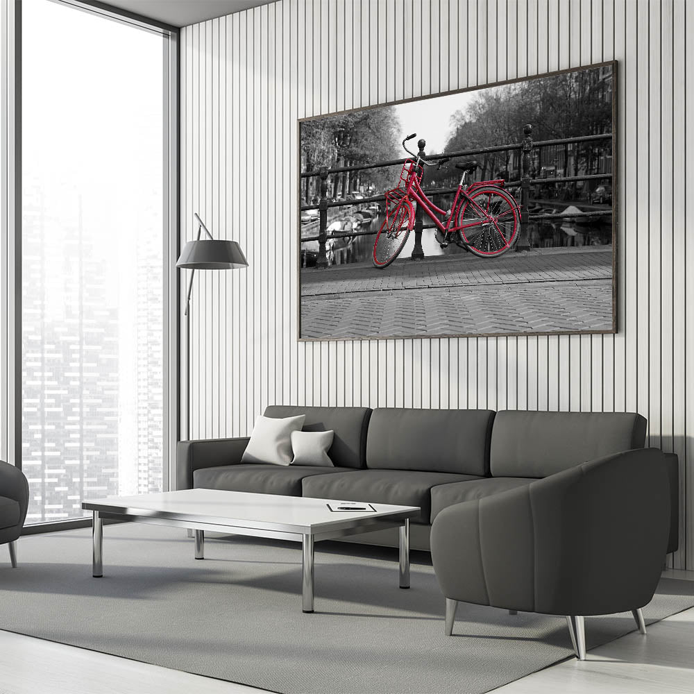 This artistic Amsterdam wall art is a perfect addition to any modern or classic decor. The rich red bicycle against the monochrome background adds an energetic contrast, creating a captivating and lively aesthetic.