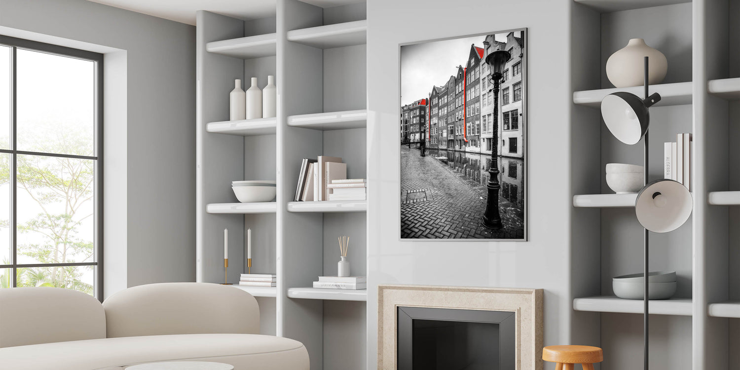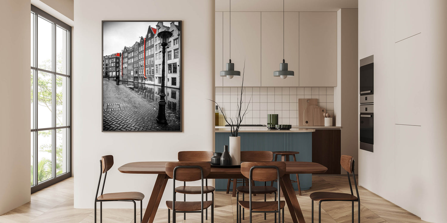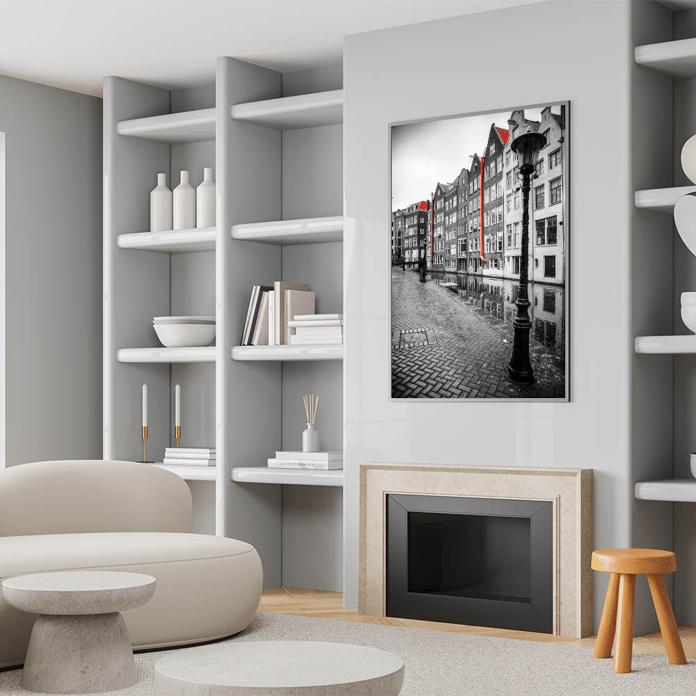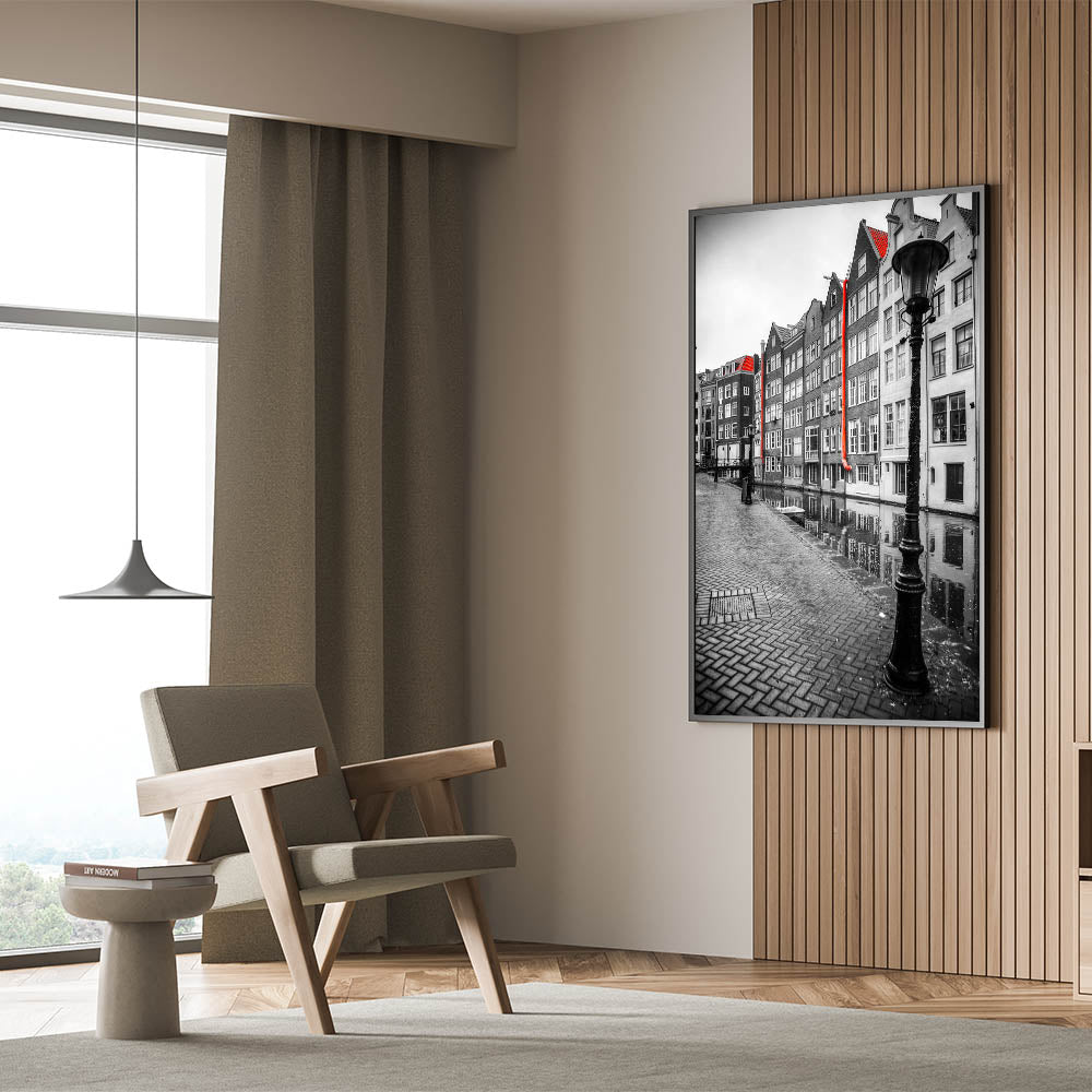 Add a dramatic touch of elegance to your space with this striking black and white photograph from our Amsterdam art collection. This piece beautifully contrasts the rich architecture of Amsterdam’s historic buildings with selective pops of red, making it a visually captivating representation of iconic Amsterdam scenes.