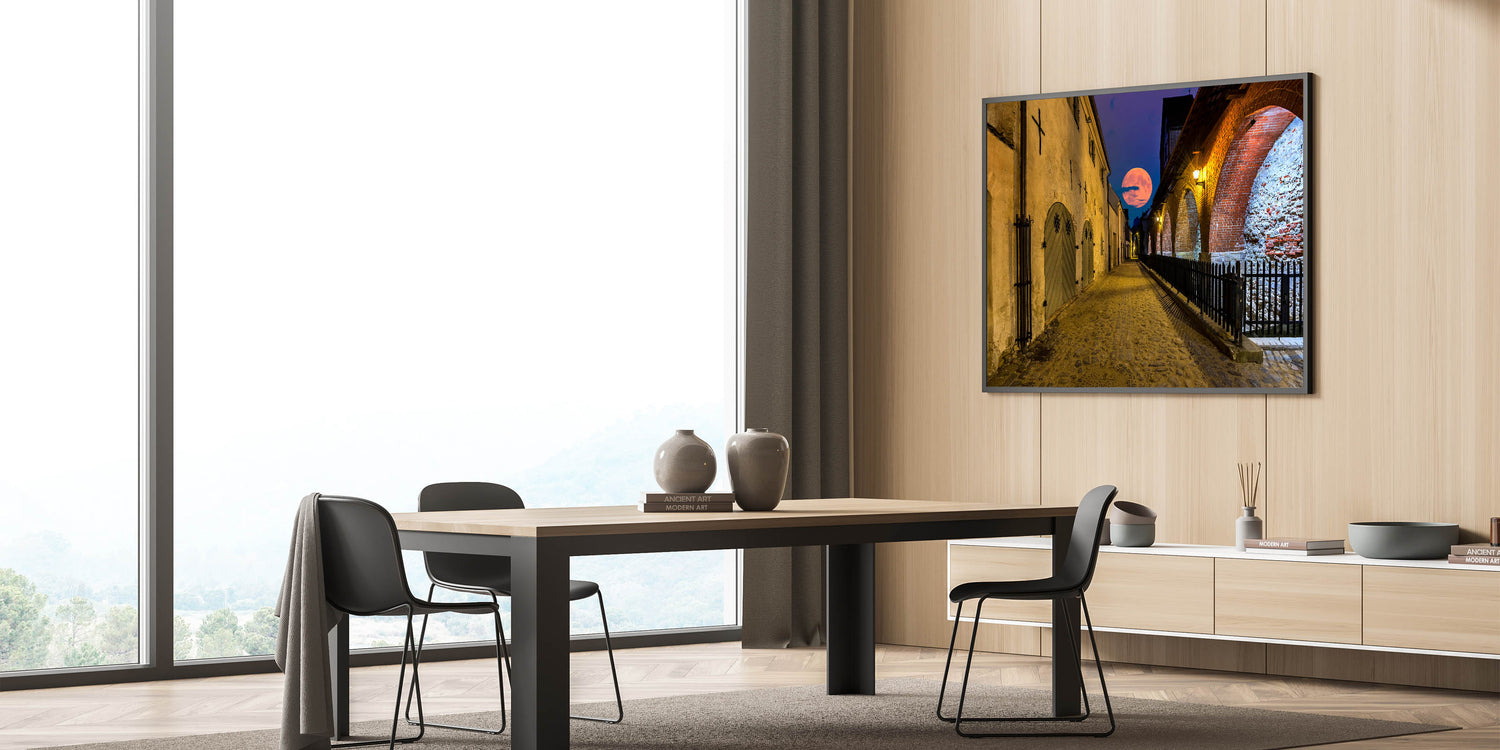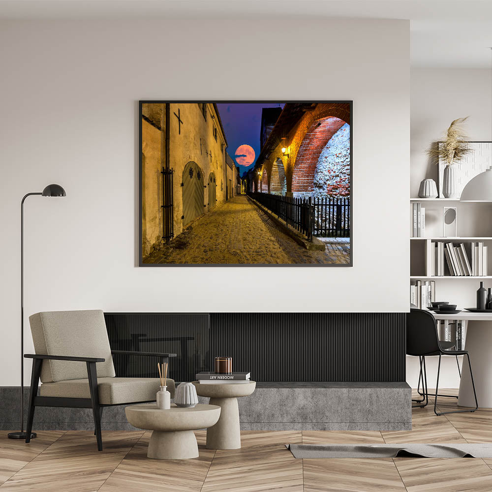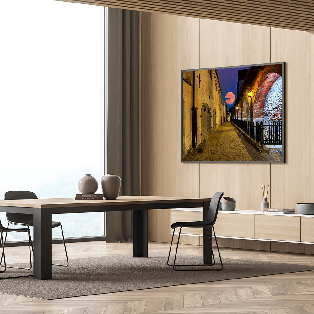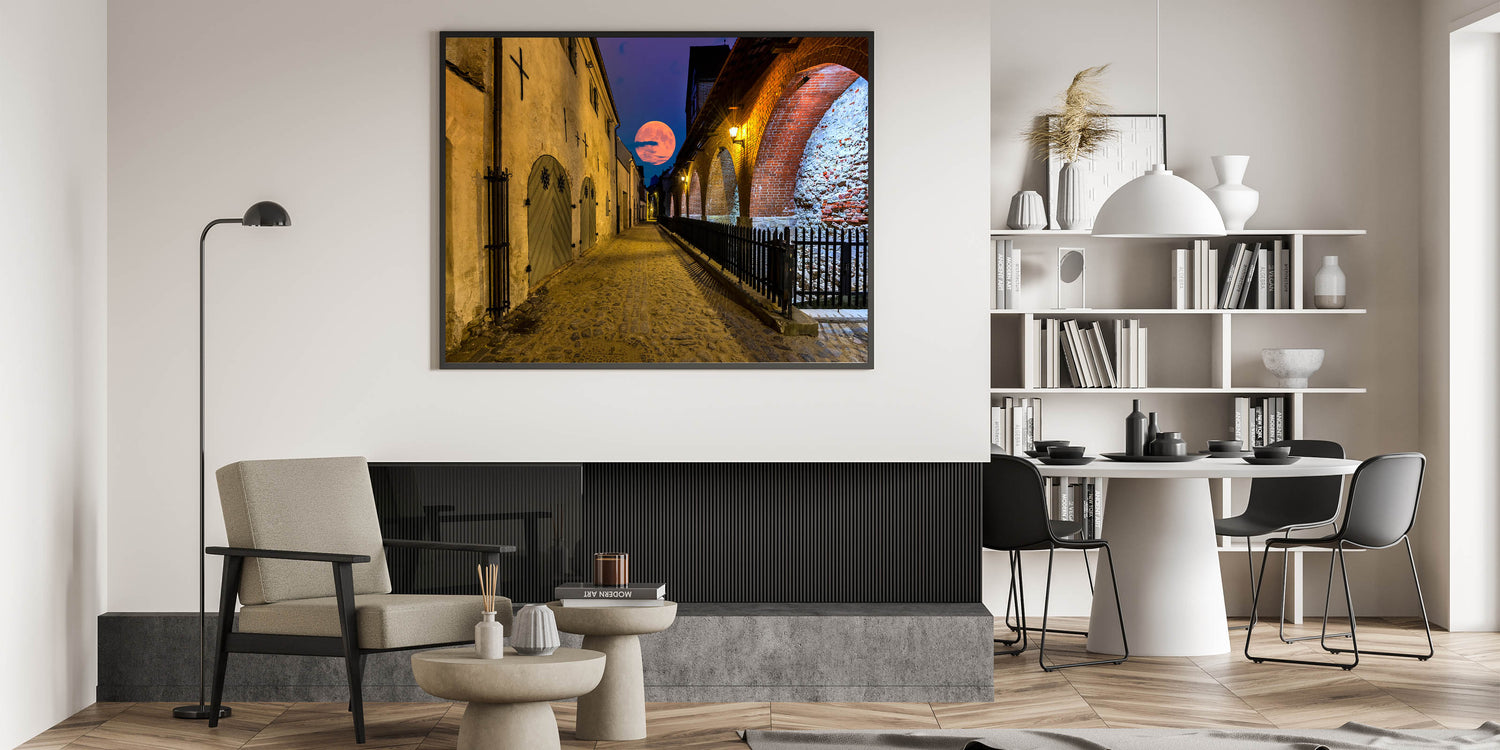 Transport yourself to a quiet evening in Amsterdam with this stunning artwork from our Amsterdam art collection, featuring a historic cobblestone street bathed in the glow of a rising full moon. This piece captures the allure of iconic Amsterdam scenes, combining the city’s timeless architecture with the magical charm of moonlight.