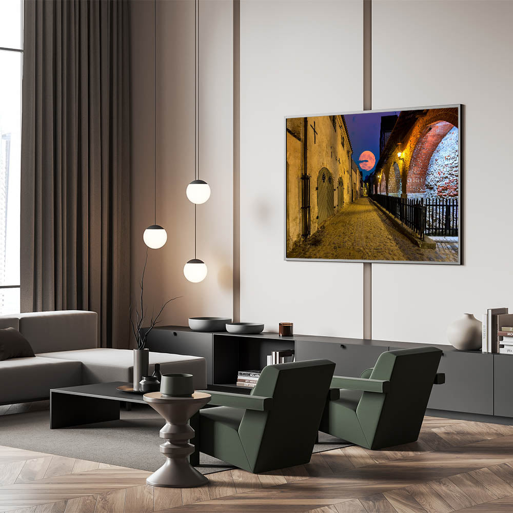 This artistic Amsterdam wall art is an enchanting addition to any living room, bedroom, or office. The warm tones of the street’s architecture combined with the brilliant moonlit sky create a breathtaking contrast that will captivate anyone who enters the room.