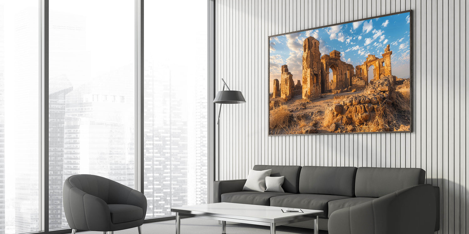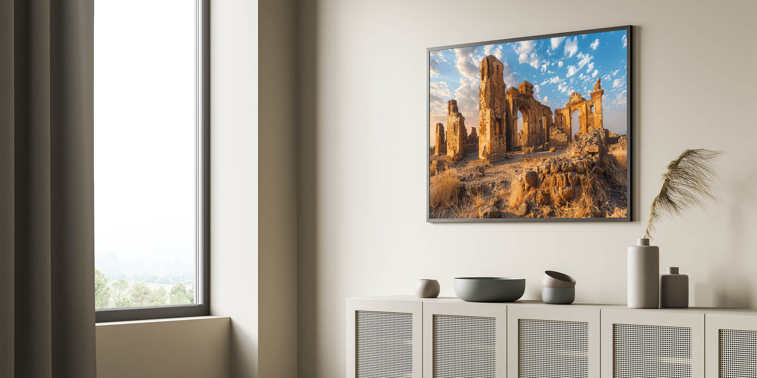 - High-quality prints that emphasize the textures of the crumbling ruins and the vibrant colors of the desert sunset.