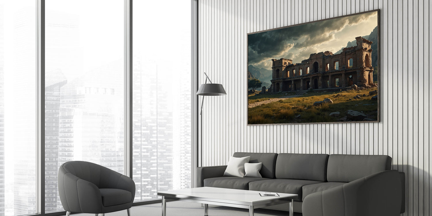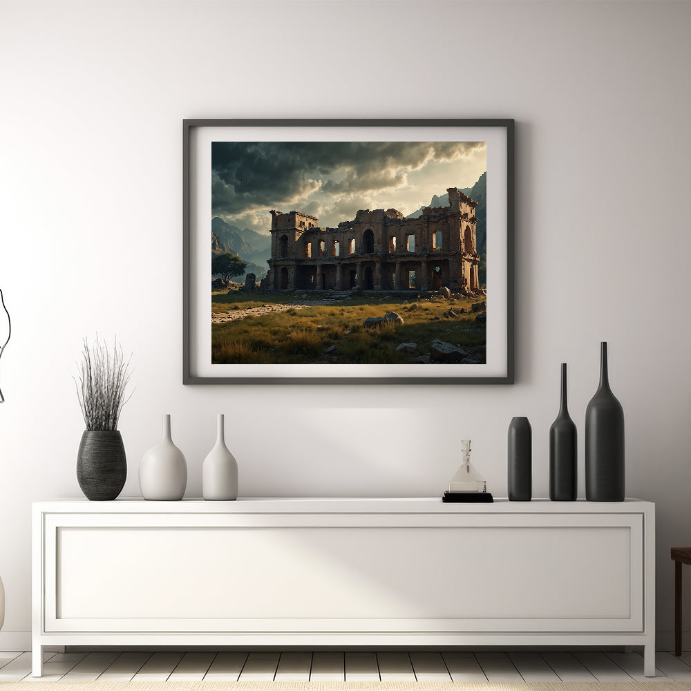 Step into the mysterious world of ancient ruins with this evocative wall art featuring a crumbling stone mansion set against a dramatic mountainous landscape. The dark clouds looming overhead and the towering mountains in the background enhance the haunting atmosphere of this once-grand structure. Perfect for those who appreciate the beauty of decay and the stories held within ancient walls, this artwork adds a sense of history and drama to any space.