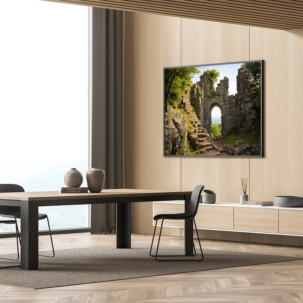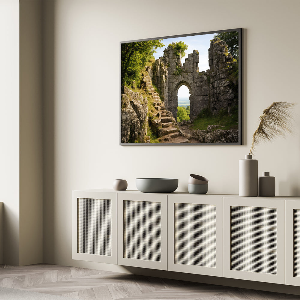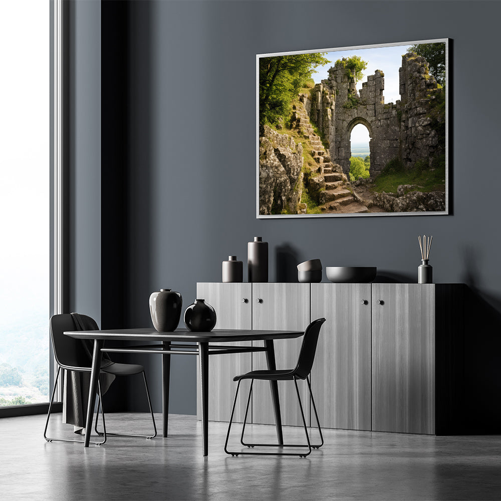Immerse yourself in the enchanting beauty of ancient ruins with this captivating wall art. Featuring a rugged stone archway and a weathered staircase, this piece invites viewers to explore a long-forgotten past. The lush greenery surrounding the ancient structure adds a touch of nature's resilience to the scene, creating a harmonious blend of architecture and landscape.