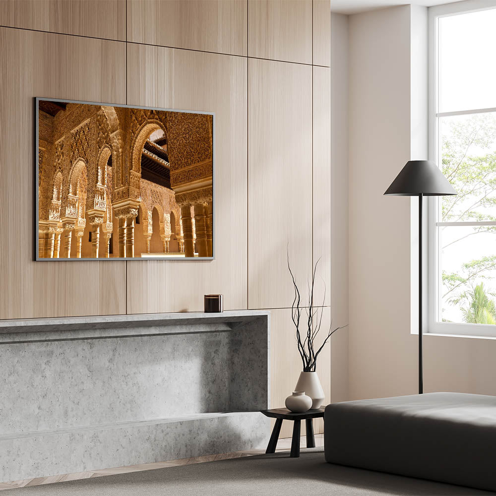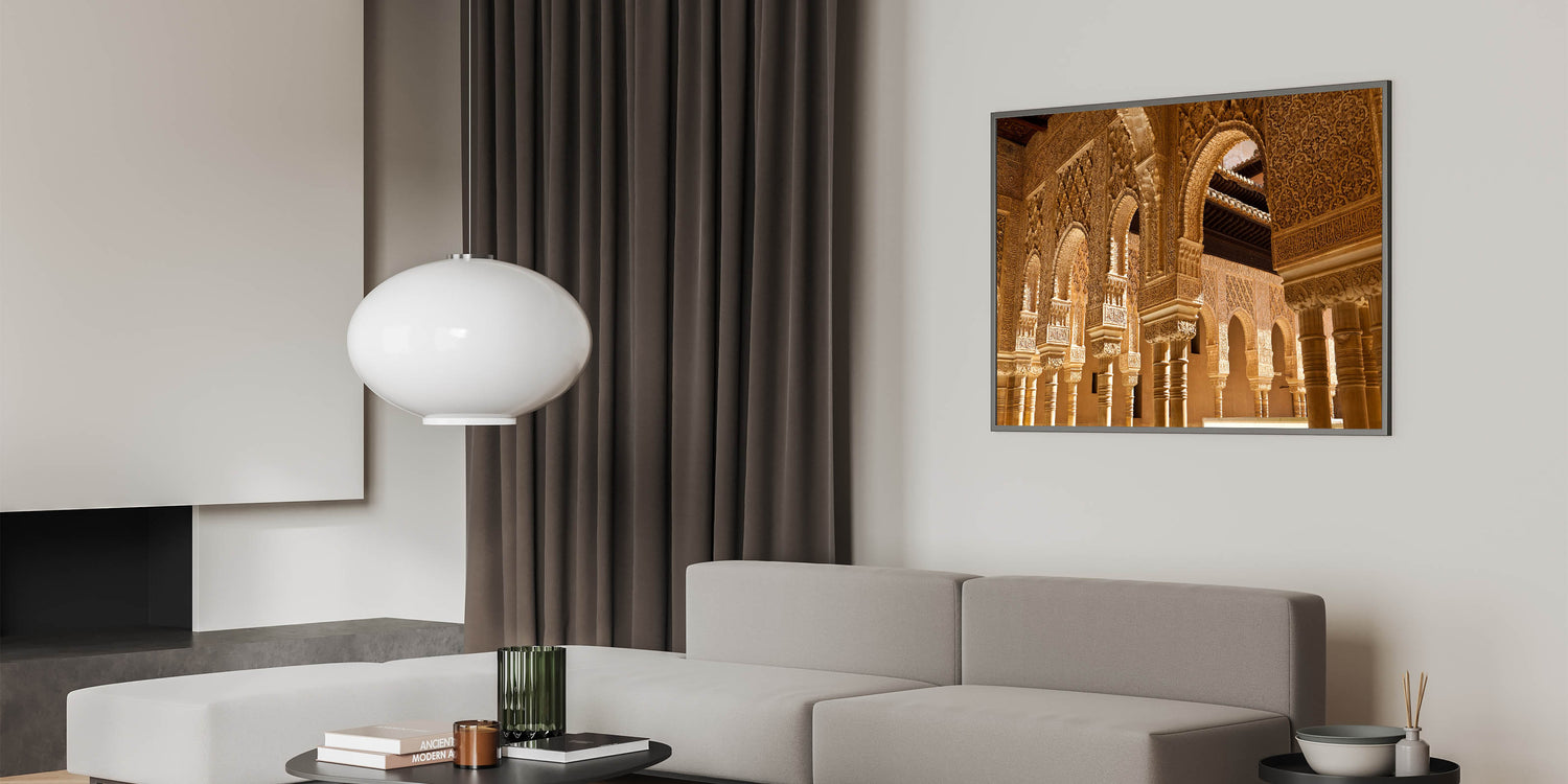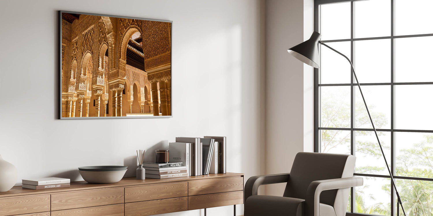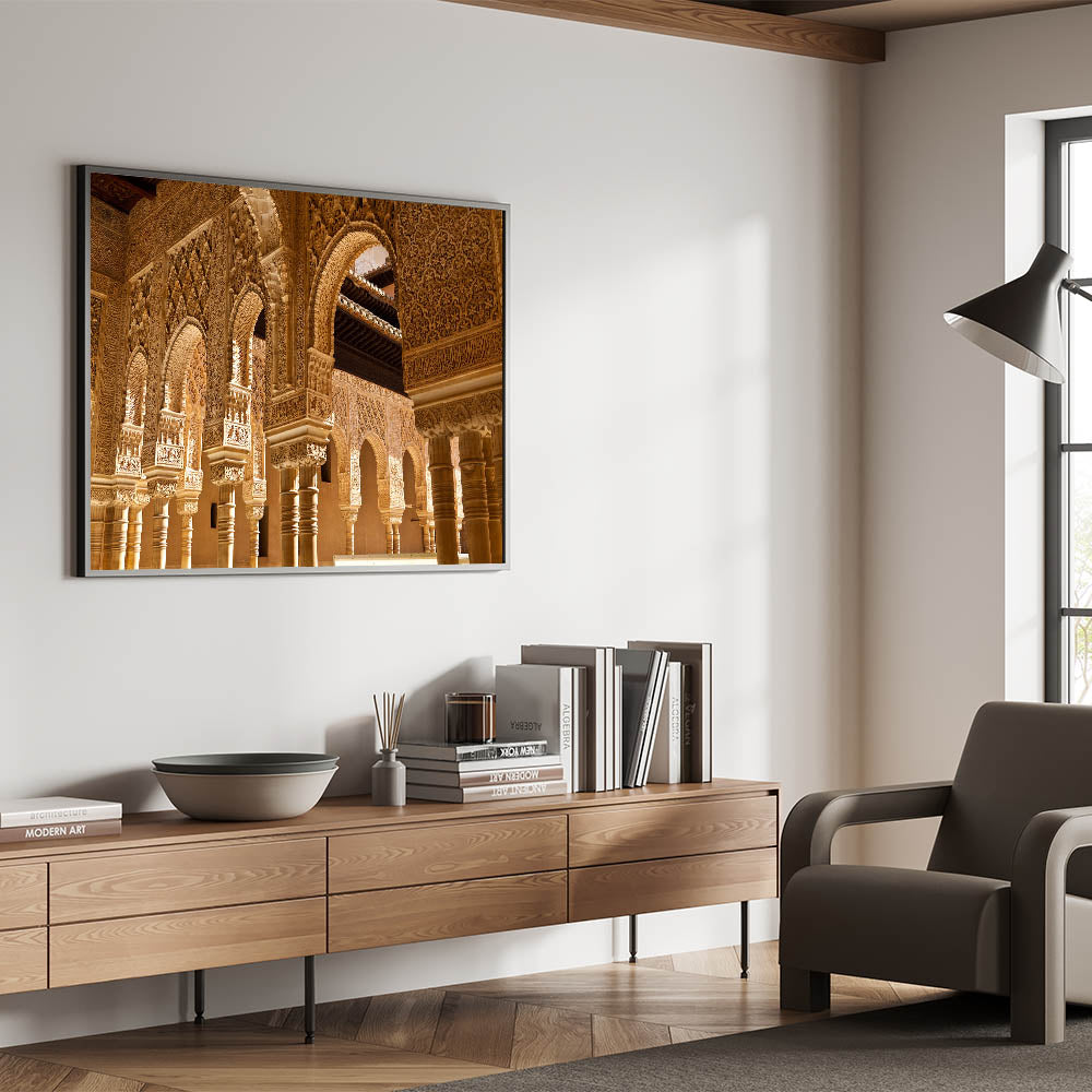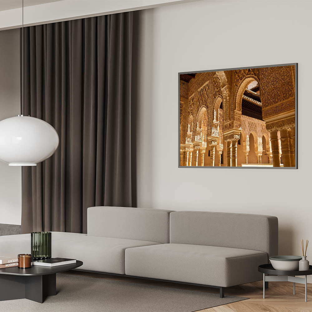 Bring the historical elegance of Andalucía into your home with this stunning canvas print, showcasing the intricate arches of the Alhambra Palace. The exquisite detailing and warm golden hues of this iconic site highlight the craftsmanship and architectural brilliance of Moorish design, making it a perfect addition to any space.