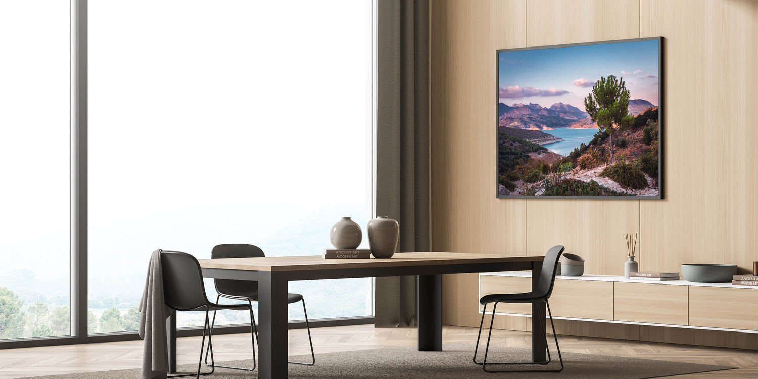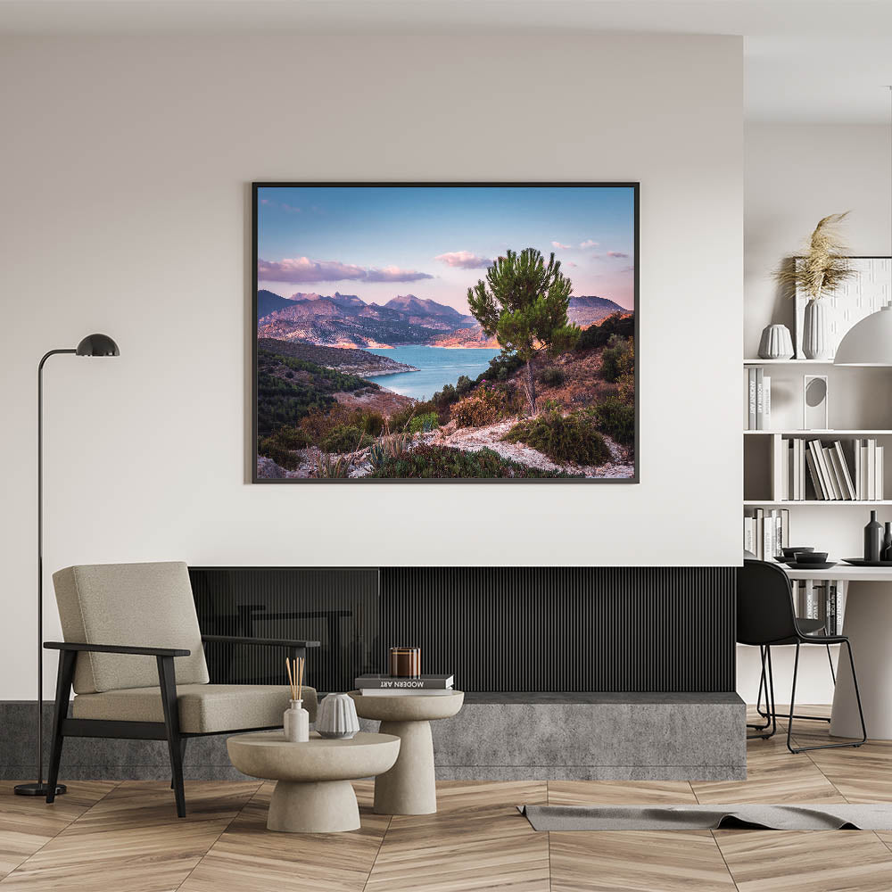 - A serene depiction of Andalucía's lake and mountain views, perfect for adding a natural and relaxing touch to your space.