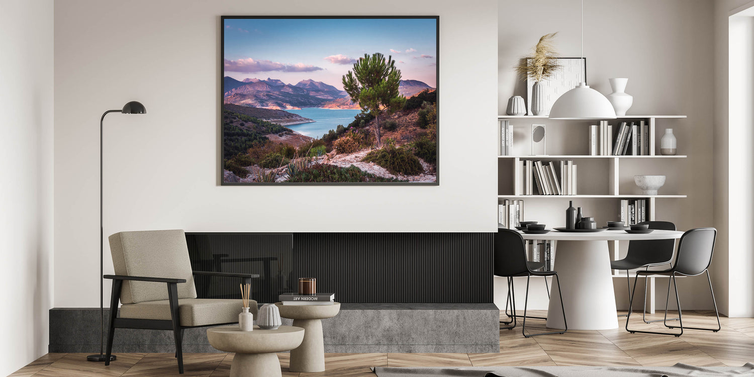 Immerse yourself in the tranquil beauty of Andalucía with this stunning photography print capturing a peaceful lake surrounded by rolling hills and distant mountains. The serene blue waters and the warm sunlight casting soft hues on the landscape make this a perfect addition to any room, evoking calmness and a connection to nature. The detailed greenery and rugged terrain of Andalucía create a mesmerizing visual, ideal for nature lovers and landscape enthusiasts.