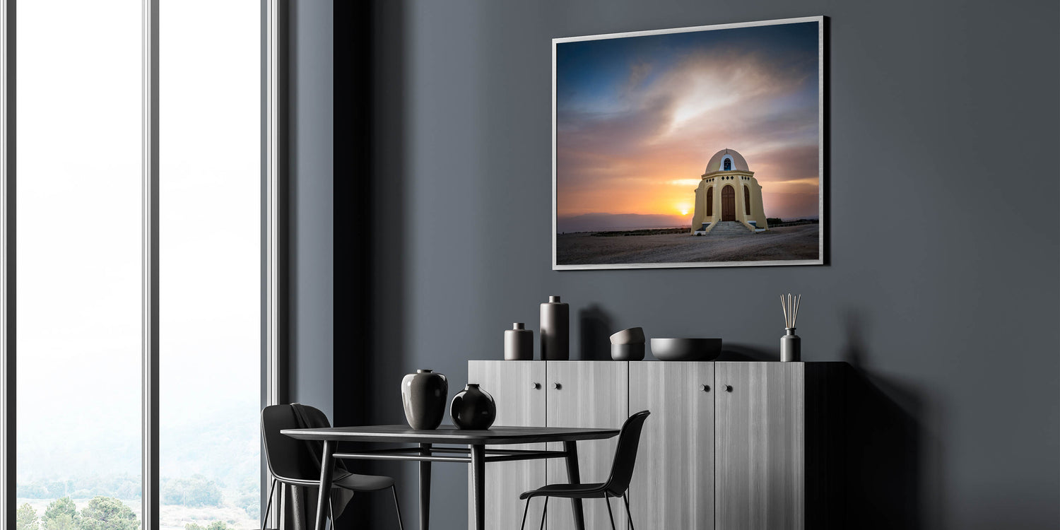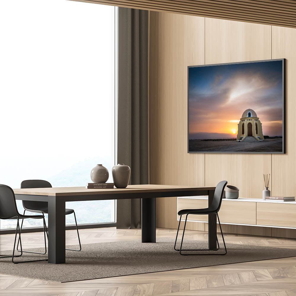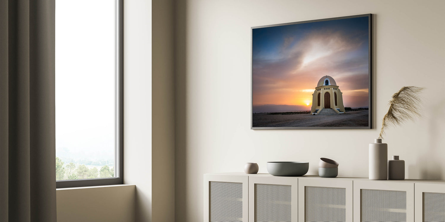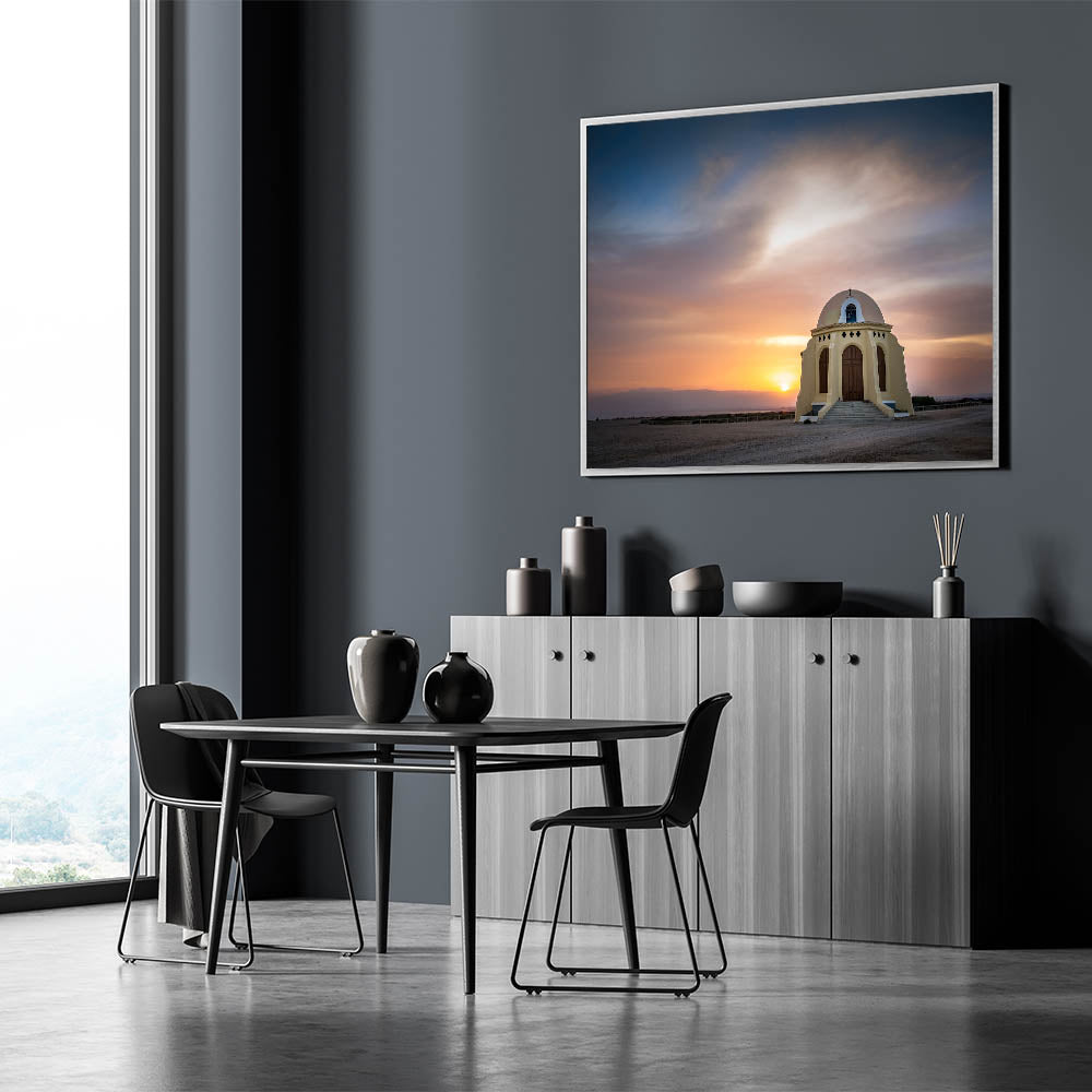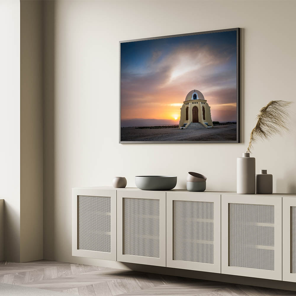 Enhance your living space with this stunning piece of Scenic Andalucía artwork, featuring a peaceful dome chapel bathed in the golden hues of a Spanish sunset. This captivating landscape brings together the serene beauty of Andalucía's countryside with the architectural elegance of the region’s historic buildings. The soft sky colors and the chapel’s subtle design create a calming and inspirational visual.