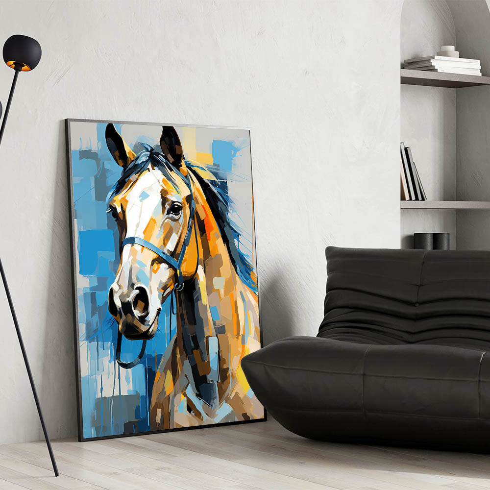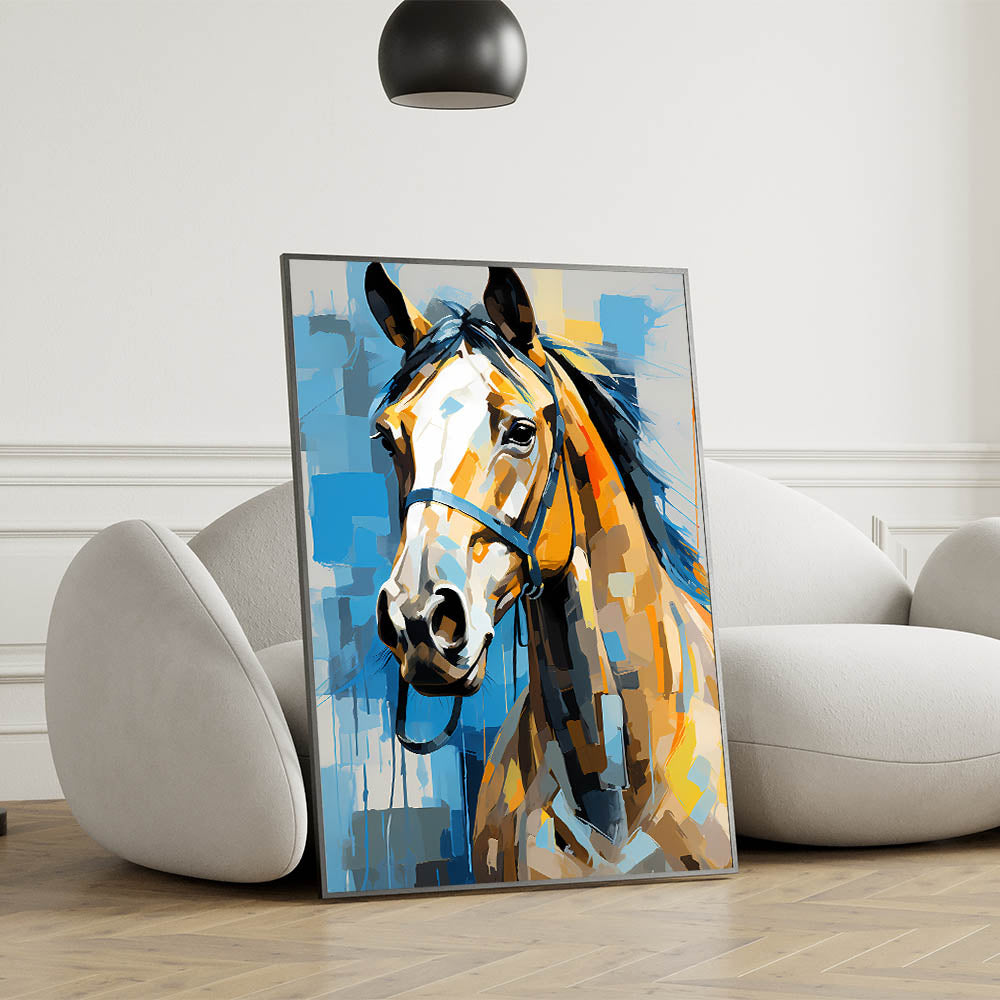Enhance your home decor with this dynamic wildlife painting wall art featuring a stunning abstract portrait of a horse. The vibrant mix of blue, orange, and yellow tones creates a bold and modern statement, while the horse's expressive gaze adds depth and emotion to the artwork. Perfect for living rooms, offices, or creative spaces, this piece combines artistic flair with the timeless elegance of equestrian beauty.