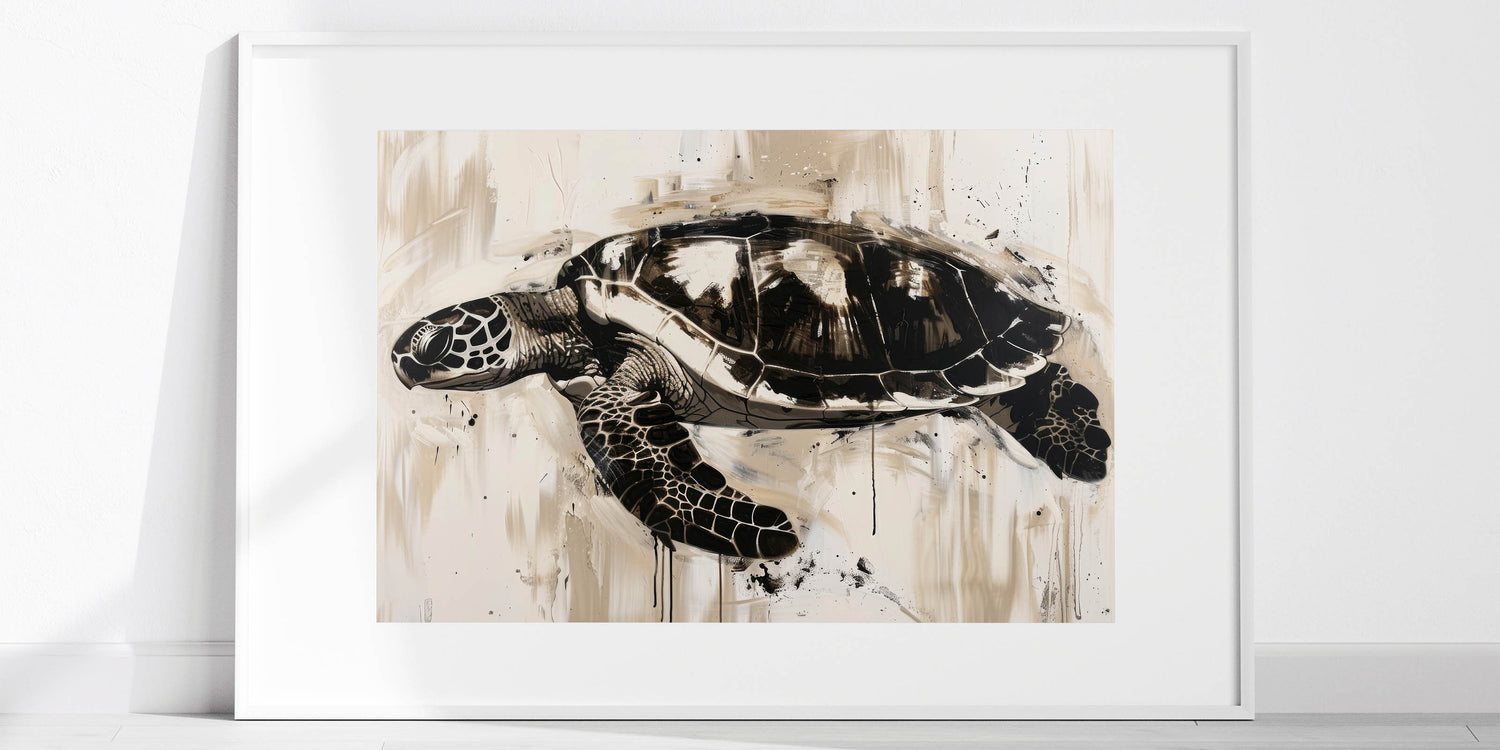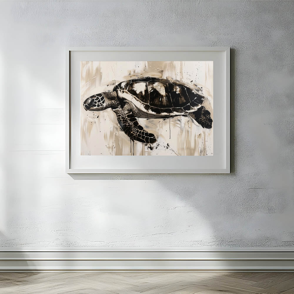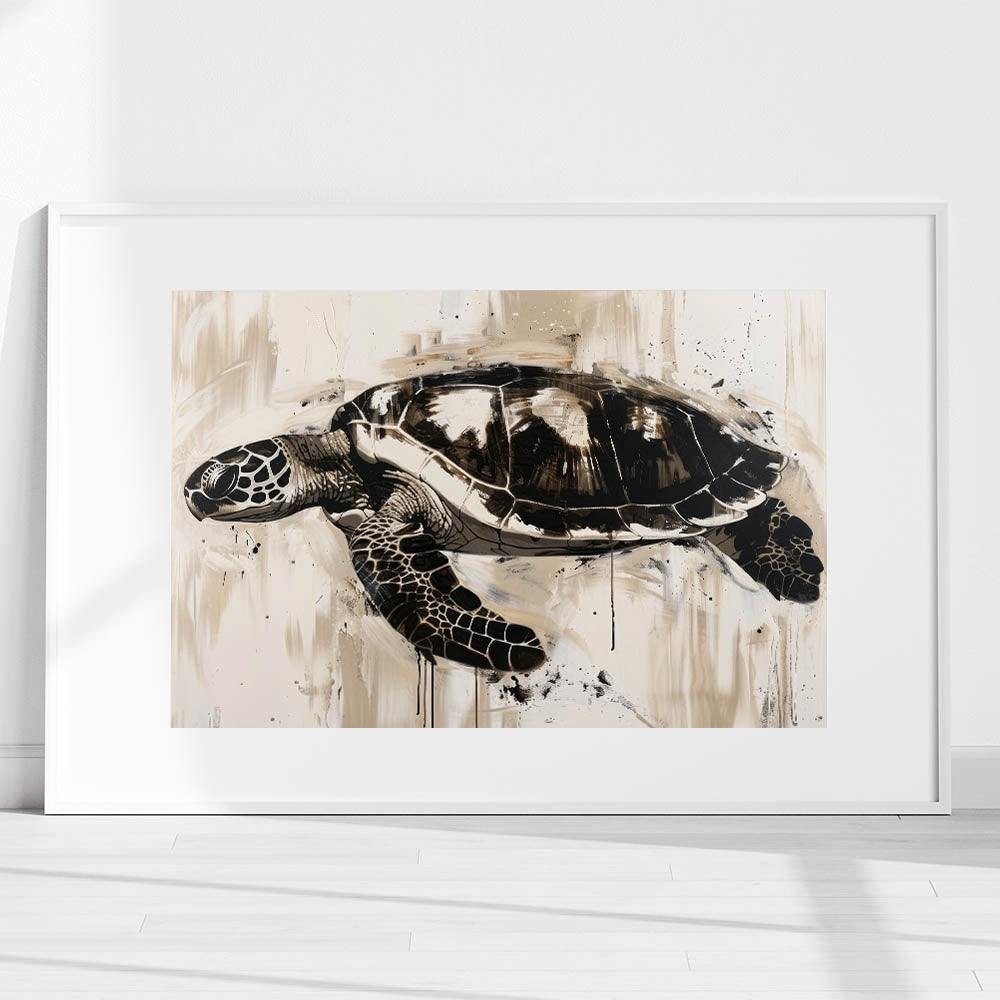 Introduce a bold, artistic statement to your space with this abstract turtle art. Featuring a dynamic blend of black, white, and beige tones, this artwork reimagines the beauty of a sea turtle in a strikingly modern, abstract style. The fluid lines and splashes of color create a sense of movement and energy, making this piece perfect for contemporary interiors that embrace creativity and bold design choices. Ideal for art lovers and those looking to elevate their decor, this artwork is available in a range of formats to suit your style.
