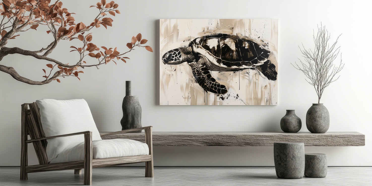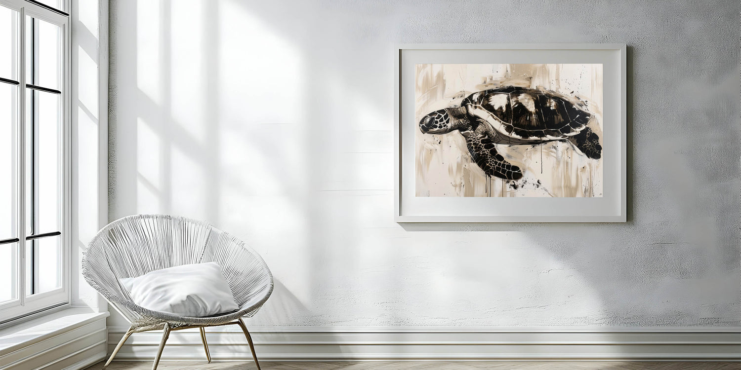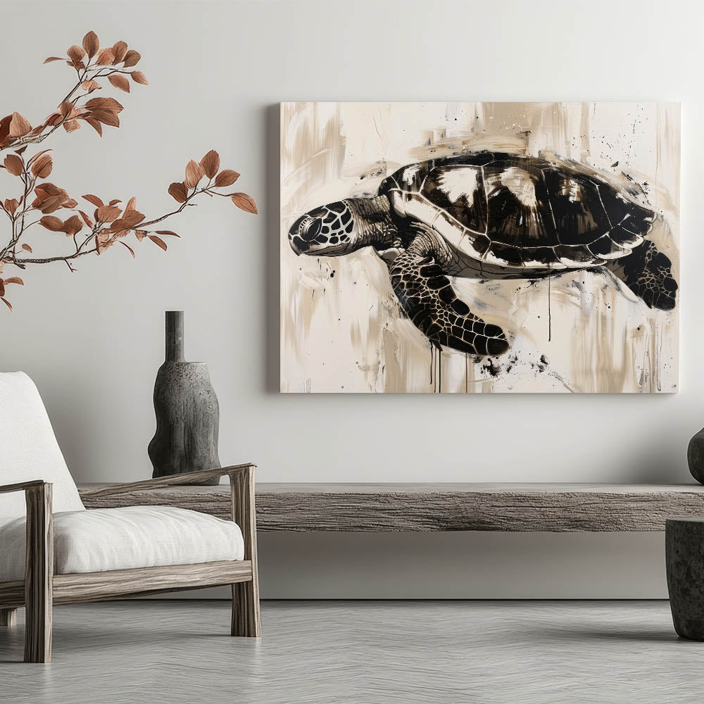Introduce a bold, artistic statement to your space with this abstract turtle art. Featuring a dynamic blend of black, white, and beige tones, this artwork reimagines the beauty of a sea turtle in a strikingly modern, abstract style. The fluid lines and splashes of color create a sense of movement and energy, making this piece perfect for contemporary interiors that embrace creativity and bold design choices. Ideal for art lovers and those looking to elevate their decor, this artwork is available in a range of formats to suit your style.