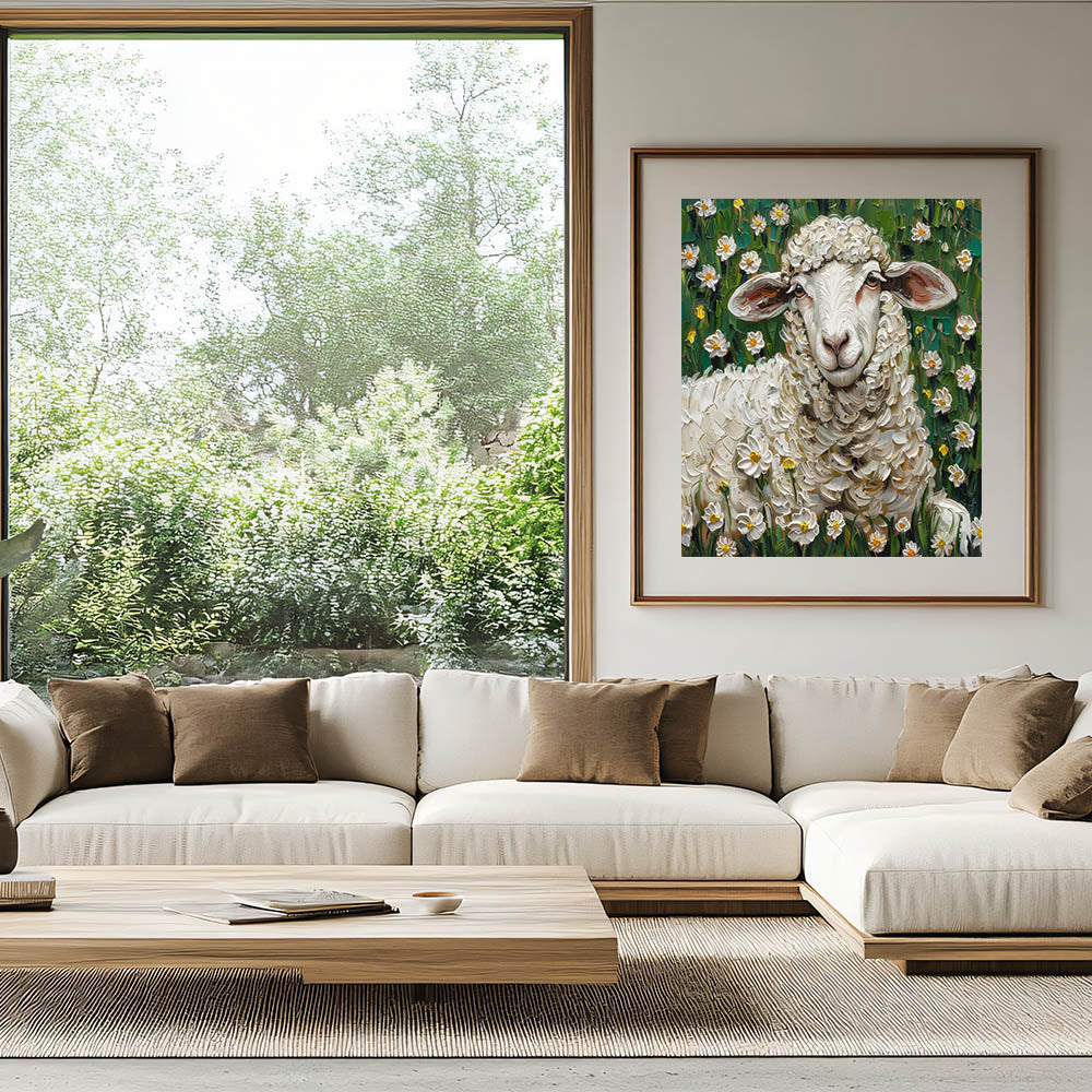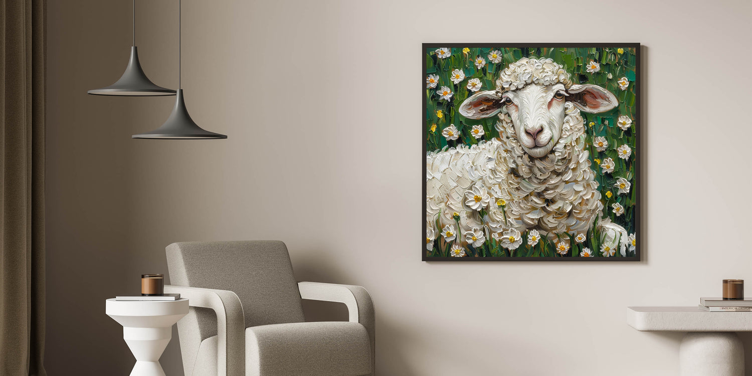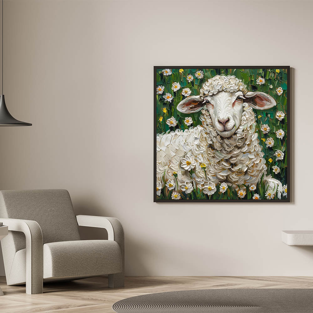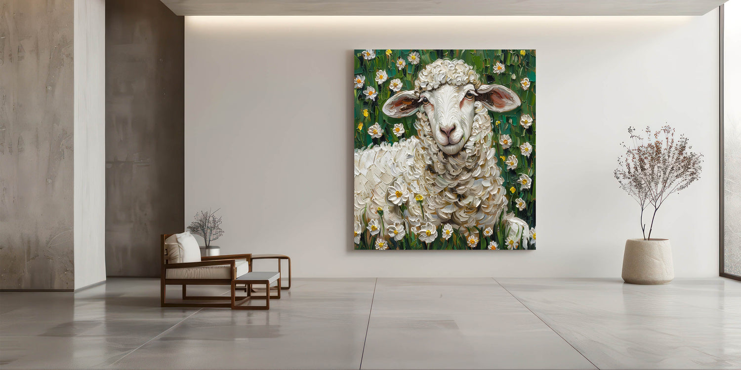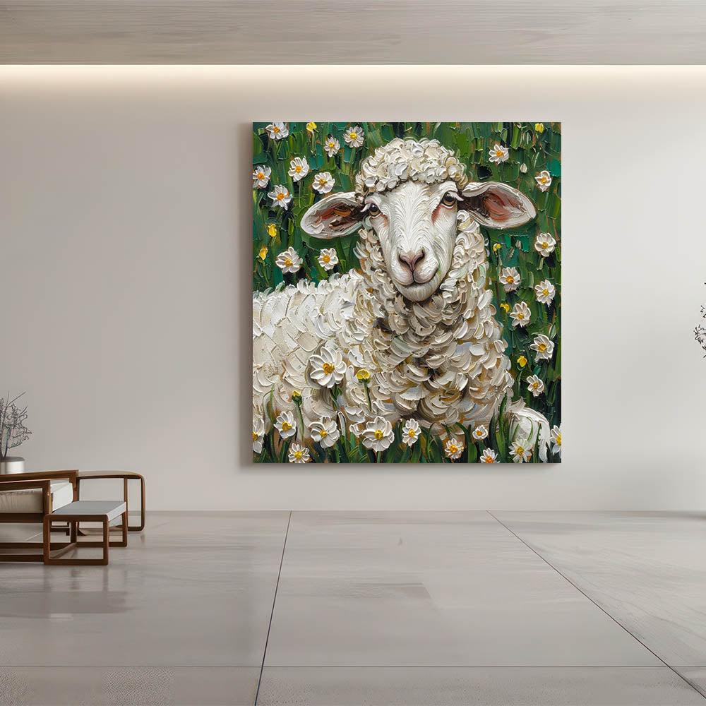 Add charm and warmth to your home with this delightful sheep wall art. Featuring a fluffy sheep nestled in a field of cheerful daisies, this oil painting captures the innocence and beauty of rural life. The thick brushstrokes and textured details create a lifelike representation that adds depth and character to any space. This artwork is perfect for animal lovers and those who appreciate pastoral scenery.