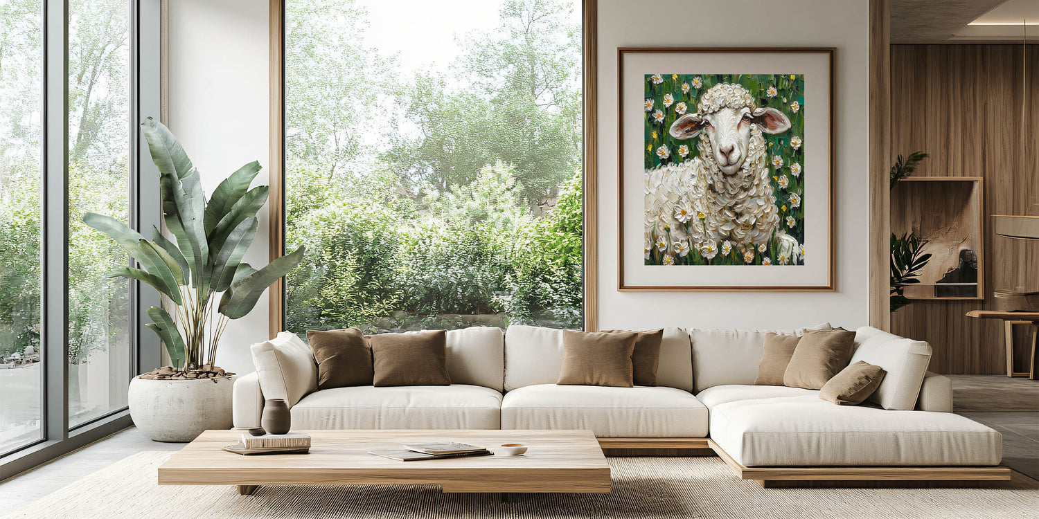 Bring a touch of countryside charm to your decor with this serene sheep painting. Ideal for brightening up living rooms, kitchens, or nurseries, this piece adds a sense of joy and tranquility to your space. Its vibrant colors and playful composition make it a versatile addition to rustic or contemporary interiors.