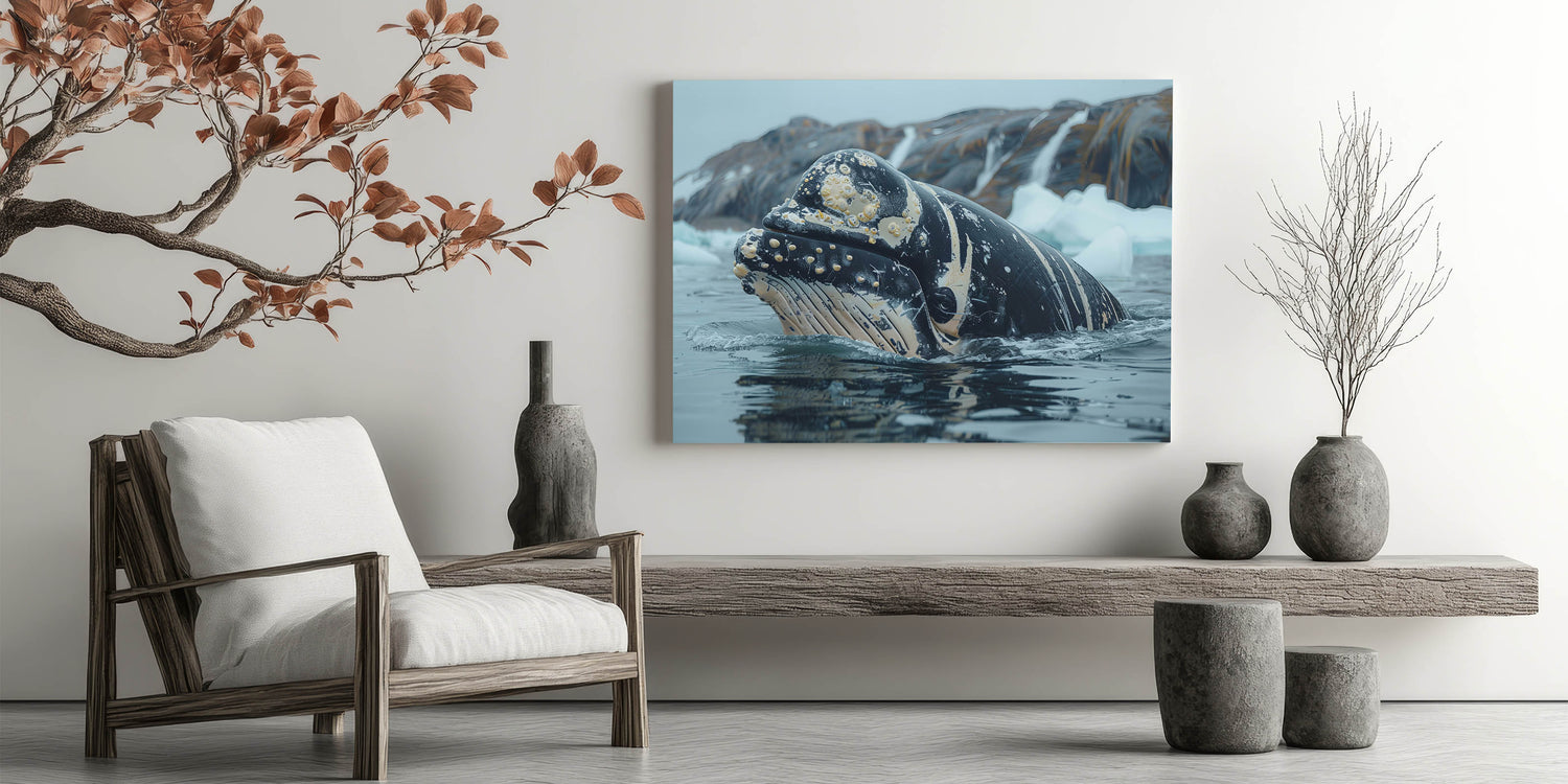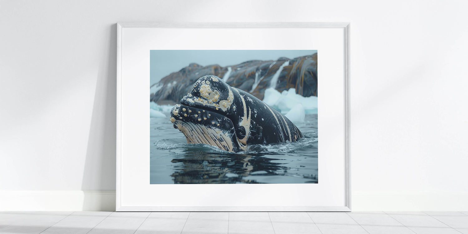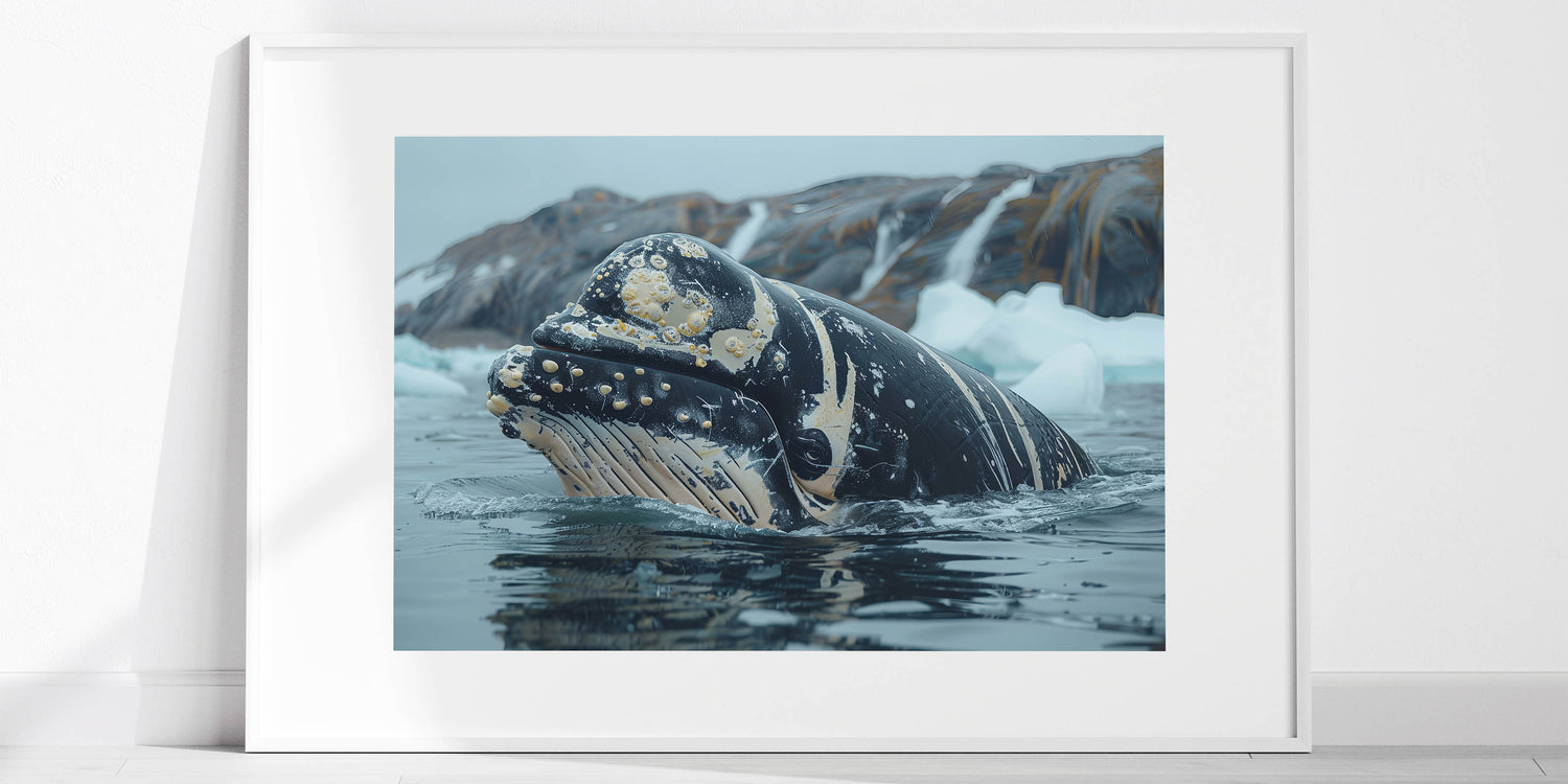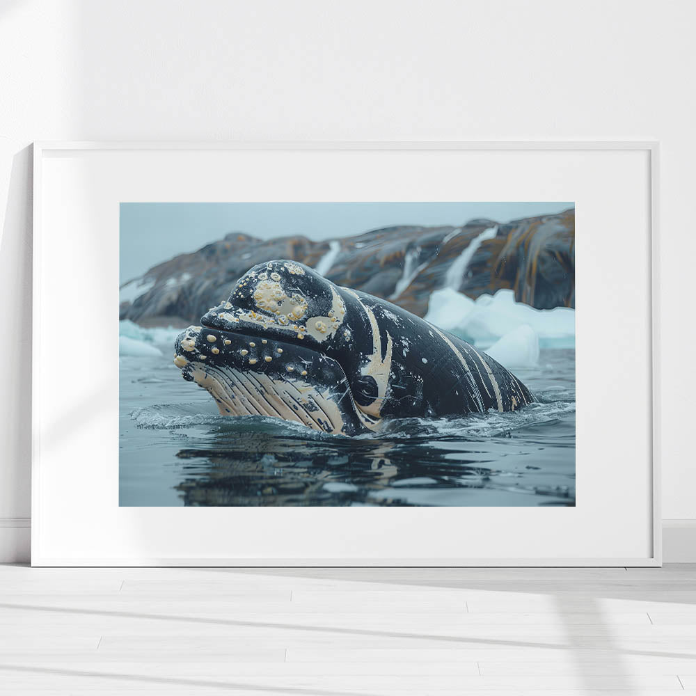 Immerse yourself in the raw beauty of nature with this close-up whale wall art. Capturing the intricate details of a whale emerging from icy waters, this piece offers a stunning depiction of marine life in its natural habitat. The combination of dark and muted tones against the icy backdrop creates a striking contrast that brings depth and realism to any space.