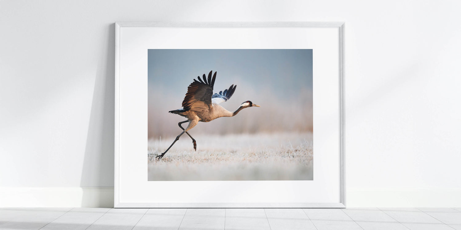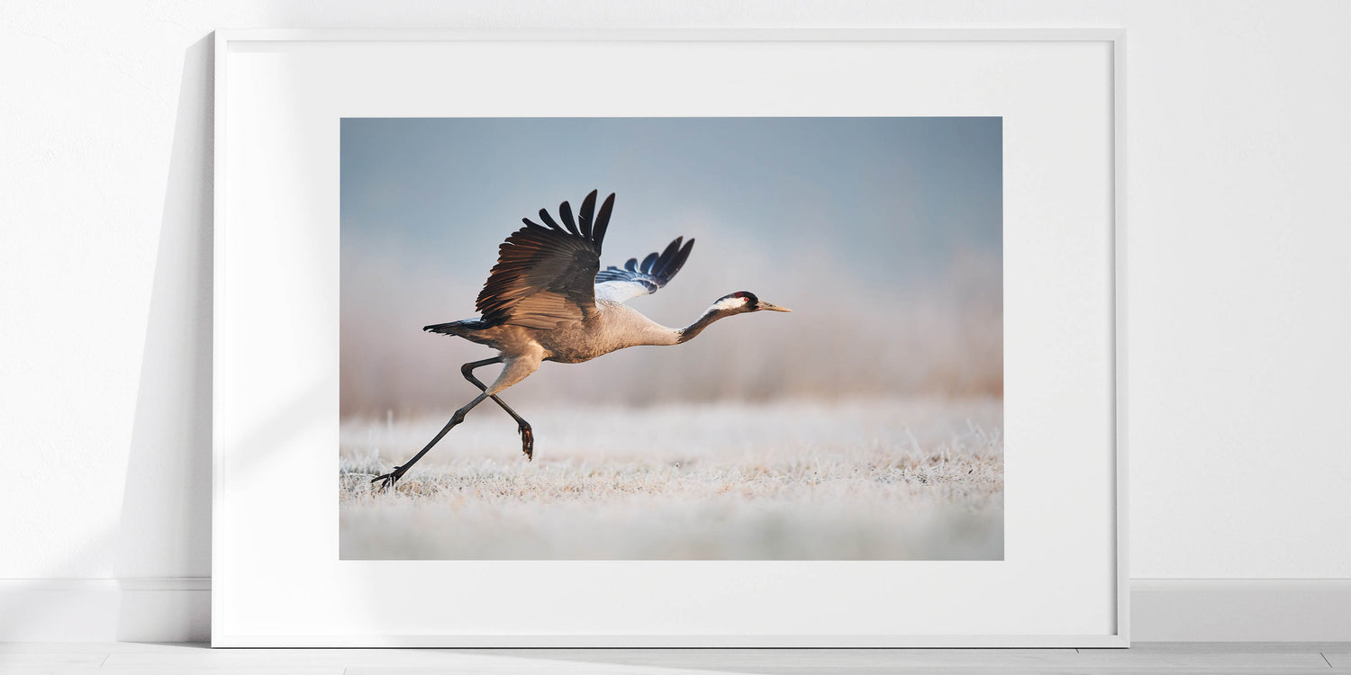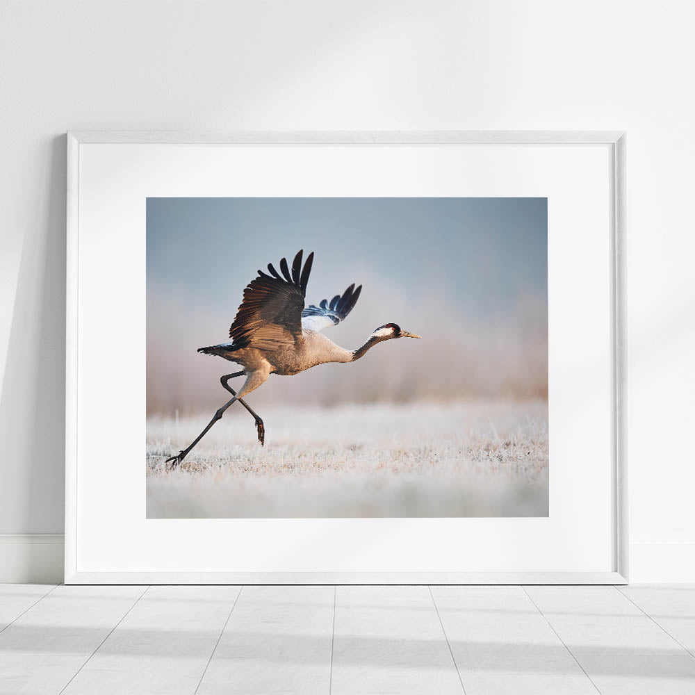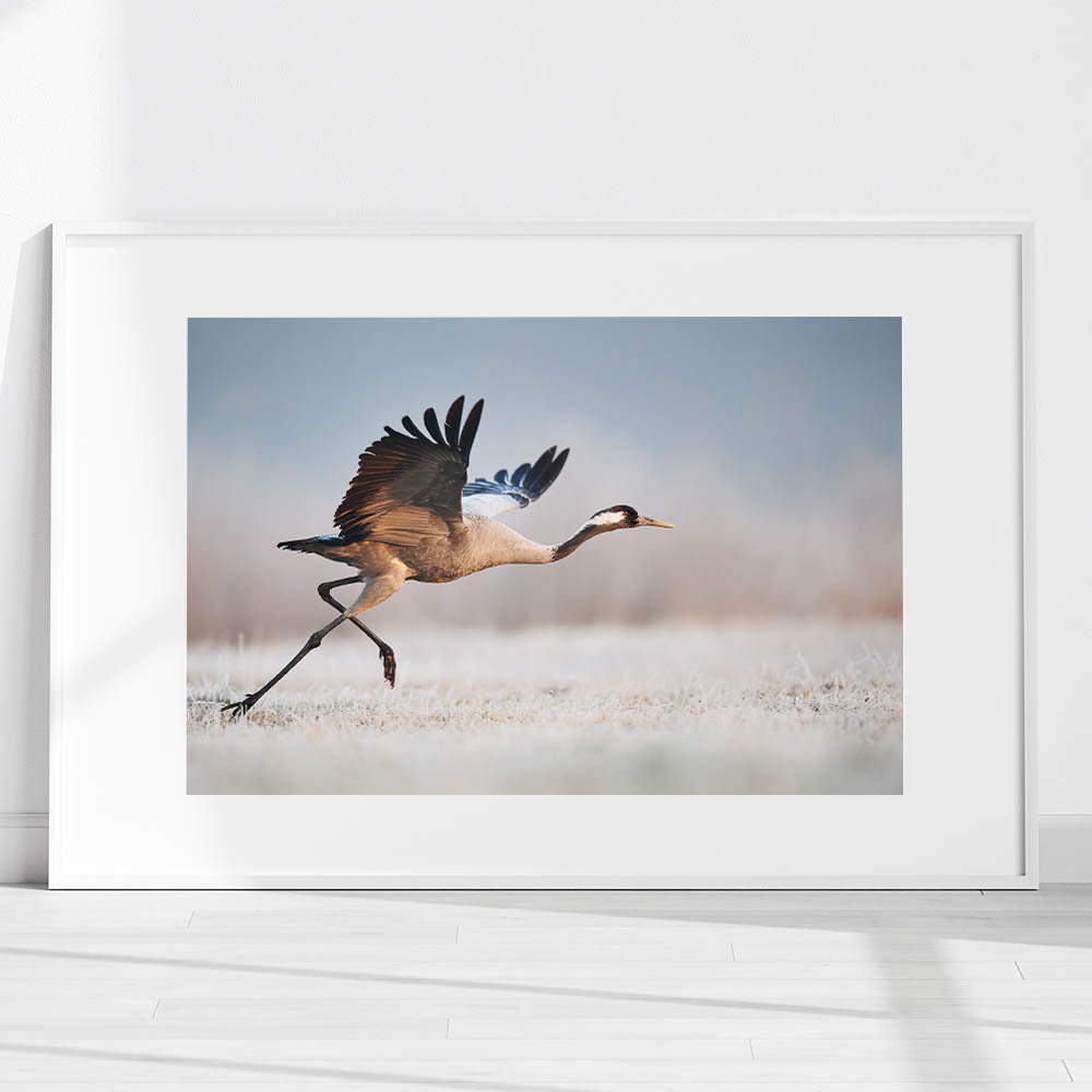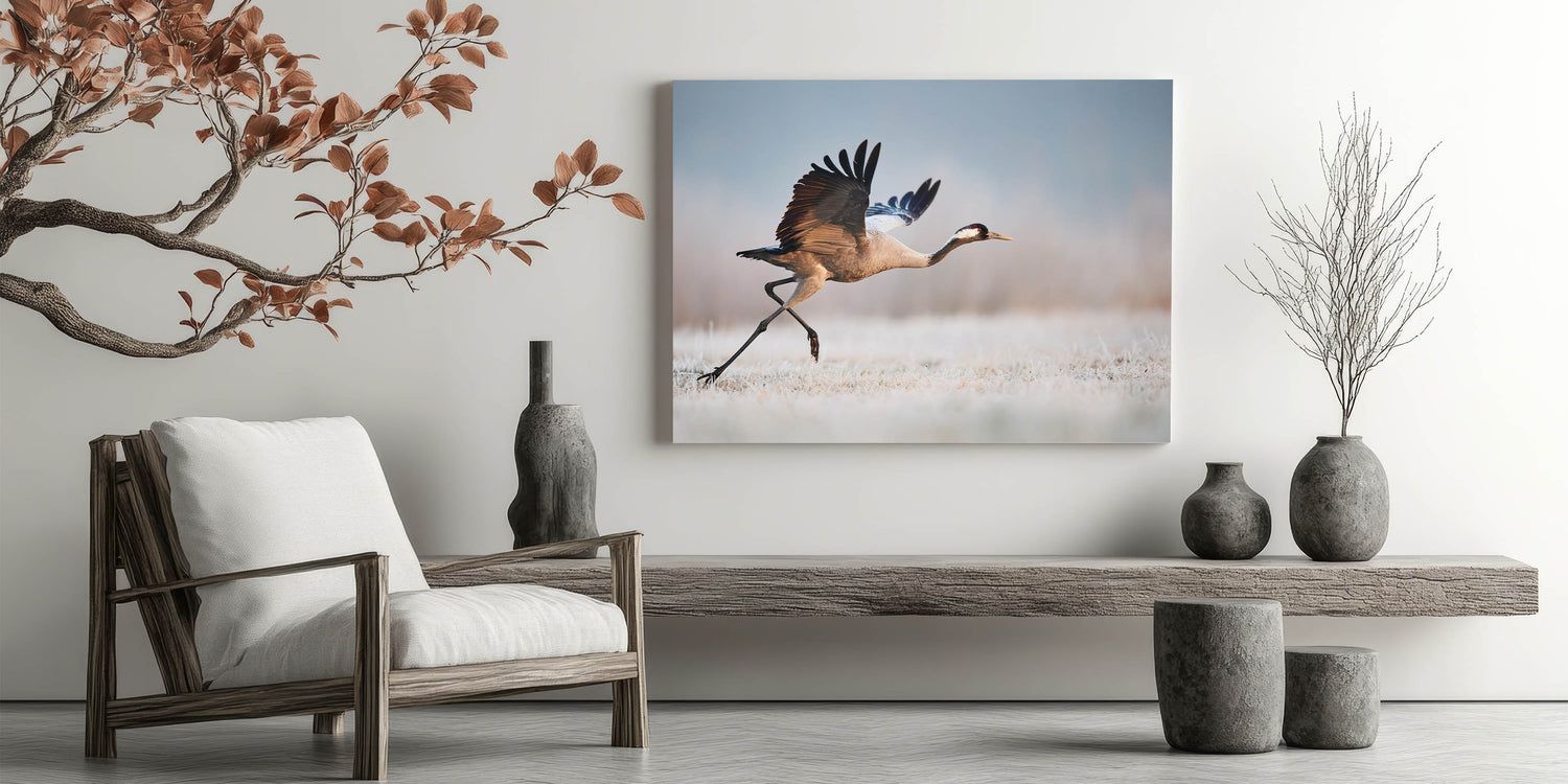 Immerse yourself in the beauty of nature with this stunning wildlife photography wall art featuring a graceful crane in motion. The soft, muted tones of the landscape provide a serene backdrop, highlighting the intricate details of the crane's wings and its poised elegance. Perfect for living rooms, bedrooms, or offices, this artwork brings a sense of calm and natural beauty to any interior.