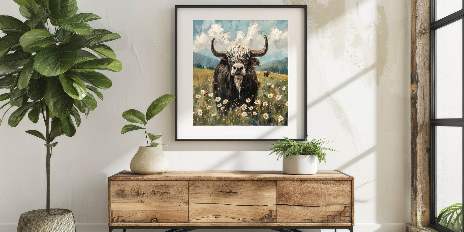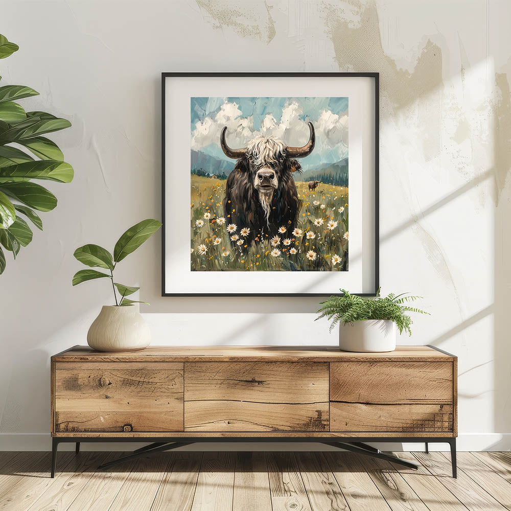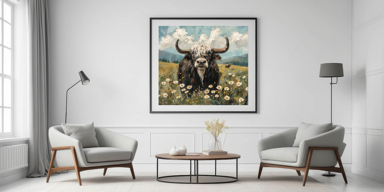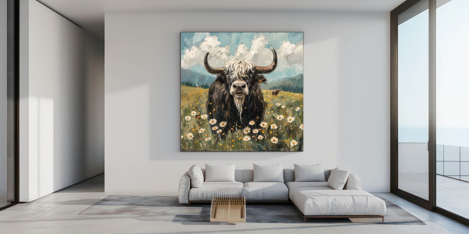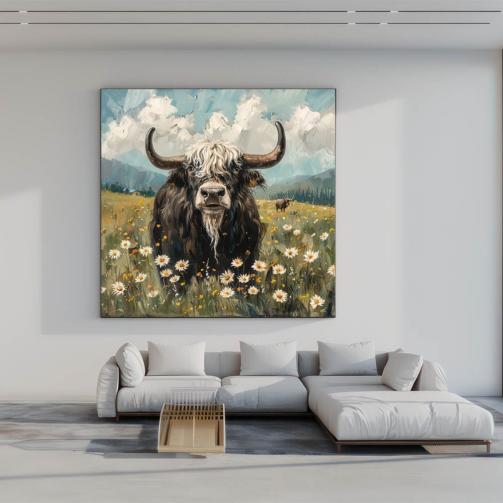 Bring the tranquility of the countryside into your home with this enchanting Highland cow wall art. Depicting a majestic cow standing in a vibrant meadow of daisies with a mountainous backdrop, this oil painting captures the serene beauty of rural life. The detailed brushstrokes and rich textures add depth and personality, making this piece a perfect choice for nature and animal lovers.