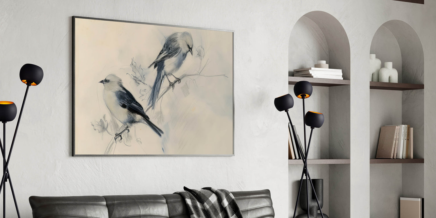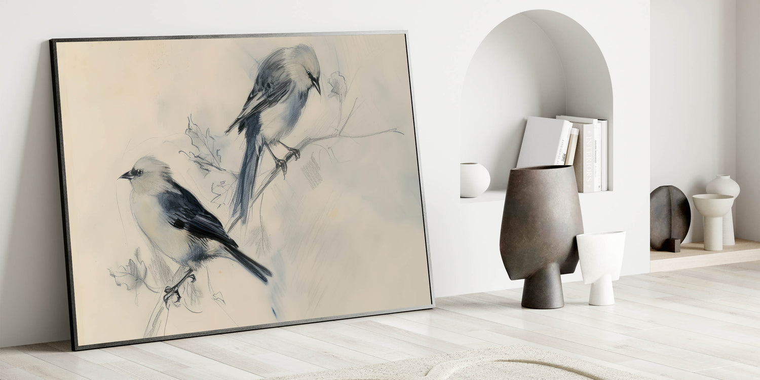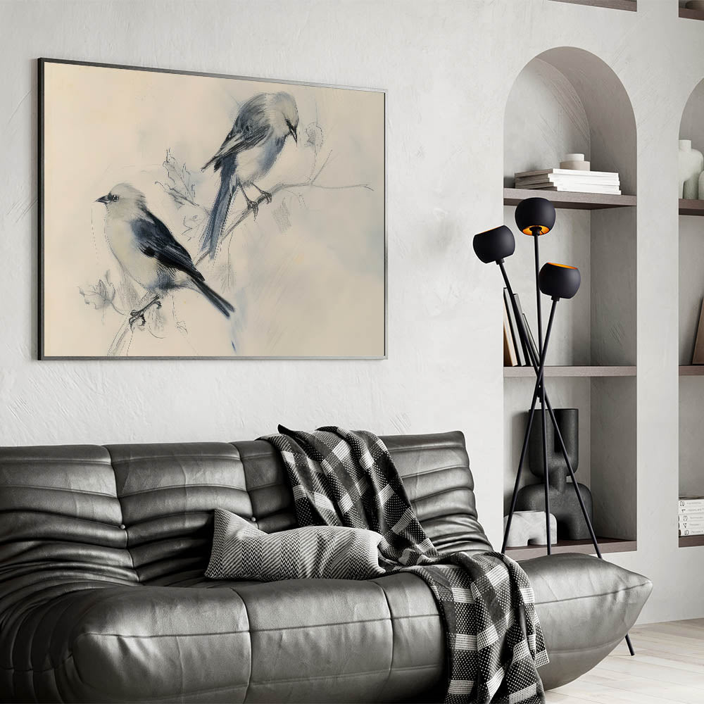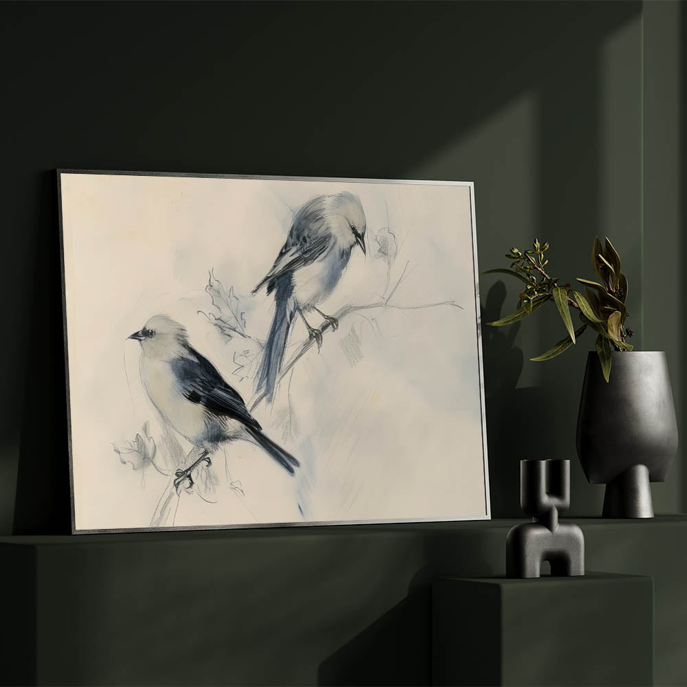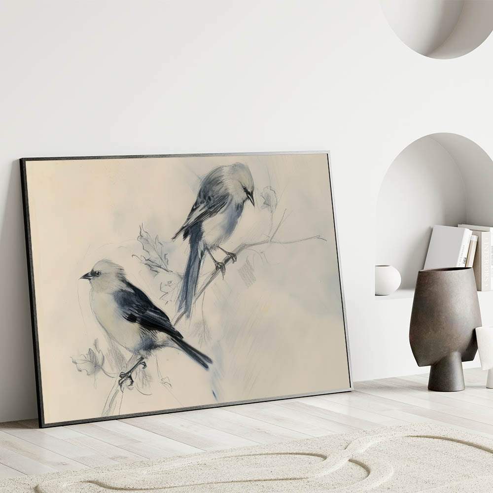 Add a touch of tranquility to your home with this serene songbirds wall art. Featuring two delicately drawn birds perched on a branch, this artwork highlights soft gray and blue tones that evoke a sense of calm and harmony. The minimalist composition is perfect for creating a peaceful ambiance in any space.