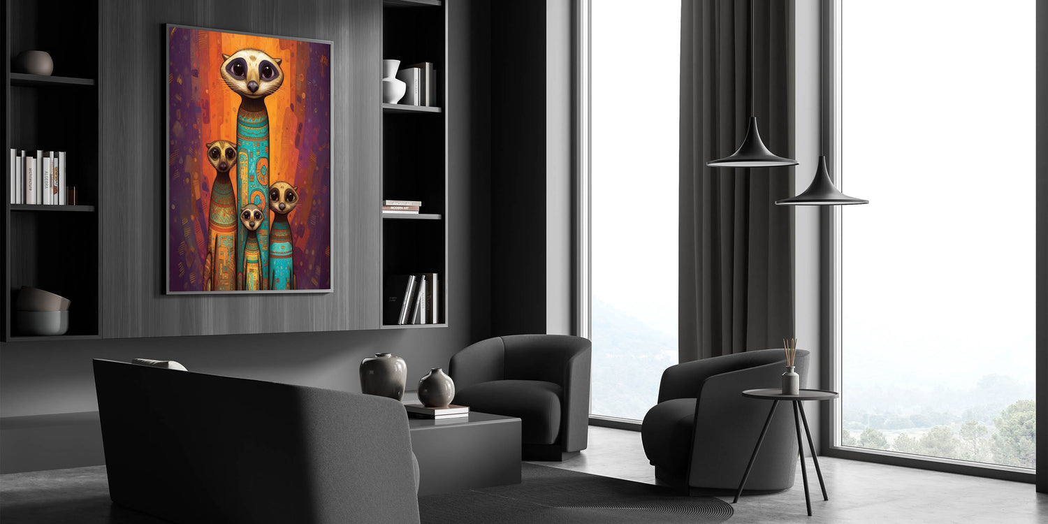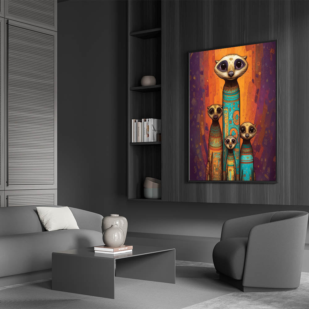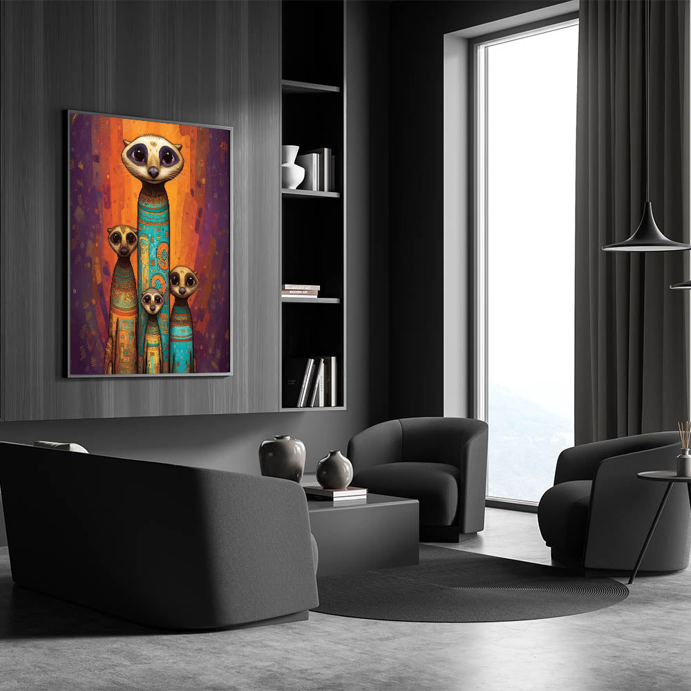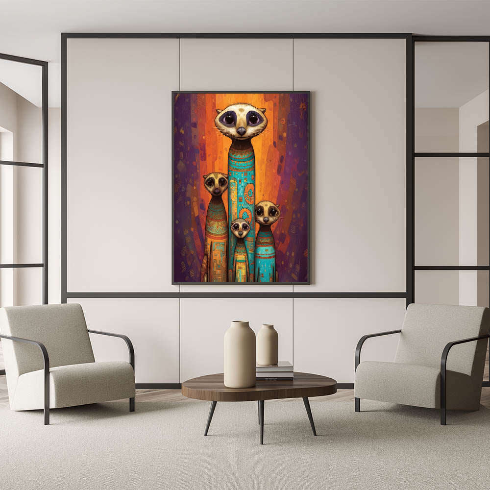 Bring a burst of color and personality to your space with this wildlife painting wall art featuring a charming meerkat family. Adorned with vibrant tribal patterns and a rich color palette of orange, blue, and purple, this artwork is perfect for adding warmth and character to any room. Whether placed in a living room, bedroom, or creative space, it serves as an eye-catching centerpiece that celebrates the playful charm of these fascinating creatures.