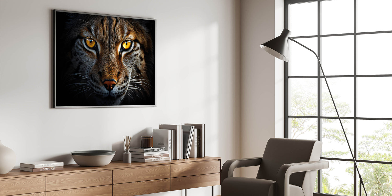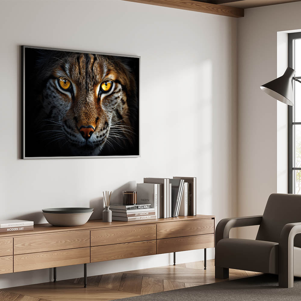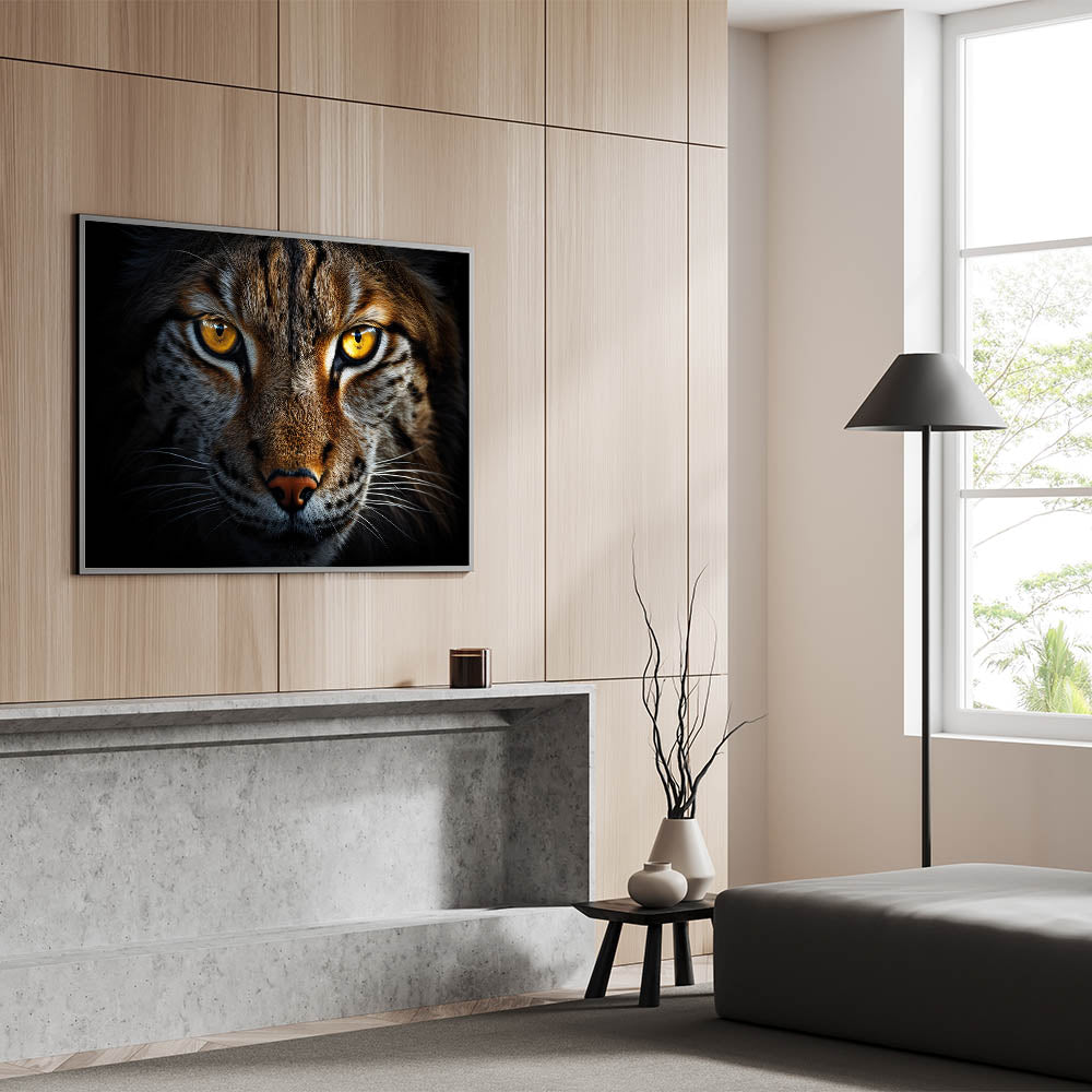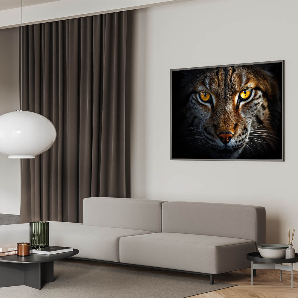 Capture the wild beauty of one of nature’s most majestic creatures with this Animal Wall Art featuring a striking close-up of a lynx. The powerful golden eyes and intricate fur details are presented in sharp, high-definition, making this Wildlife Photography Print a captivating piece for any space. The contrast of the feline’s gaze against the deep black background adds an intense focus, perfect for nature lovers and those looking to add a bold statement piece to their home decor.