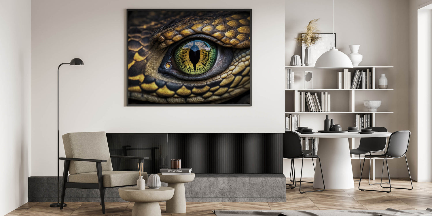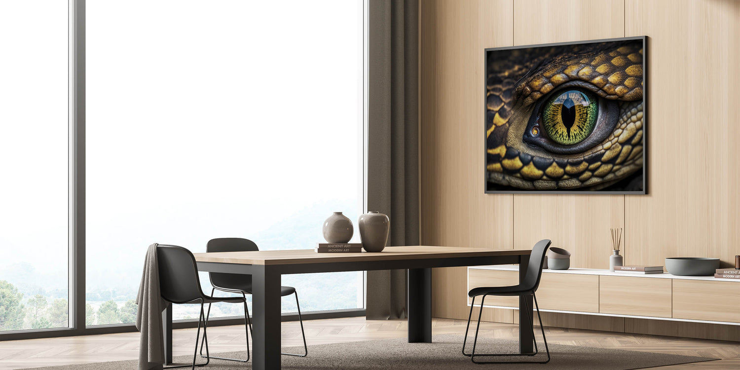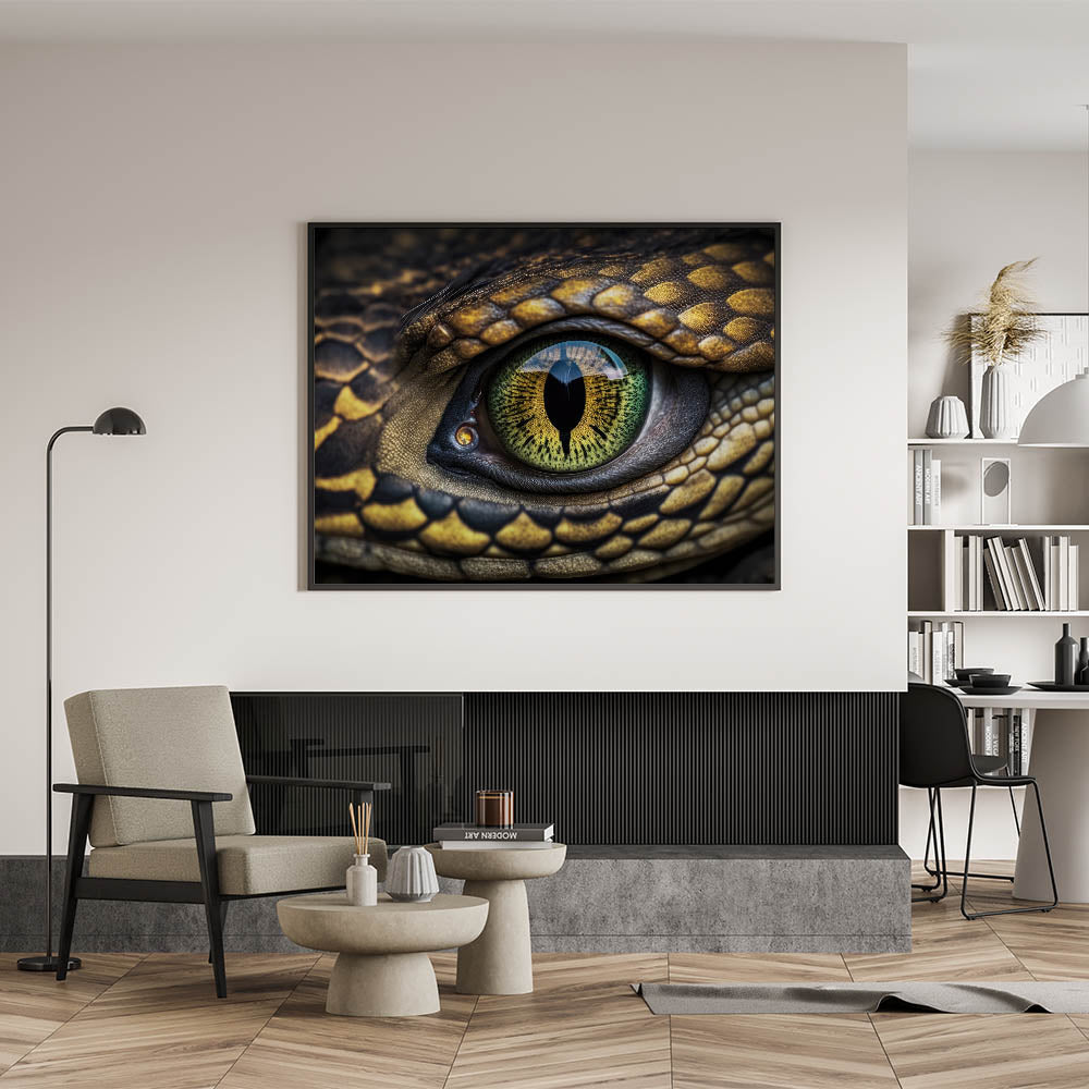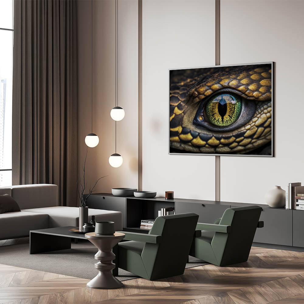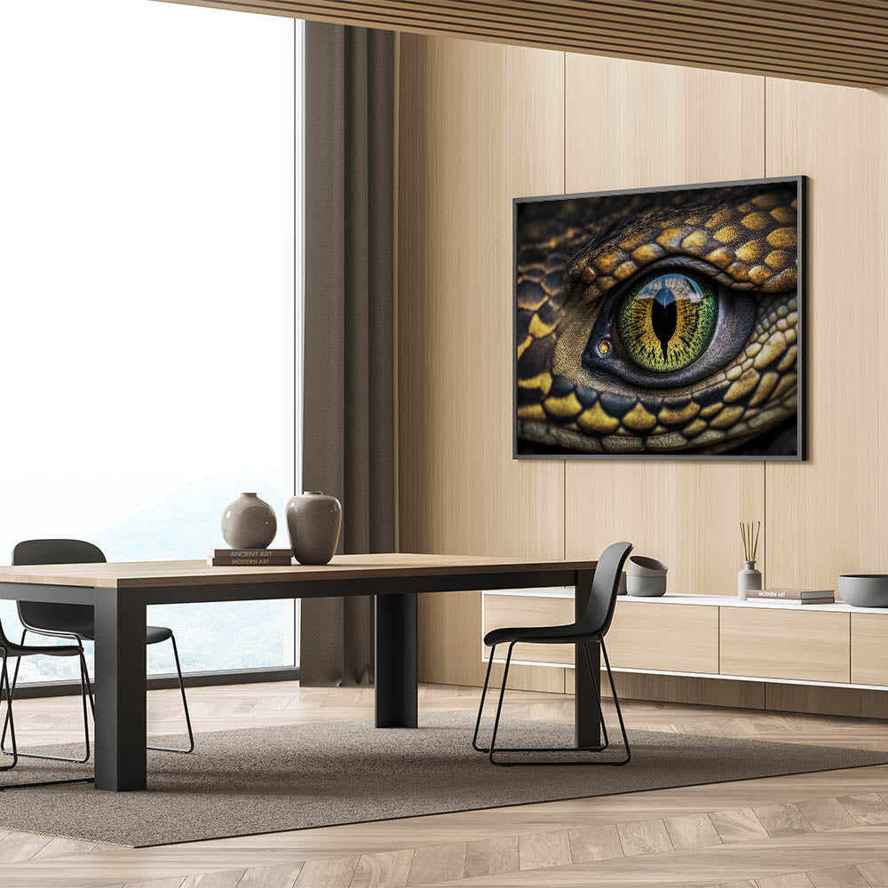 Capture the mystery and beauty of the wild with this Animal Wall Art featuring a dramatic close-up of a snake’s eye. The intricate details of the scales, combined with the mesmerizing depth of the green and yellow eye, create a striking visual experience. This Close-Up Nature Photography offers an intimate glimpse into the natural world, making it an ideal piece for those who appreciate the fine details and elegance of wildlife.