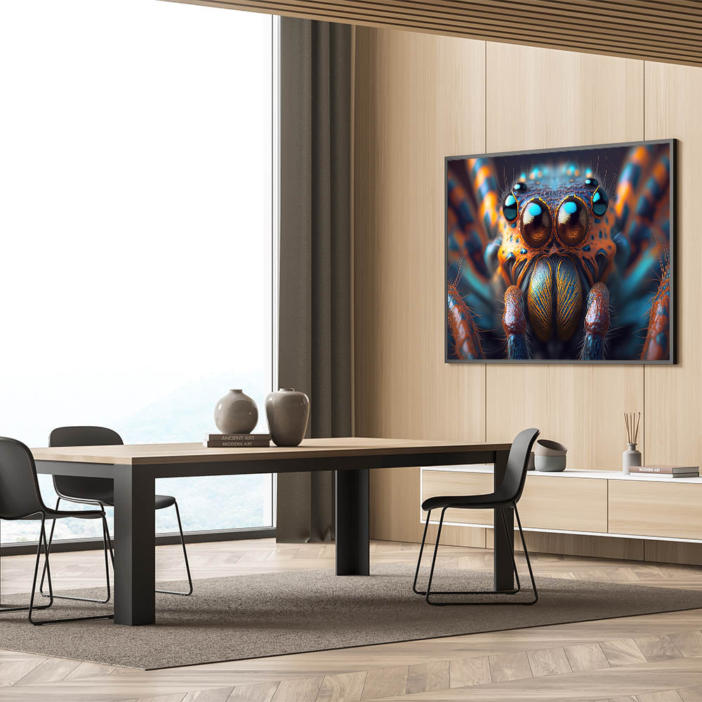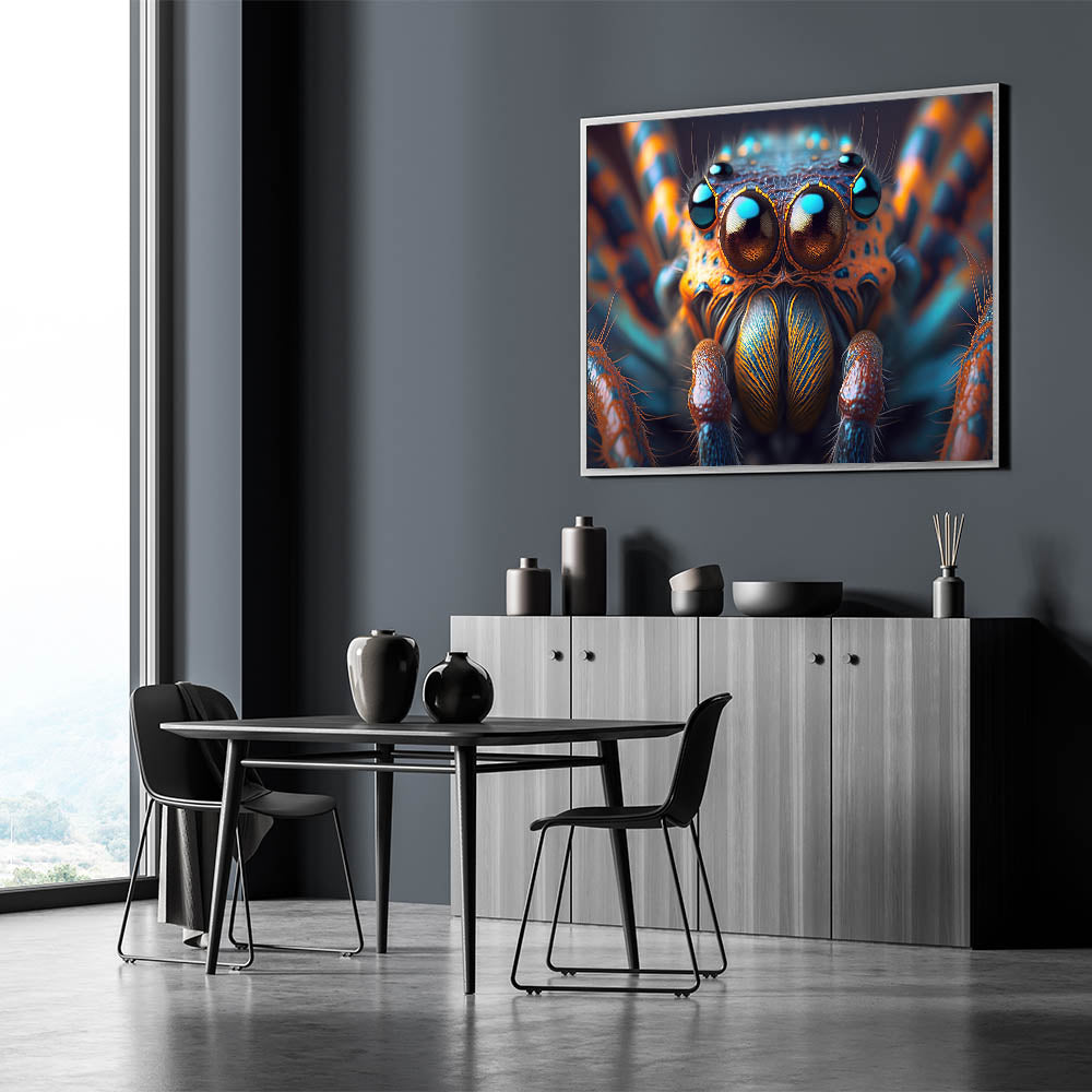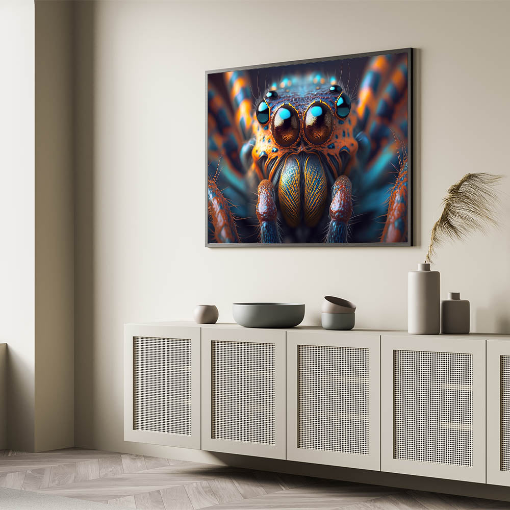 Dive into the fascinating world of macro photography with this stunning Animal Wall Art featuring a close-up of a spider. The intricate details of the spider’s vibrant orange and blue coloring, paired with its large, glossy eyes, make this artwork a mesmerizing piece. The extreme close-up reveals textures and features that are often unseen, making this Close-Up Nature Photography both bold and captivating.