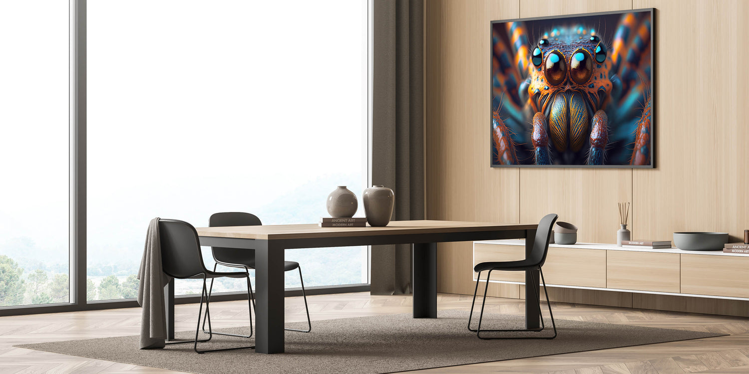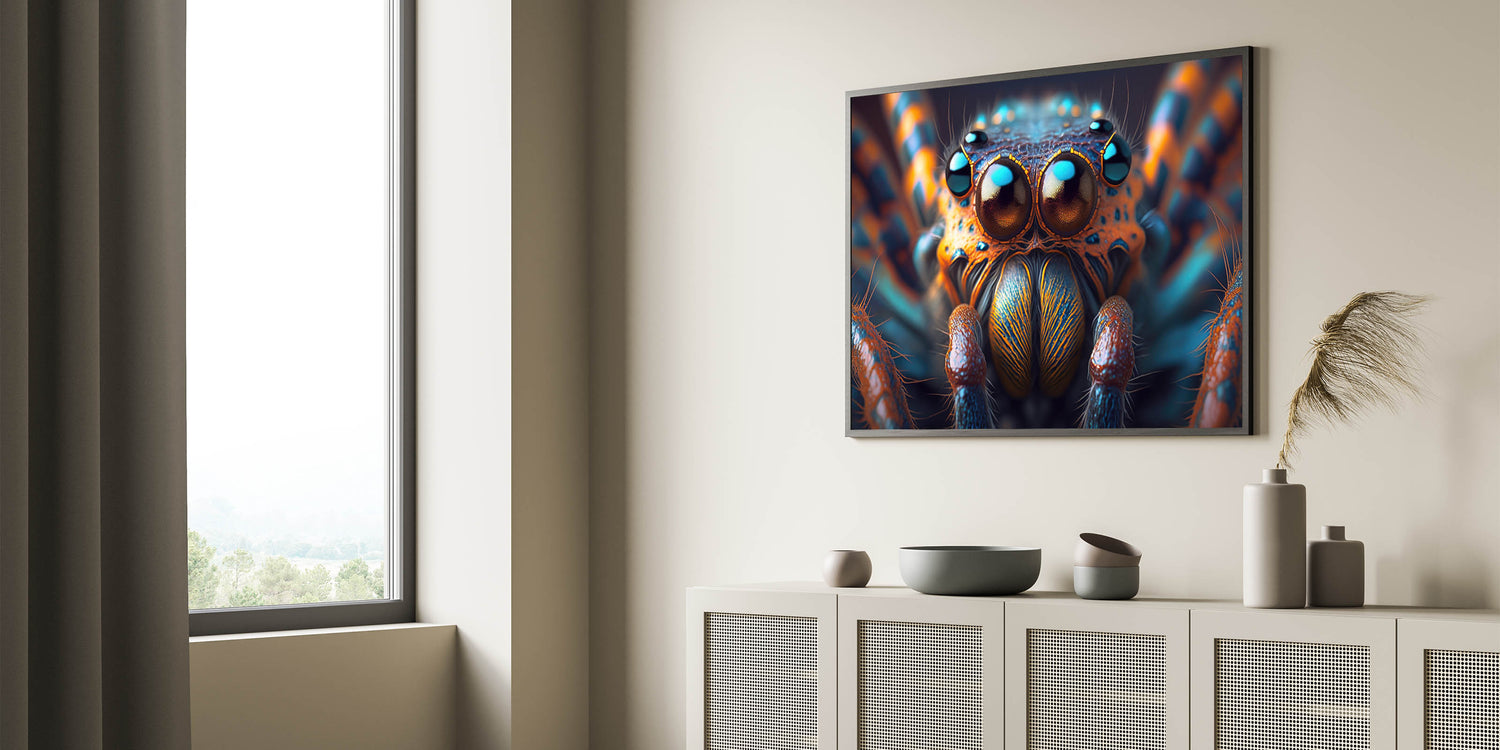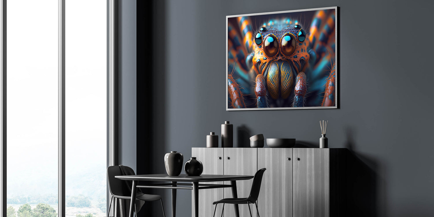 Dive into the fascinating world of macro photography with this stunning Animal Wall Art featuring a close-up of a spider. The intricate details of the spider’s vibrant orange and blue coloring, paired with its large, glossy eyes, make this artwork a mesmerizing piece. The extreme close-up reveals textures and features that are often unseen, making this Close-Up Nature Photography both bold and captivating.