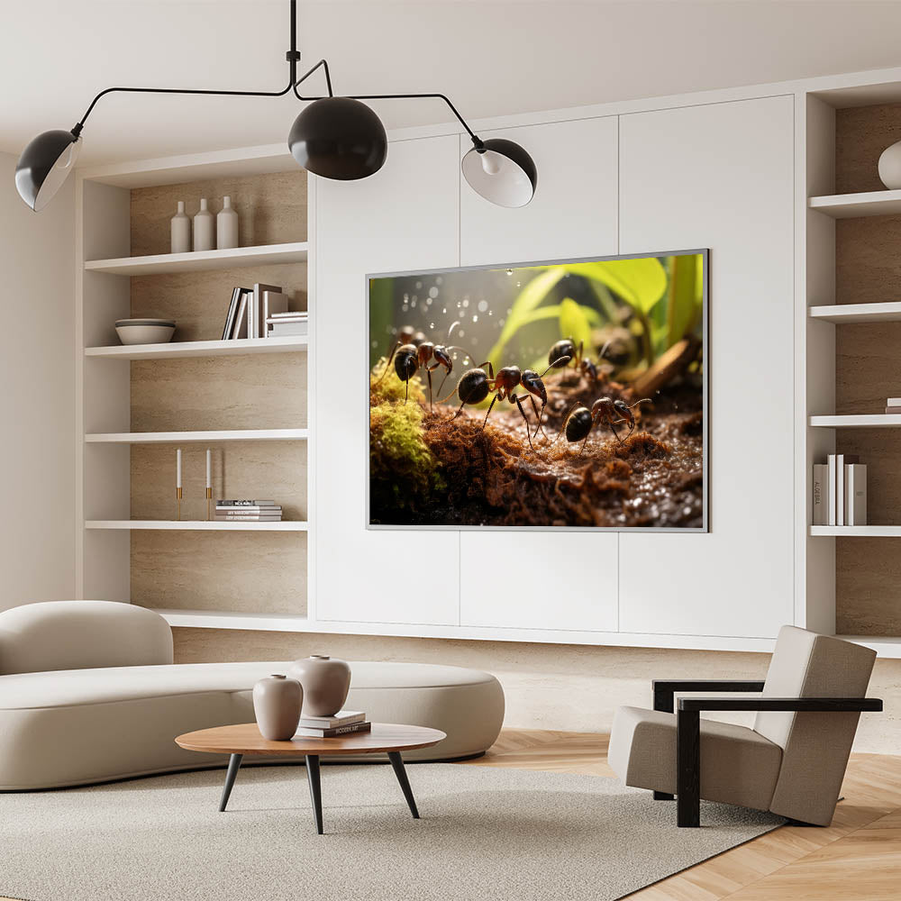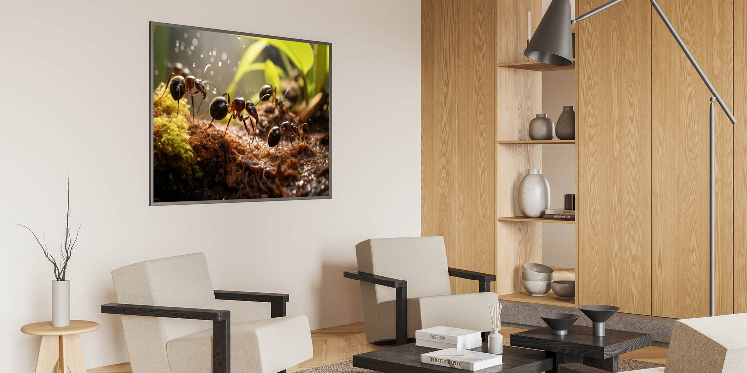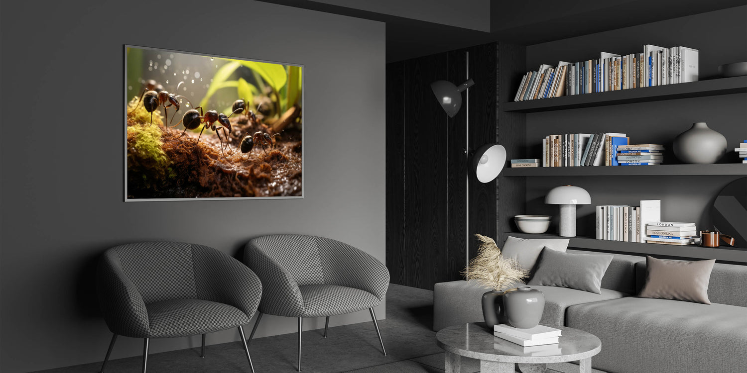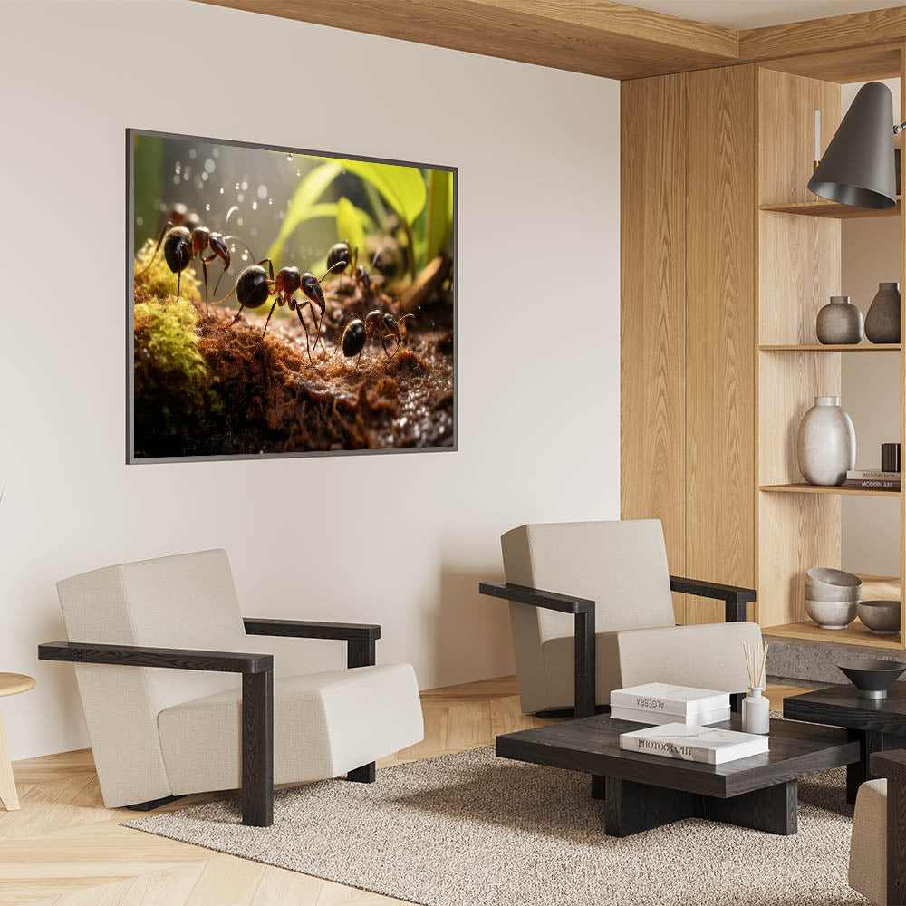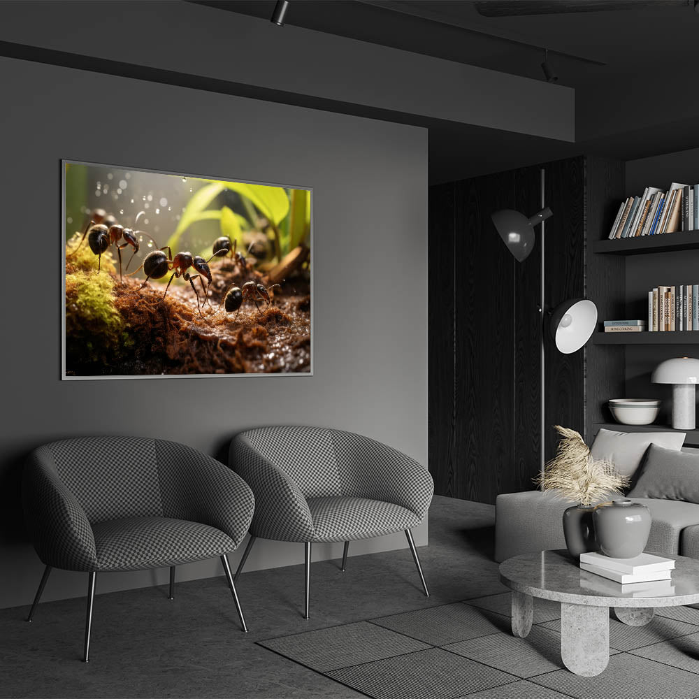 This Ants in Nature Wall Art captures the intricate details of ants in their natural habitat. The close-up shot, featuring dew drops glistening on the earth and the ants working diligently, provides a stunning glimpse into the world of these small but fascinating creatures. Perfect for nature lovers and those who appreciate the beauty of wildlife, this Wildlife Photography Print will bring a fresh, nature-inspired touch to your home décor.