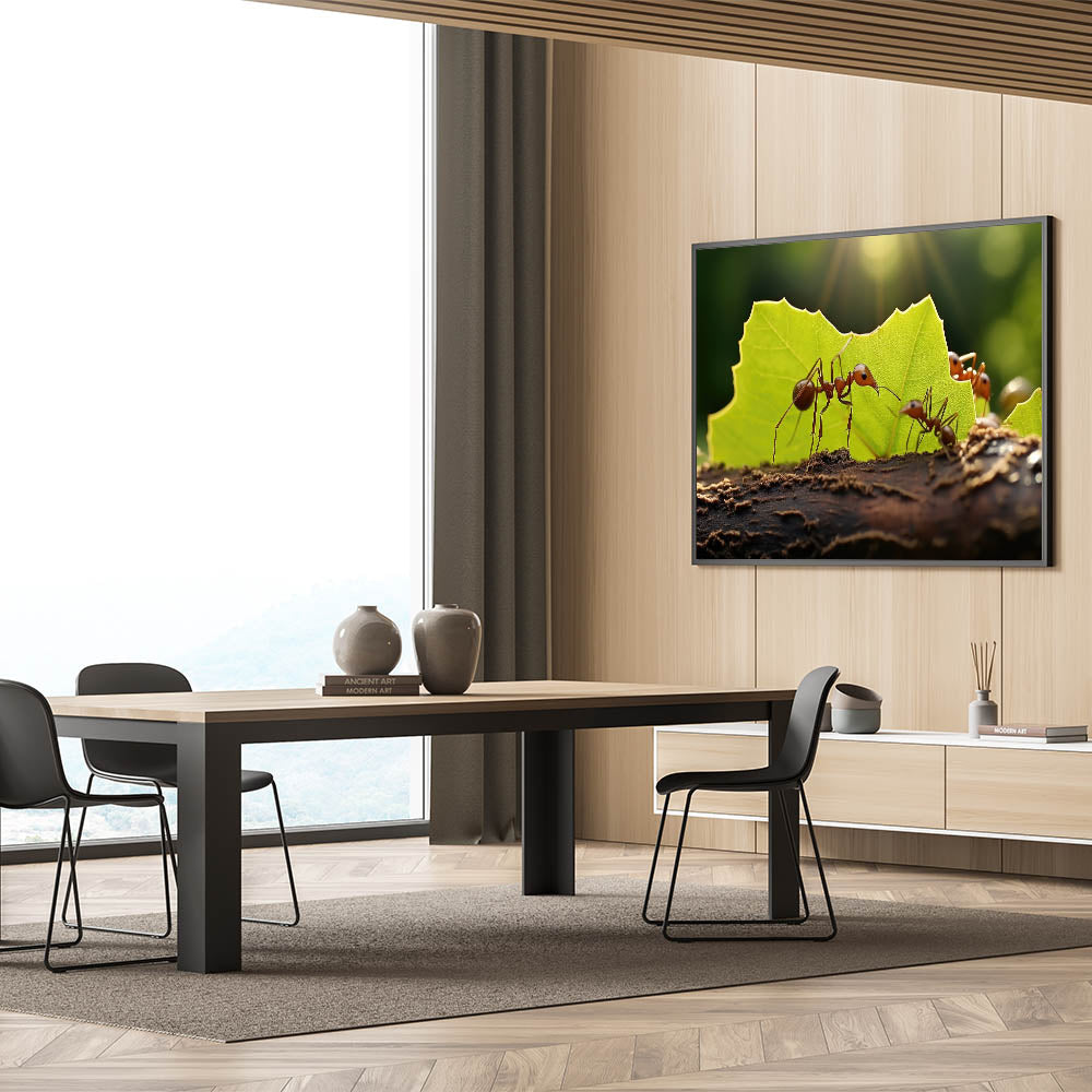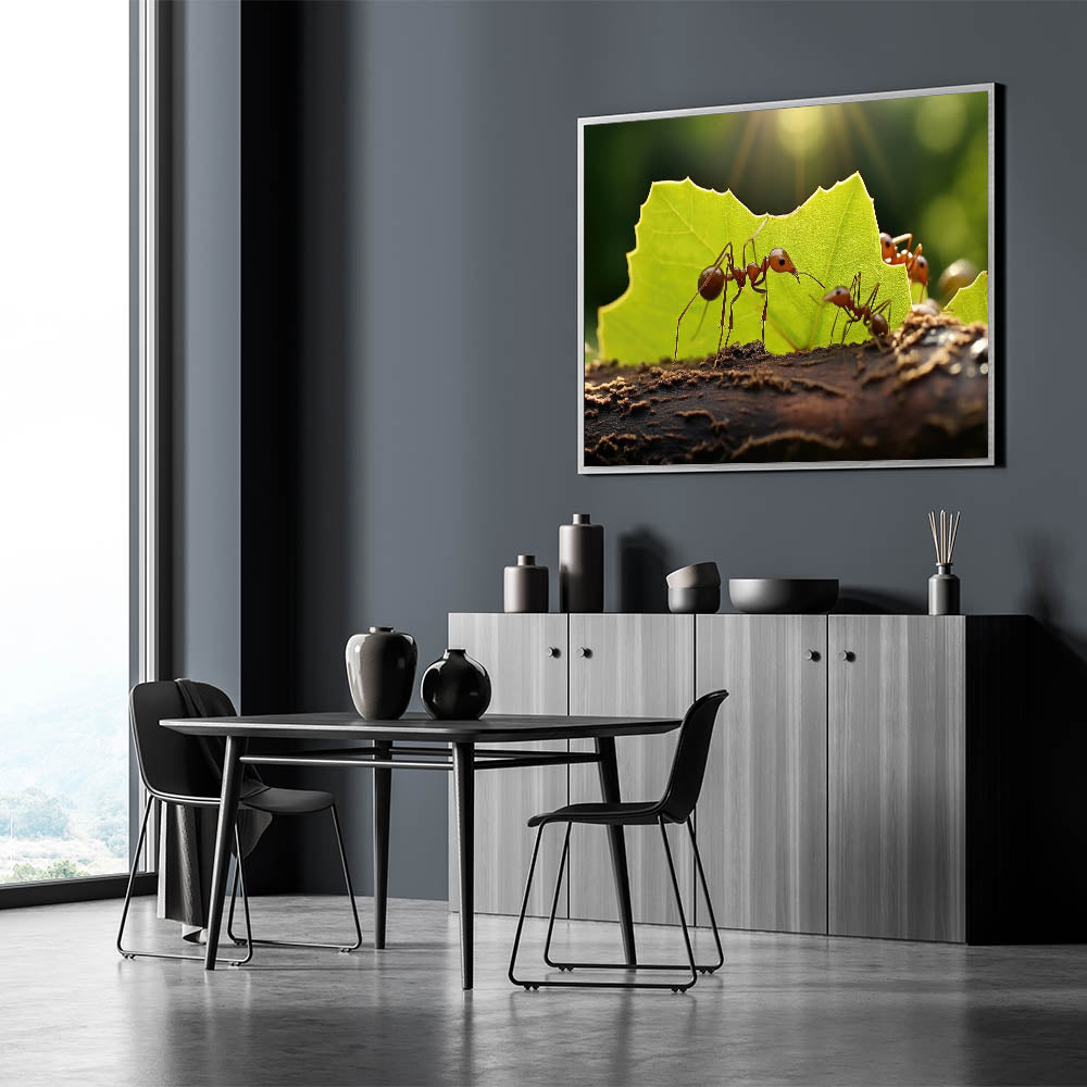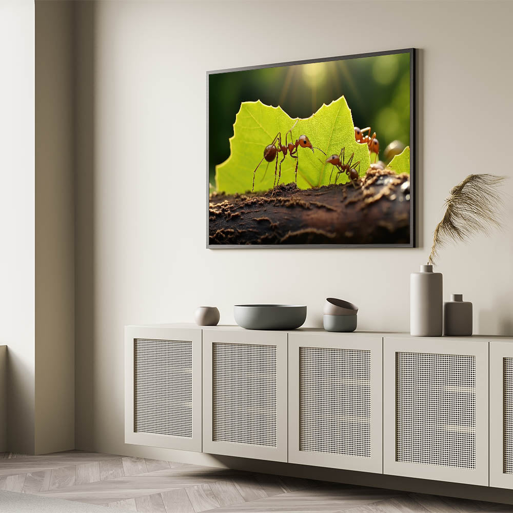 This Ants Teamwork Close-Up Wall Art beautifully captures the intricate world of nature’s tiny creatures. The image showcases ants working together to carry a leaf, illuminated by the soft glow of sunlight filtering through the greenery. This Wildlife Photography Print is a perfect addition for those who appreciate the small yet significant moments in nature. Whether you're decorating a home or office, this art piece adds a peaceful, nature-inspired touch to any space.