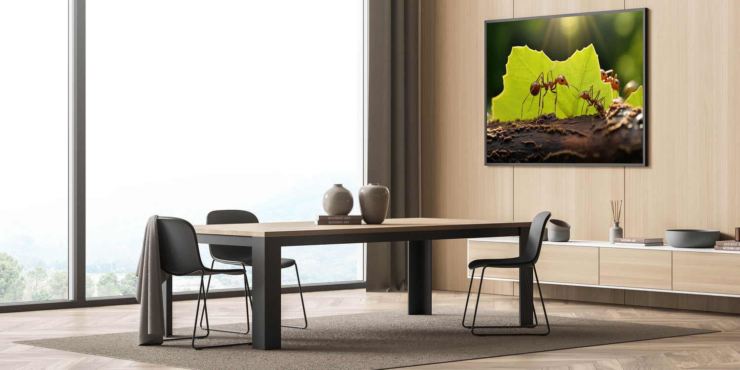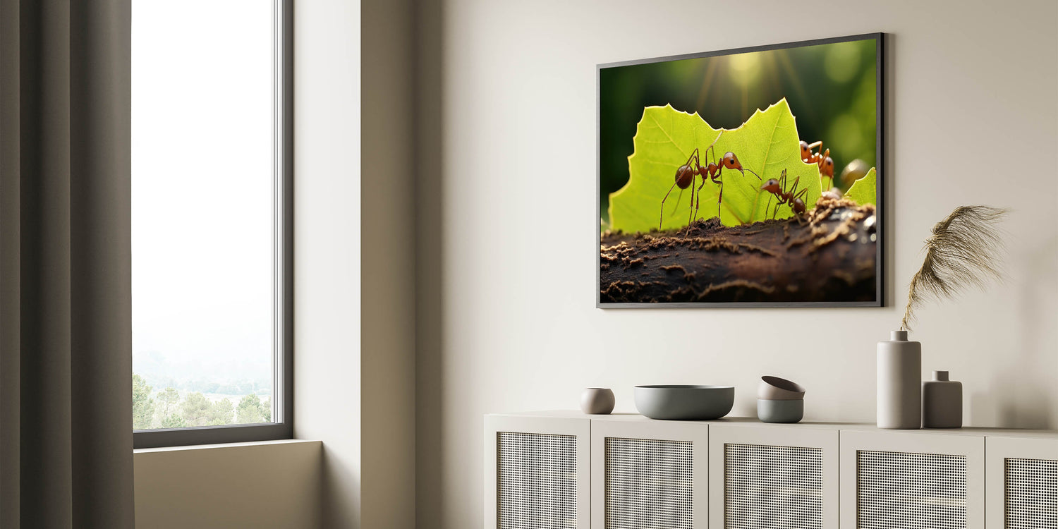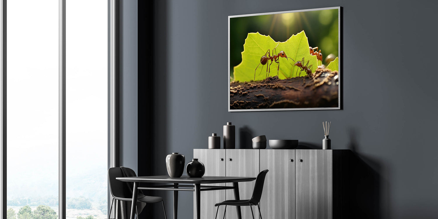 This Ants Teamwork Close-Up Wall Art beautifully captures the intricate world of nature’s tiny creatures. The image showcases ants working together to carry a leaf, illuminated by the soft glow of sunlight filtering through the greenery. This Wildlife Photography Print is a perfect addition for those who appreciate the small yet significant moments in nature. Whether you're decorating a home or office, this art piece adds a peaceful, nature-inspired touch to any space.