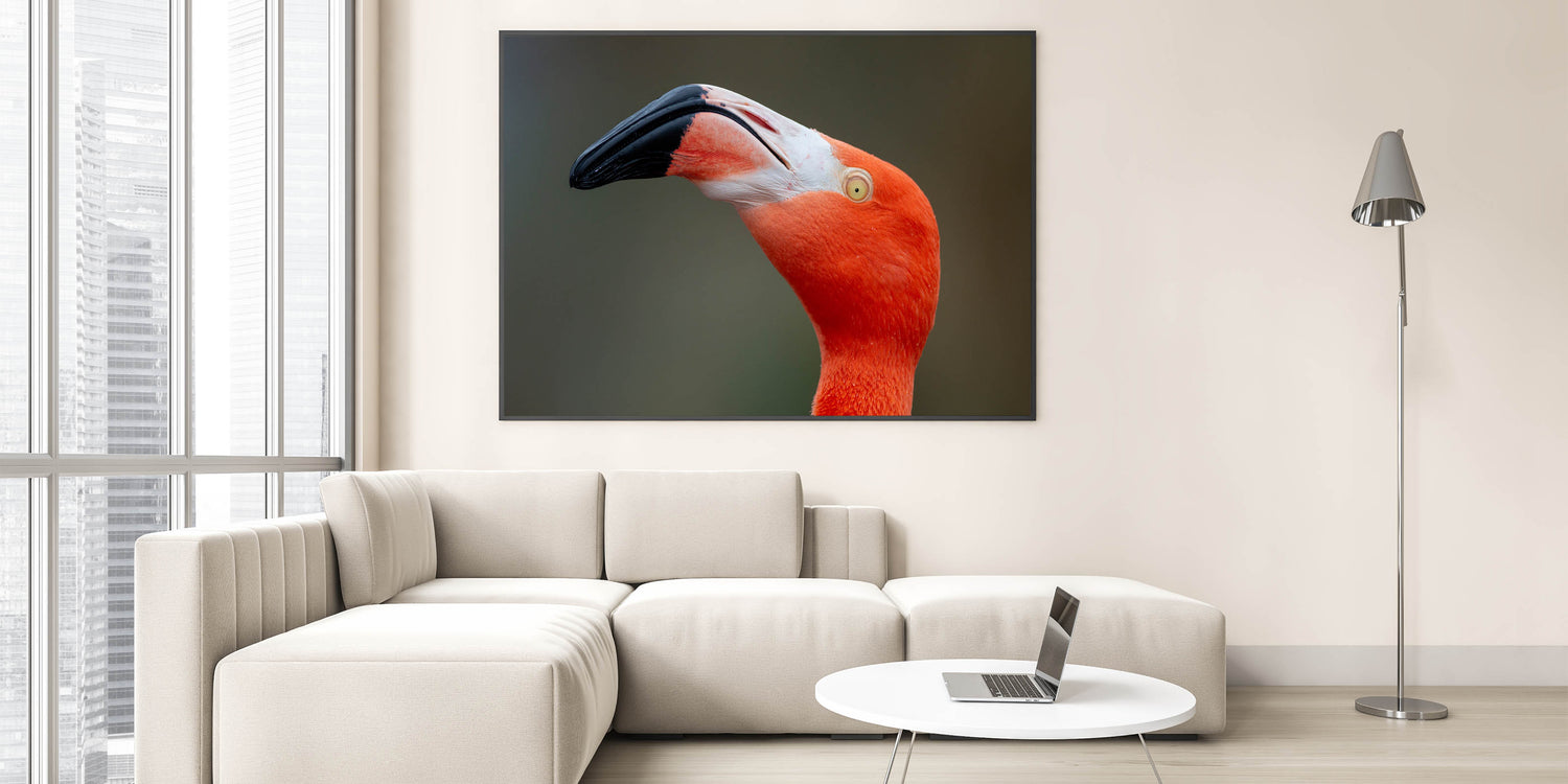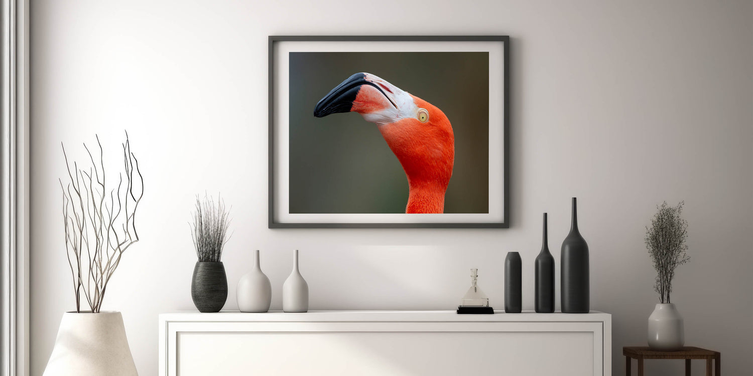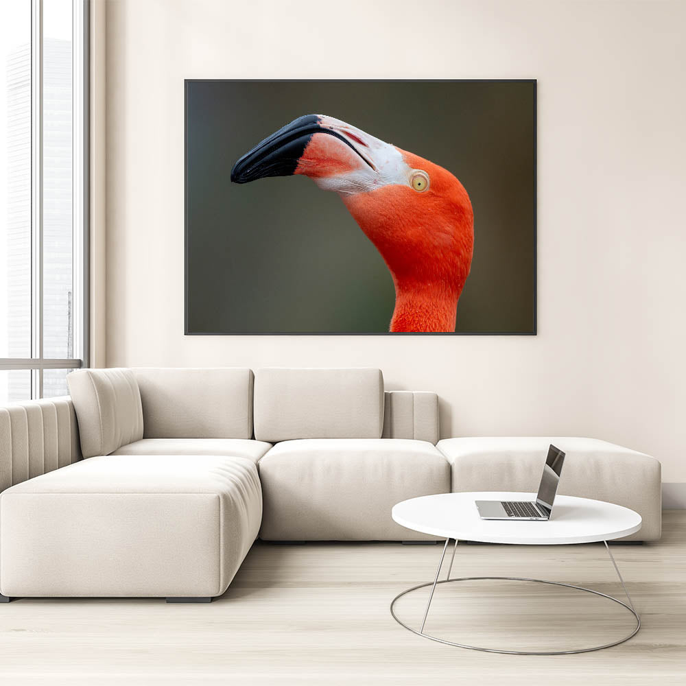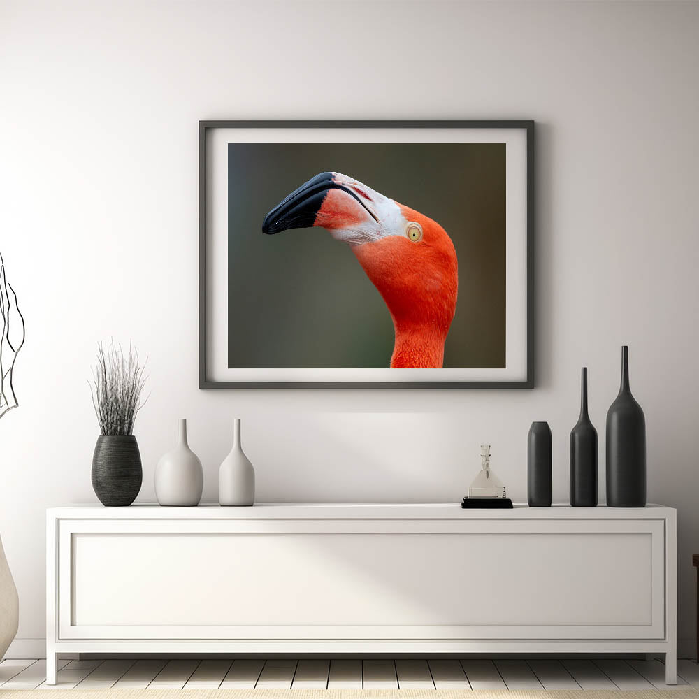 Add a burst of color and elegance to your space with this stunning Bird Art Print featuring a close-up of a flamingo. The vibrant red-orange feathers and sharp black beak contrast beautifully against the soft background, creating an eye-catching piece of Nature-Inspired Wall Art. This Detailed Animal Art captures the grace and striking appearance of this iconic bird, making it the perfect choice for bird enthusiasts and nature lovers.