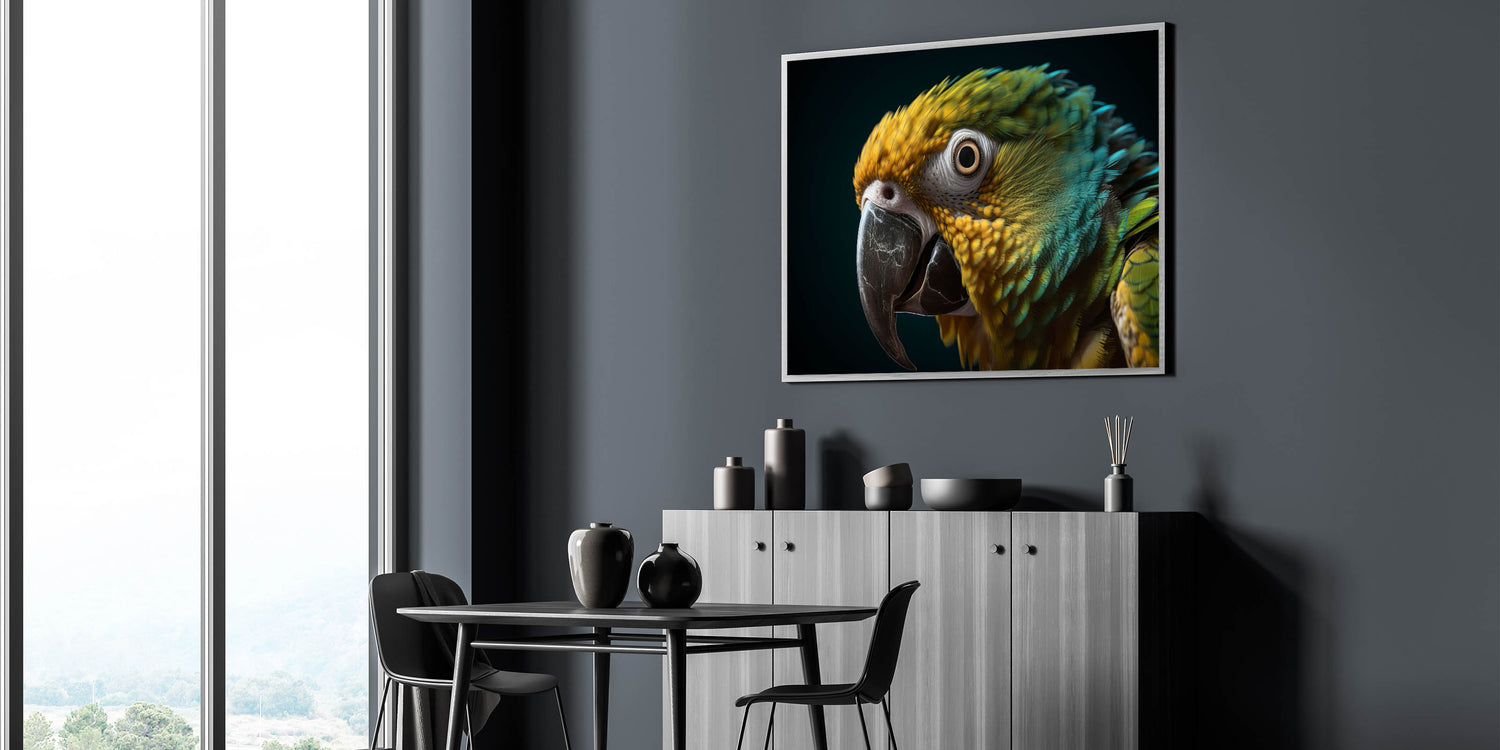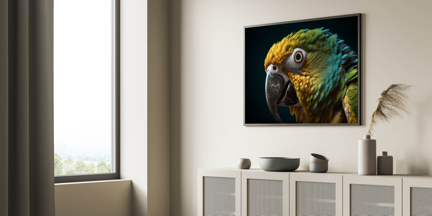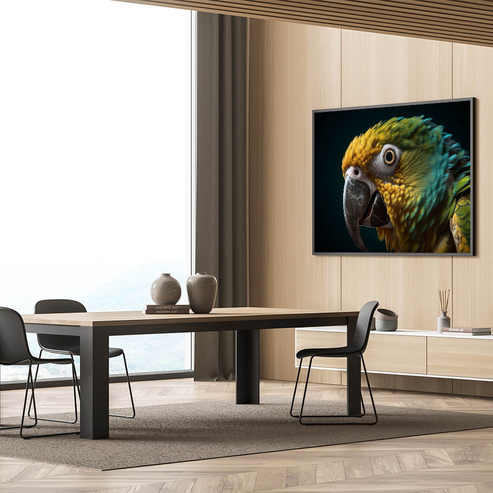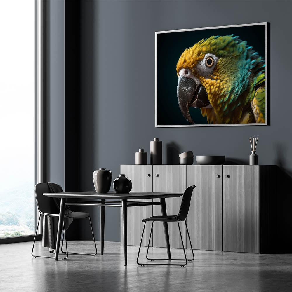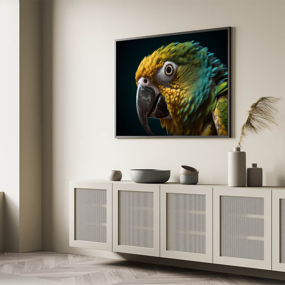 Bring a burst of color and nature into your space with this Vibrant Parrot Bird Art Print. Featuring a stunning close-up of a parrot's intricate feathers and striking beak, this print highlights the bird's vibrant yellow, green, and teal tones. This high-quality Wildlife Photography Print is ideal for bird lovers or anyone looking to add a tropical touch to their home or office.