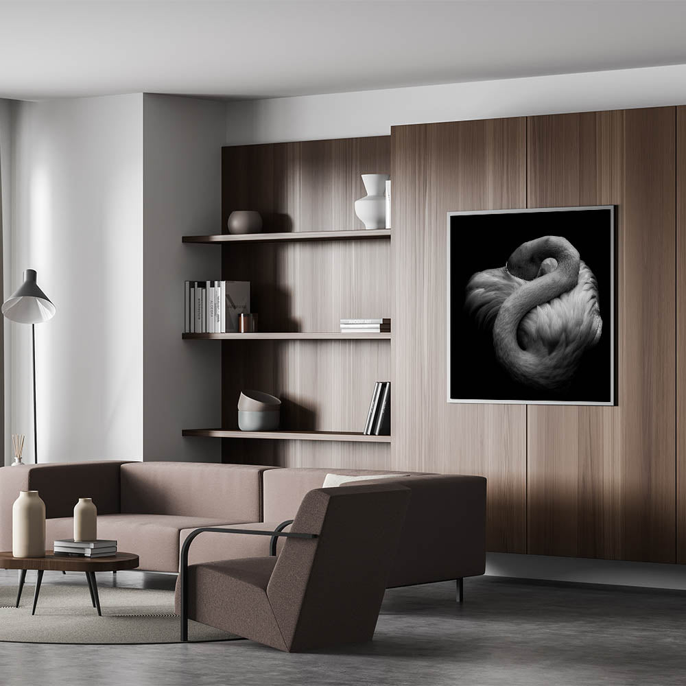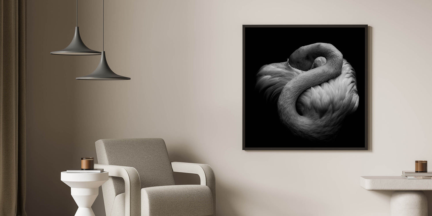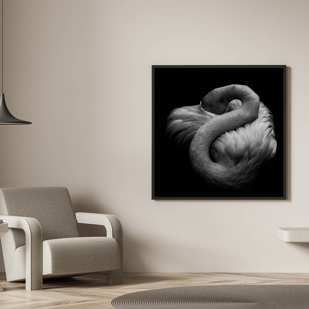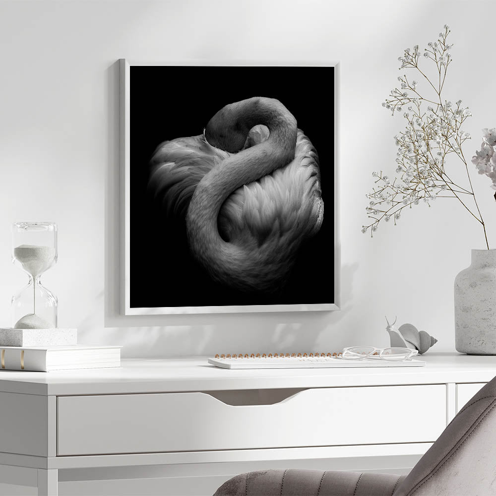 Elevate your space with the serene beauty of this Black and White Flamingo wall art. This minimalist piece captures the elegant form of a flamingo, curled in peaceful rest, rendered in stunning monochrome. The simplicity of the black background paired with the intricate detailing of the flamingo’s feathers creates a powerful and tranquil visual impact, perfect for those who appreciate minimalist and contemporary art.