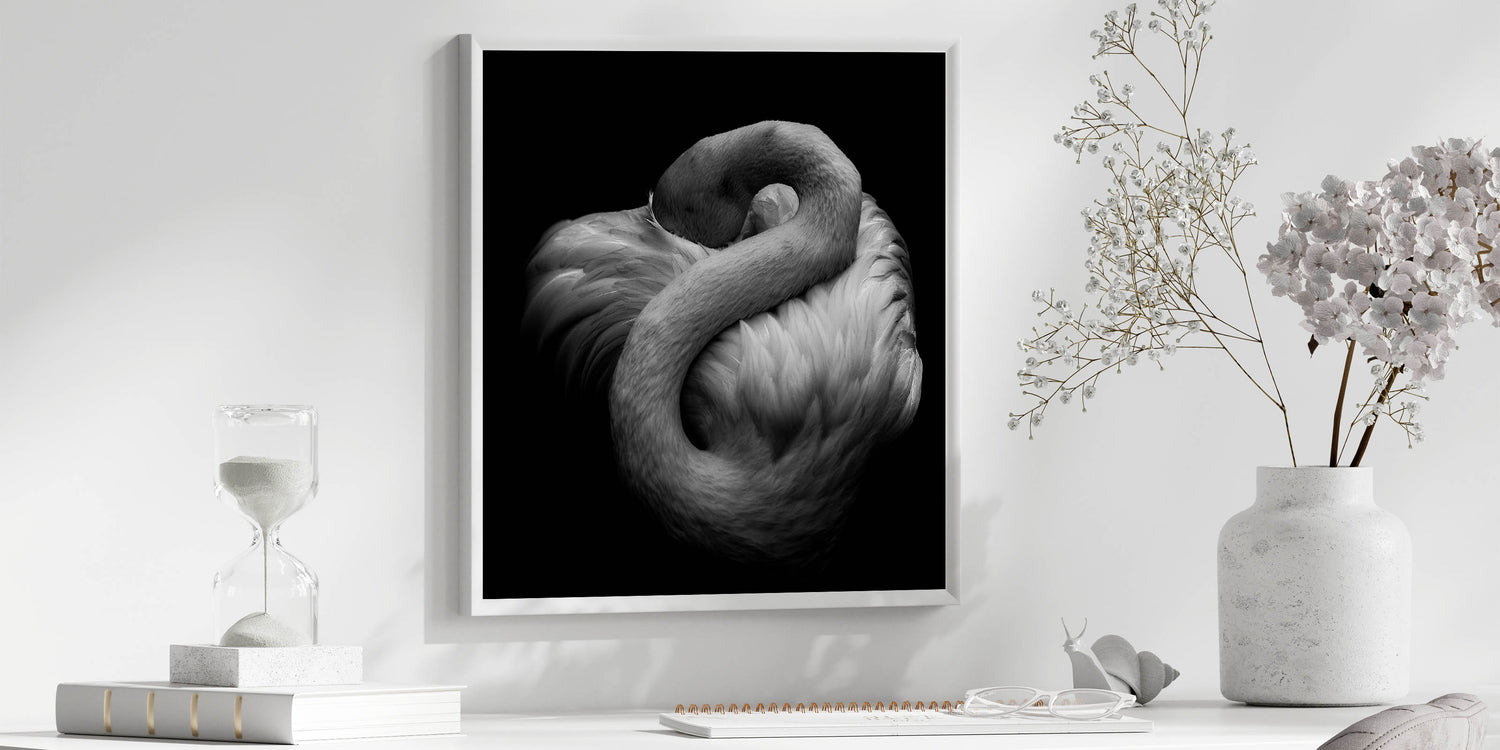 This Flamingo art print is perfect for those who appreciate the subtlety and sophistication of black and white photography. Its calm and reflective mood will add a touch of elegance and serenity to any room, making it a timeless addition to your art collection.