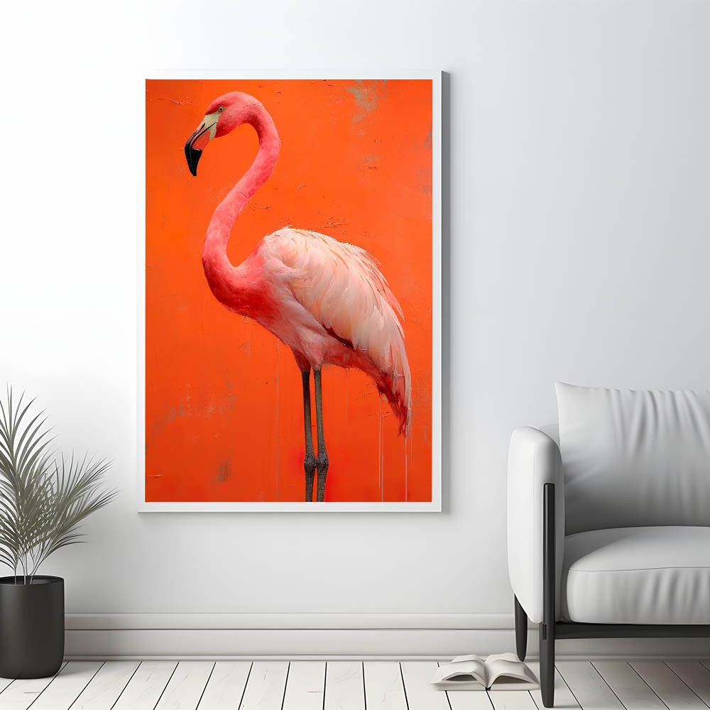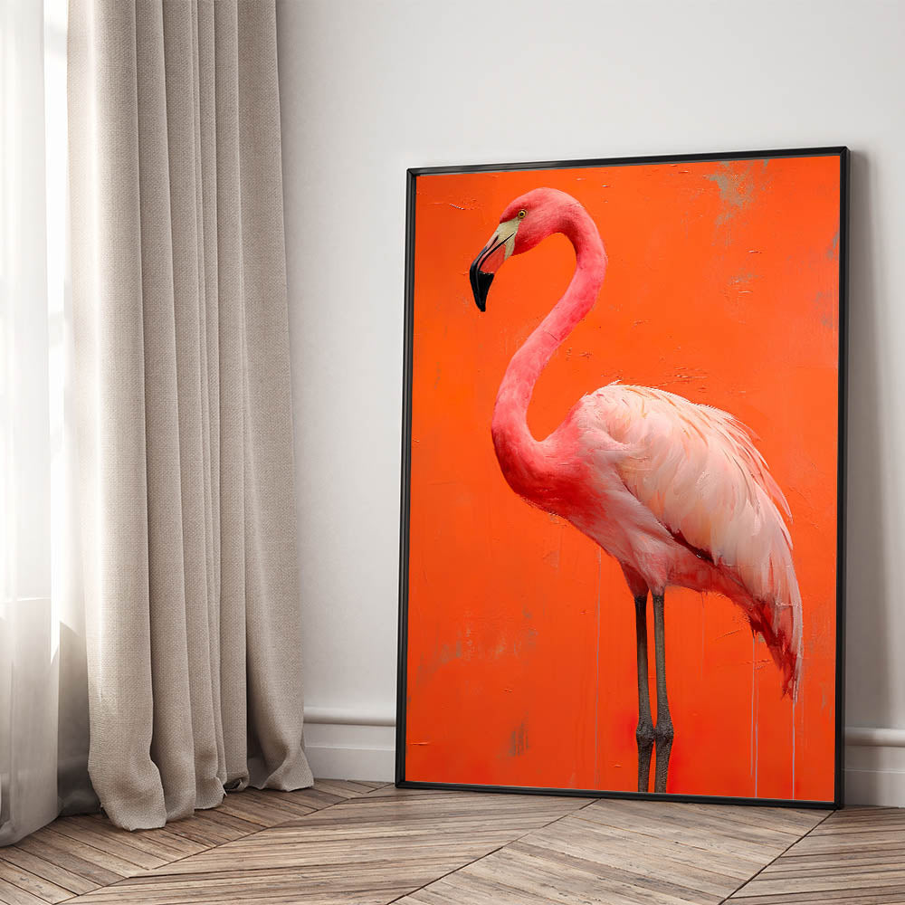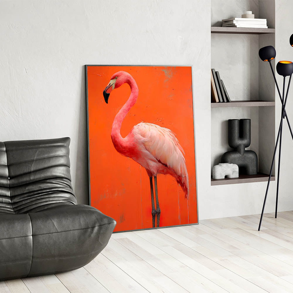 Make a bold statement in your home with this eye-catching Flamingo wall art. Featuring a vibrant flamingo set against a striking orange background, this artwork combines the natural elegance of the bird with a modern, artistic flair. The intense contrast between the pink and orange tones creates a dynamic visual impact, making this piece perfect for those who appreciate bold and contemporary design.