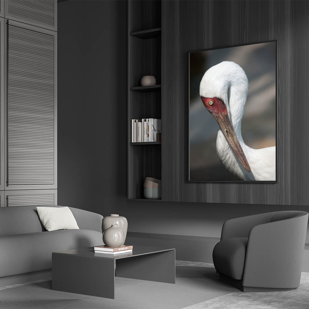 Bring the refined beauty of nature into your space with this stunning close-up of a majestic crane. The detailed portrait captures the crane's striking features, from its piercing eye to the elegant curve of its neck. This artwork is a perfect centerpiece for those who appreciate wildlife and want to add a touch of sophistication to their decor.