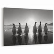 Capture the serene beauty of the Arctic with this stunning monochrome penguin silhouette wall art. This elegant piece portrays a group of penguins standing against the backdrop of a majestic sunrise over a frozen landscape. The black and white palette emphasizes the contrast between the penguins and their icy surroundings, creating a visually striking composition that is both minimalist and captivating.