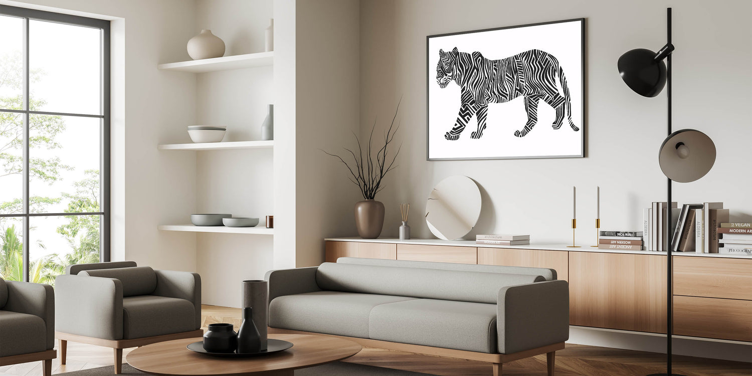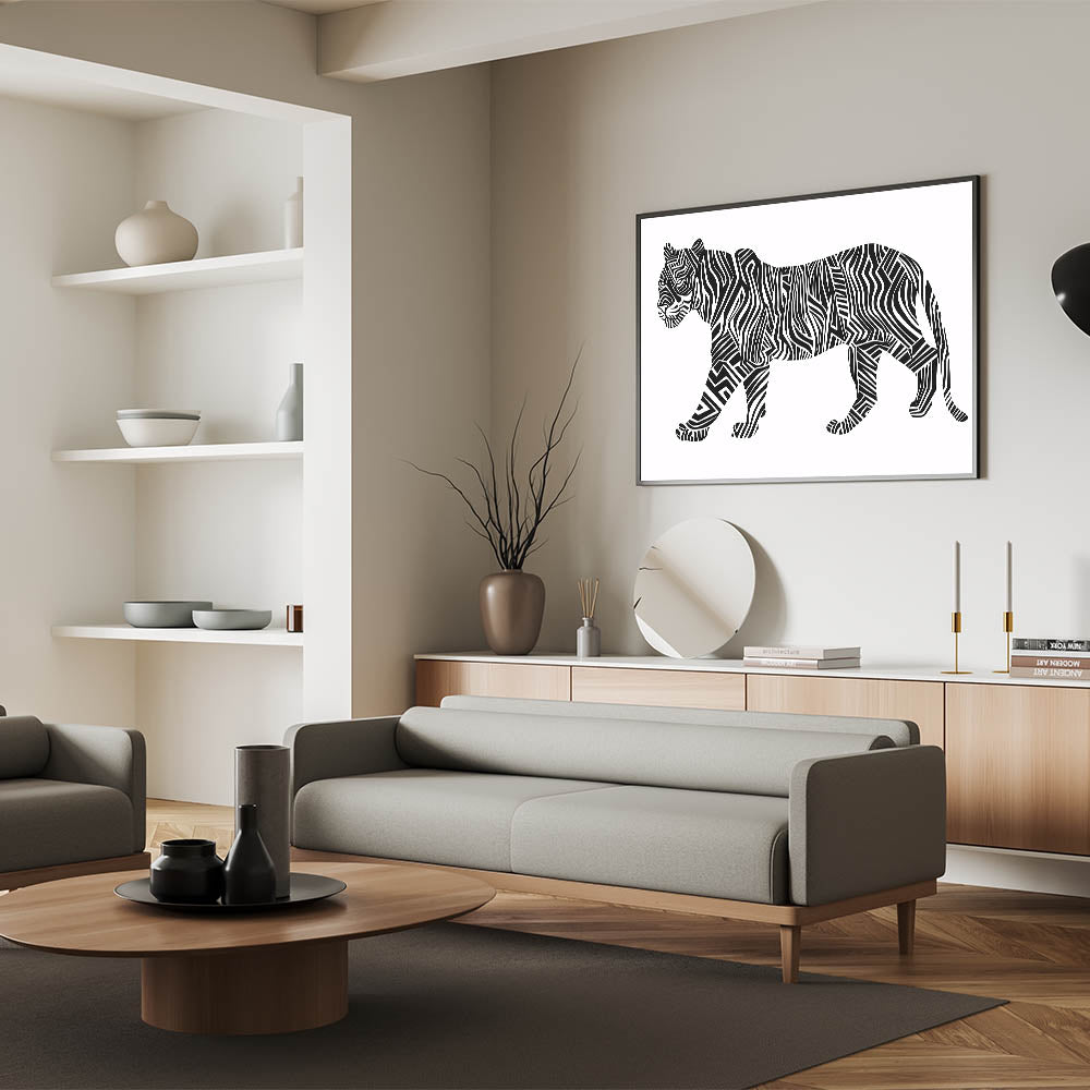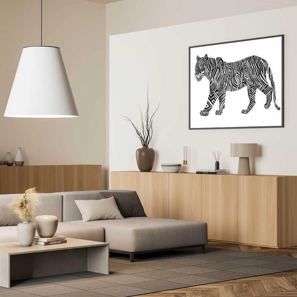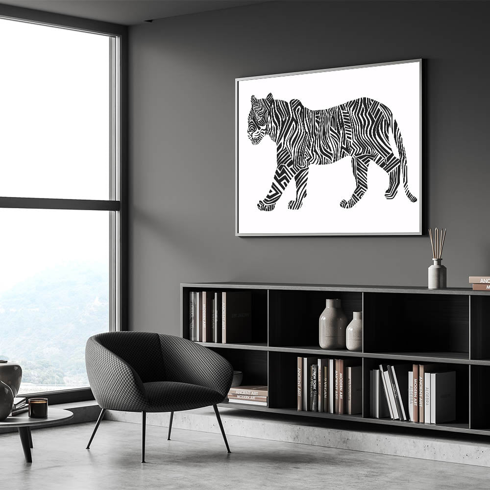 Add a bold touch of modern art to your space with this stunning abstract tiger illustration. Featuring dynamic black and white lines, this piece captures the majestic figure of a tiger through a contemporary design style. The sharp, geometric lines create a striking visual impact, making this art print perfect for modern spaces, animal lovers, and fans of graphic art.