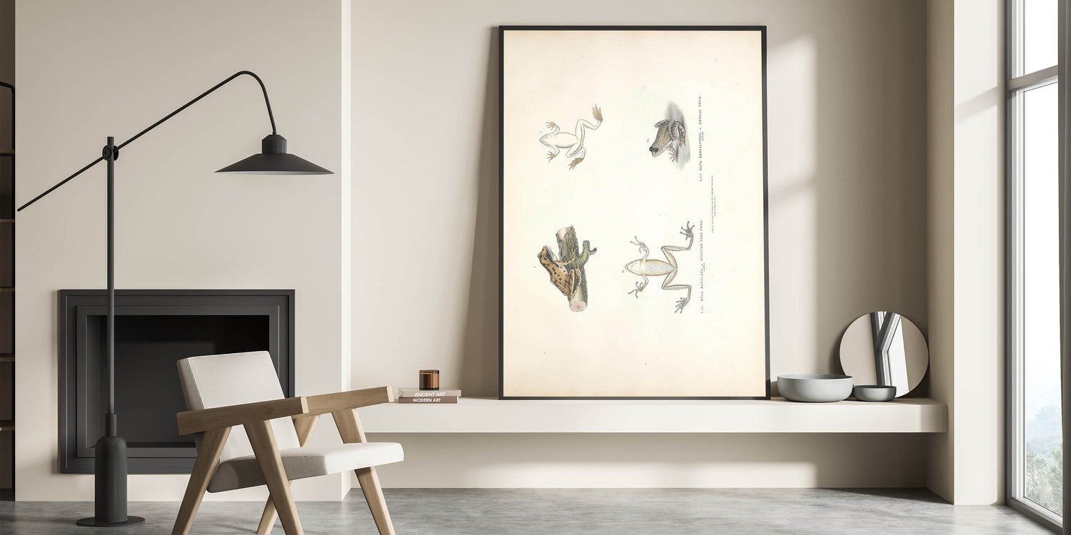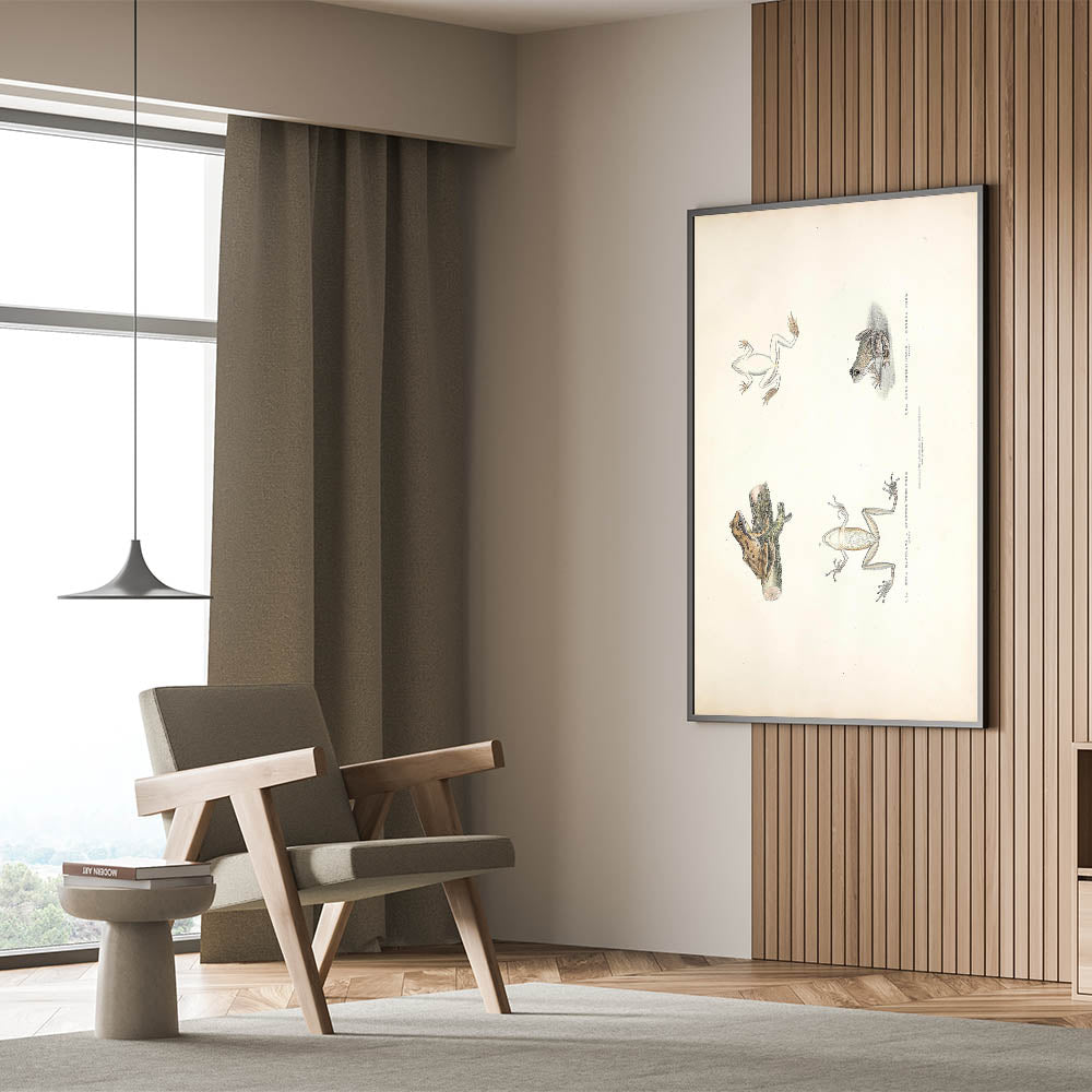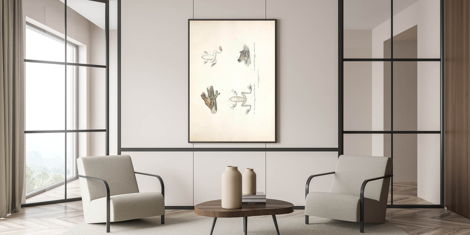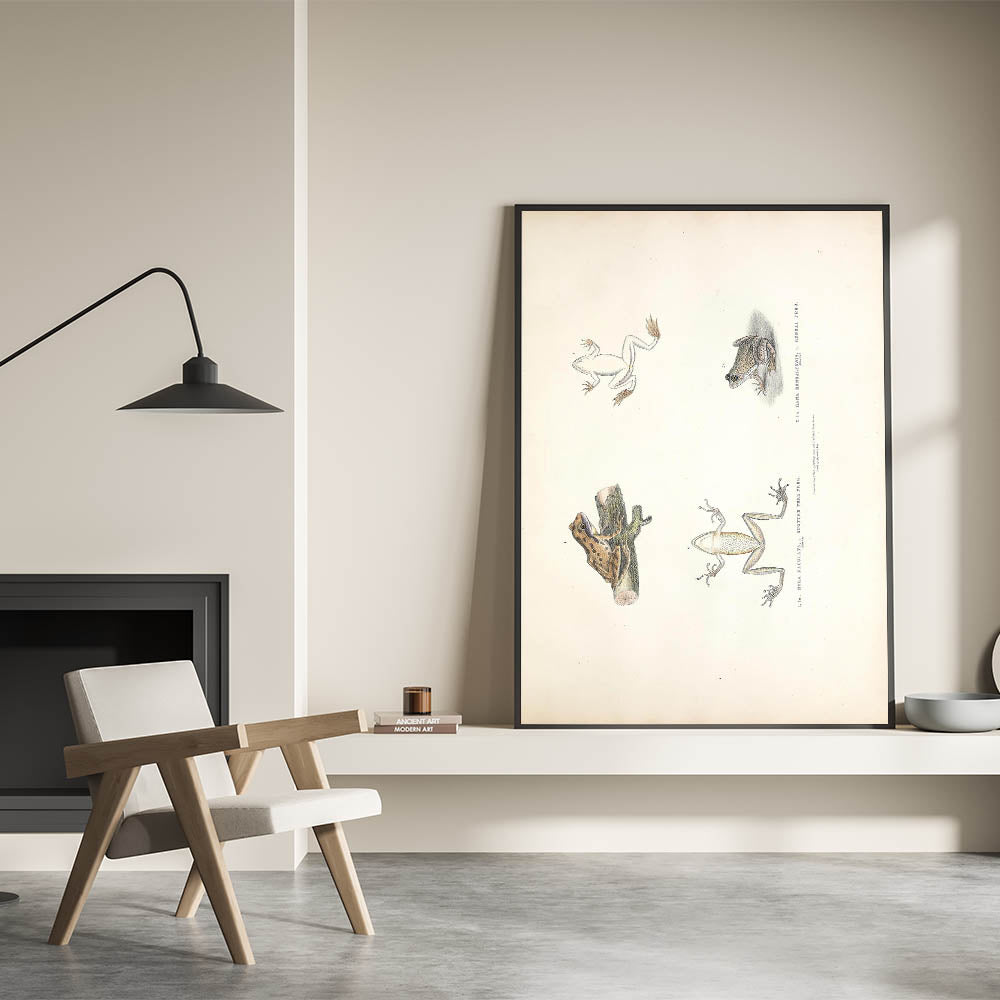 Bring a touch of vintage natural history into your home with our "Vintage Animal Art: Bengal Frog" illustration. This piece features detailed renderings of various frog species, including the Bengal Frog, showcasing their unique forms and natural habitats. Perfect for adding a classic, educational touch to any space, this artwork is available in a variety of high-quality materials, including stretched canvas, framed prints, and acrylic glass.