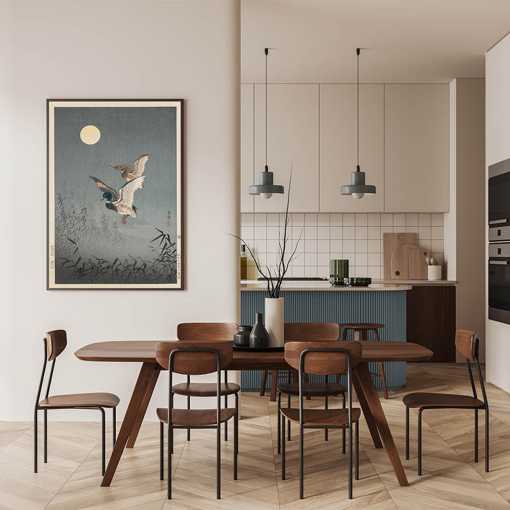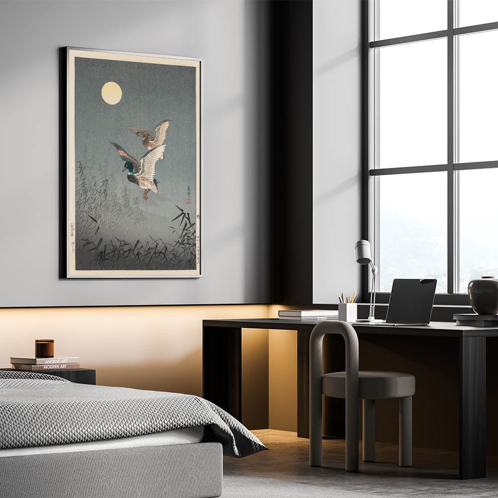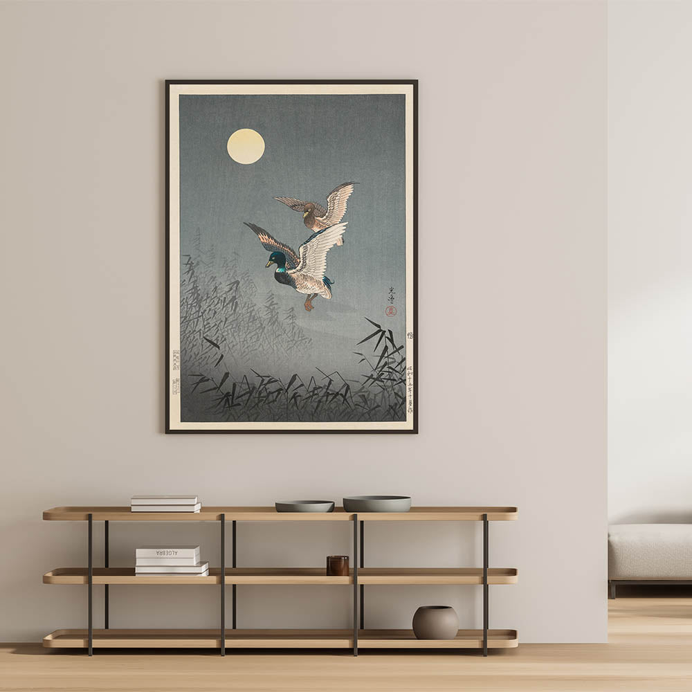 Bring nature's beauty into your home with this timeless vintage animal art. Featuring a serene illustration of ducks soaring through a tranquil night sky, this piece captures the graceful movement of wildlife in a beautiful and nostalgic retro style. Perfect for any animal lover, this illustration transports you to a peaceful natural world, where art and nature meet in harmony.