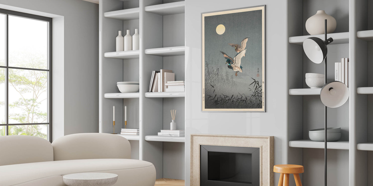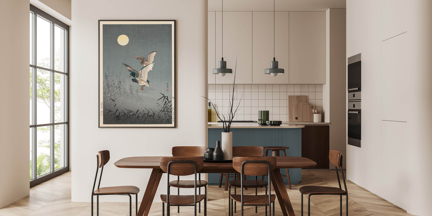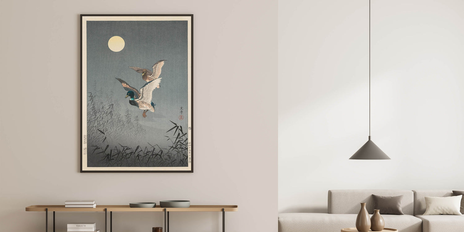 Bring nature's beauty into your home with this timeless vintage animal art. Featuring a serene illustration of ducks soaring through a tranquil night sky, this piece captures the graceful movement of wildlife in a beautiful and nostalgic retro style. Perfect for any animal lover, this illustration transports you to a peaceful natural world, where art and nature meet in harmony.