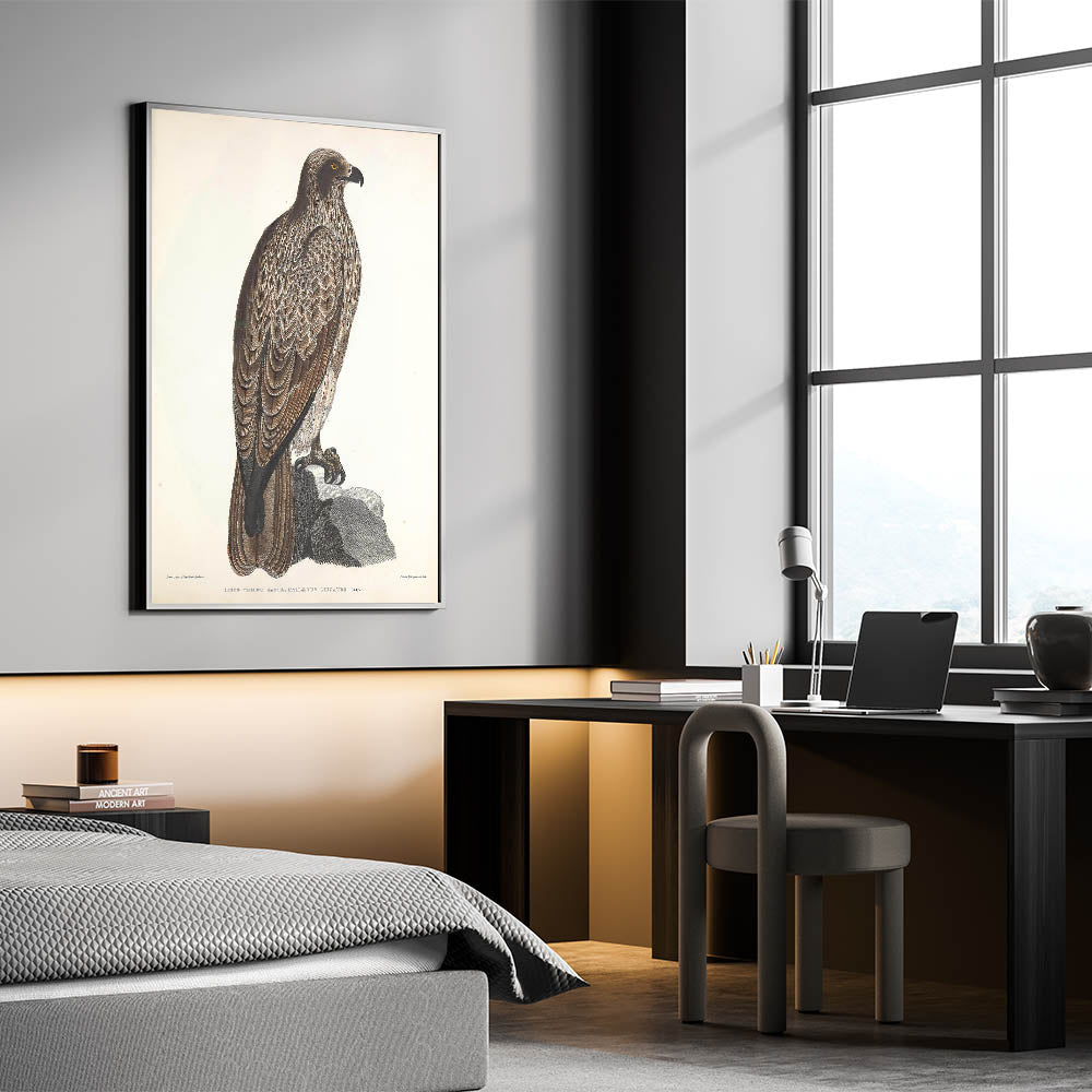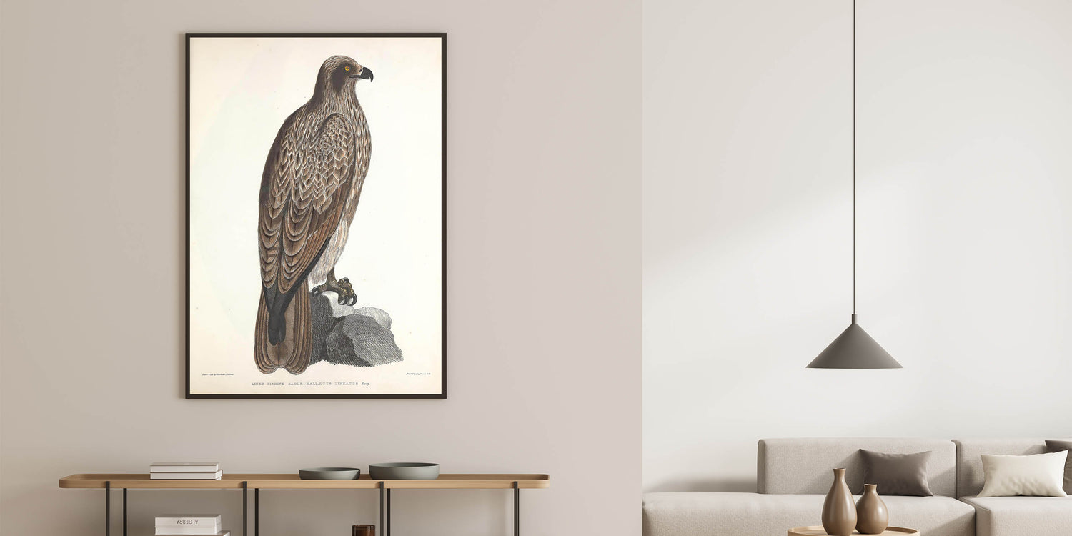 Enhance your home decor with this handcrafted vintage animal art print. Featuring a stunning illustration of the lined fishing eagle, this piece captures the elegance and power of this majestic bird. Perfect for wildlife lovers and vintage art collectors alike.