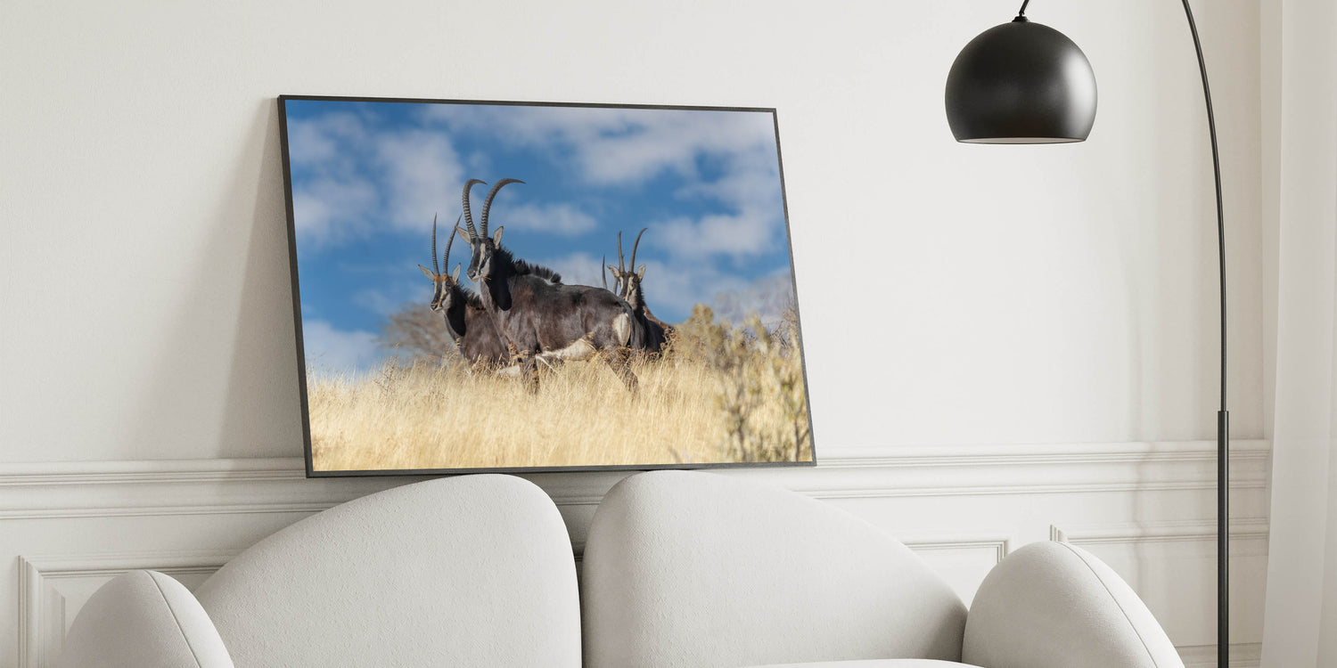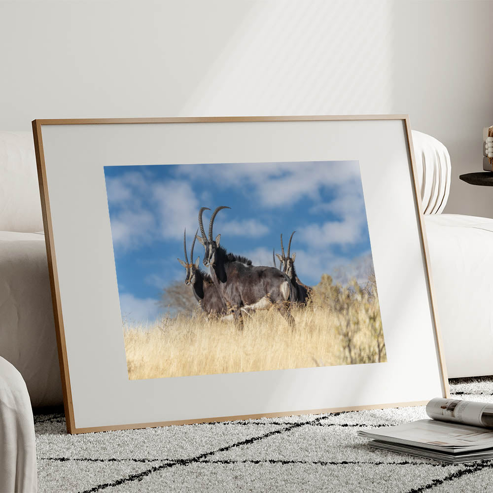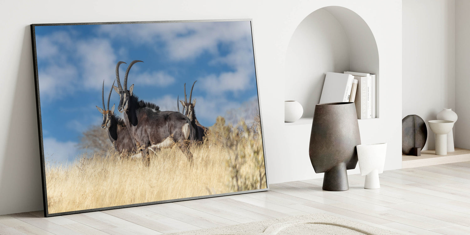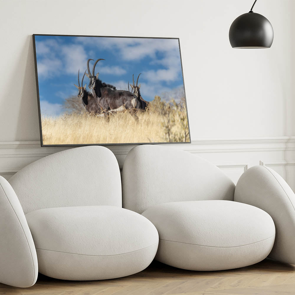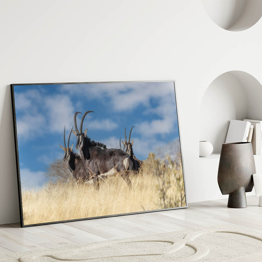 Experience the raw beauty of the African savanna with this Bold Antelope Herd in the Grasslands wall art. This striking piece features a group of powerful antelopes standing tall in the golden grass, their sharp horns and dark coats contrasting beautifully with the clear blue sky. This dynamic scene captures the essence of the wild, making it a perfect addition to any space that celebrates the untamed beauty of nature.