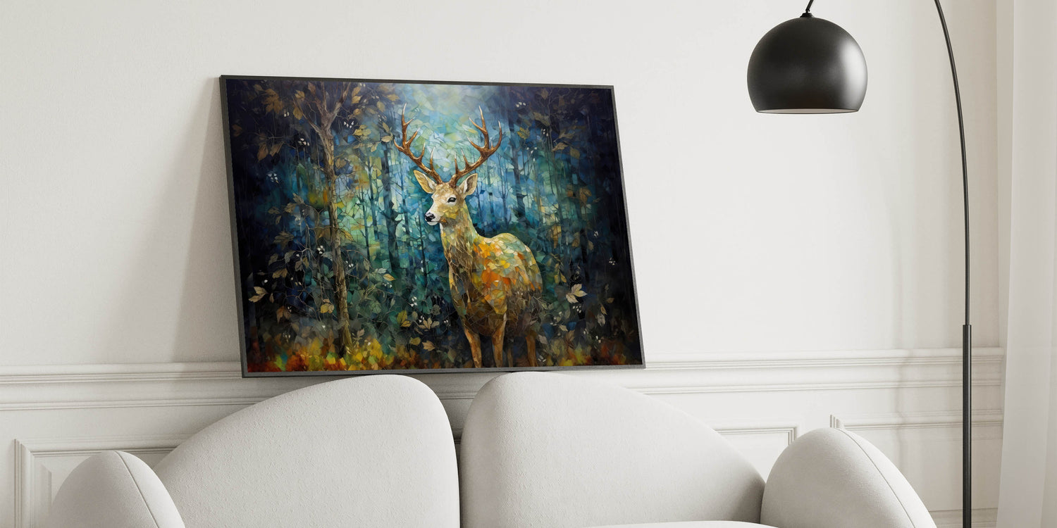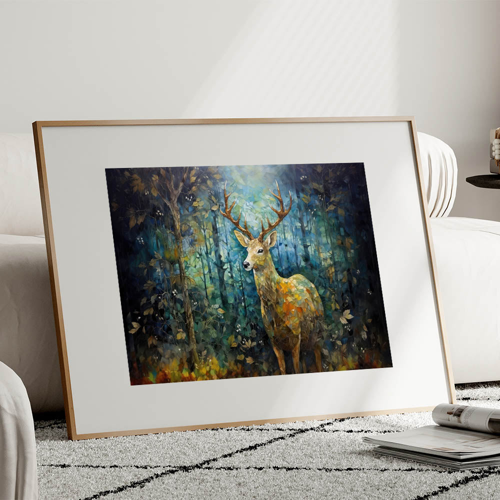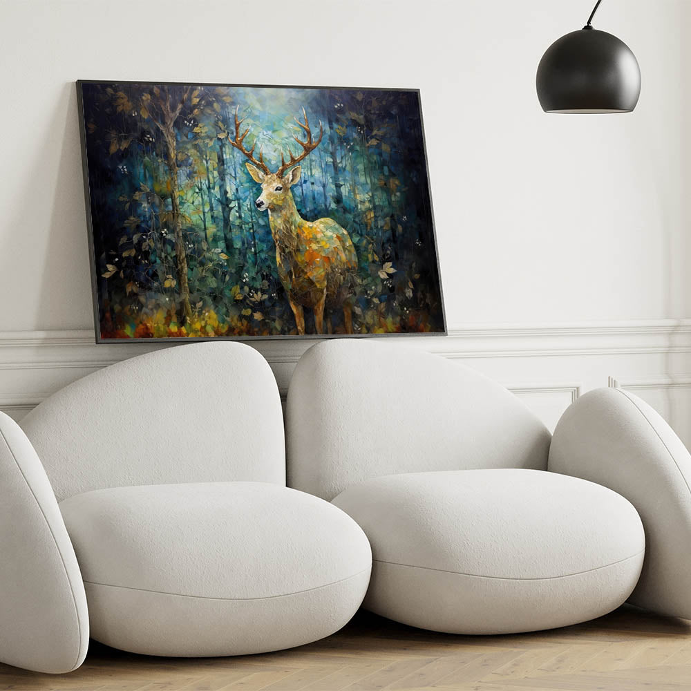 Transform your space with this majestic antelope wall art, capturing the grace and beauty of wildlife. This stunning antelope print showcases a serene antelope in a lush forest setting, brought to life with vibrant colors and intricate details. The harmonious blend of blues, greens, and earthy tones makes this piece a captivating addition to any decor style.