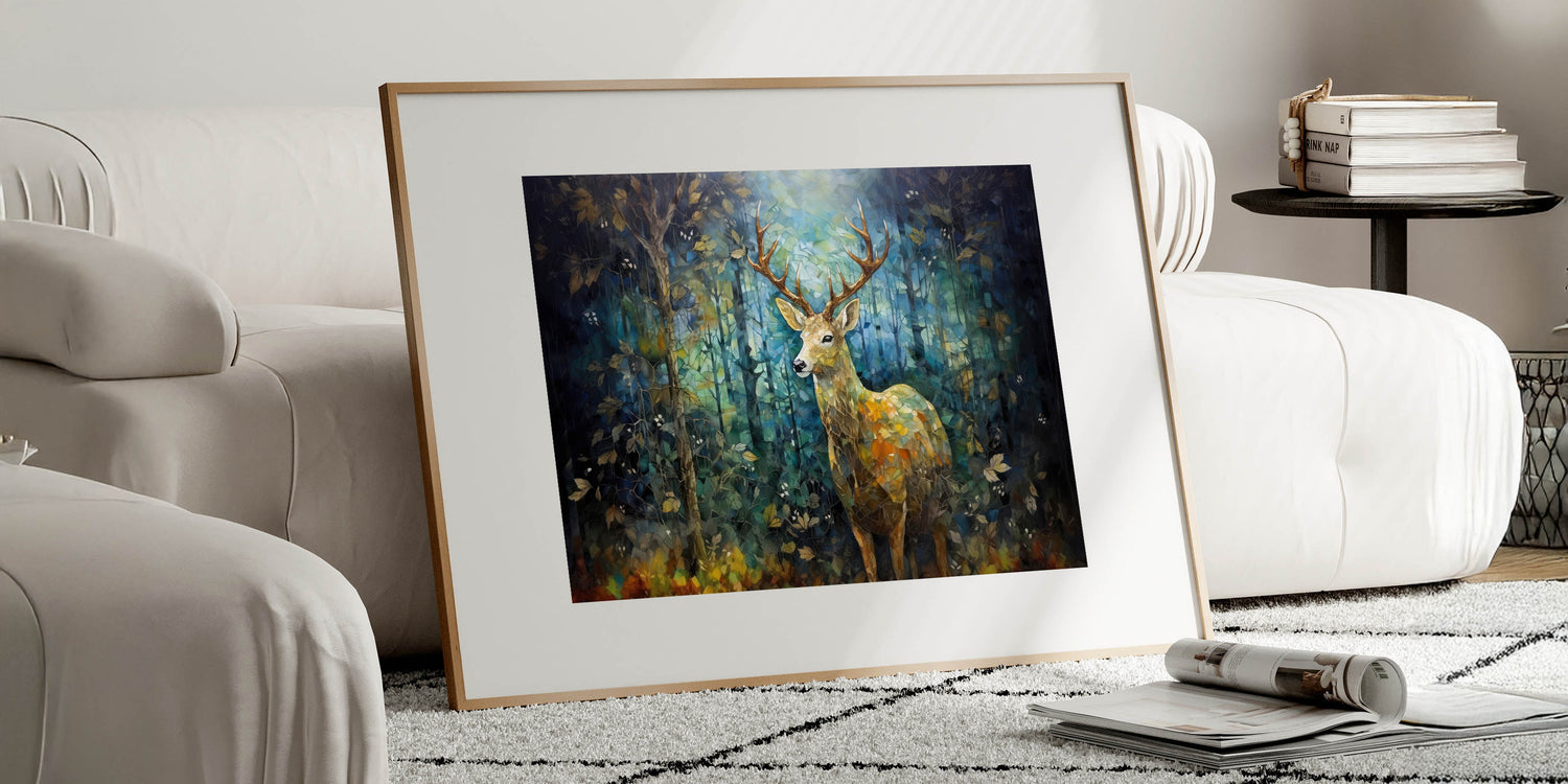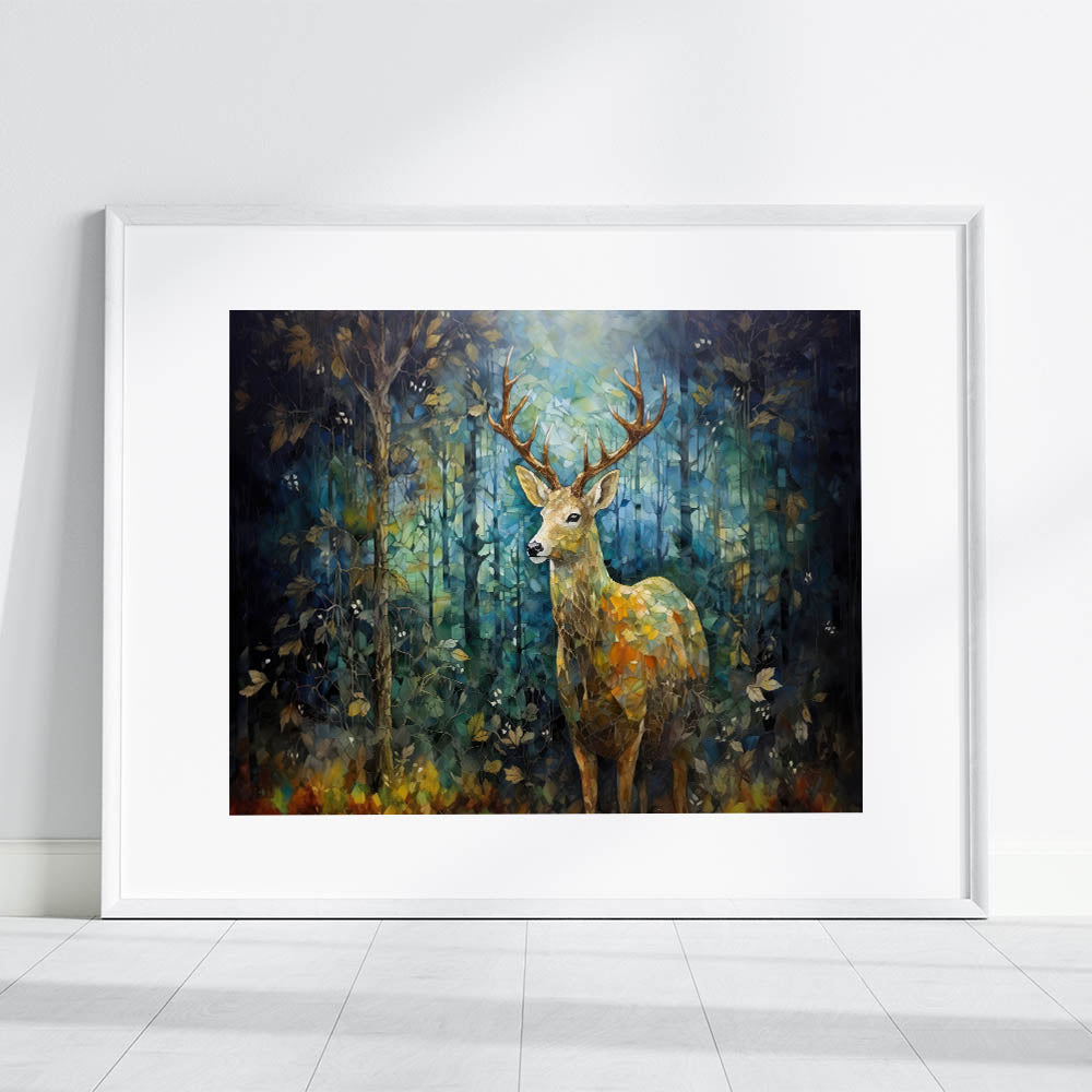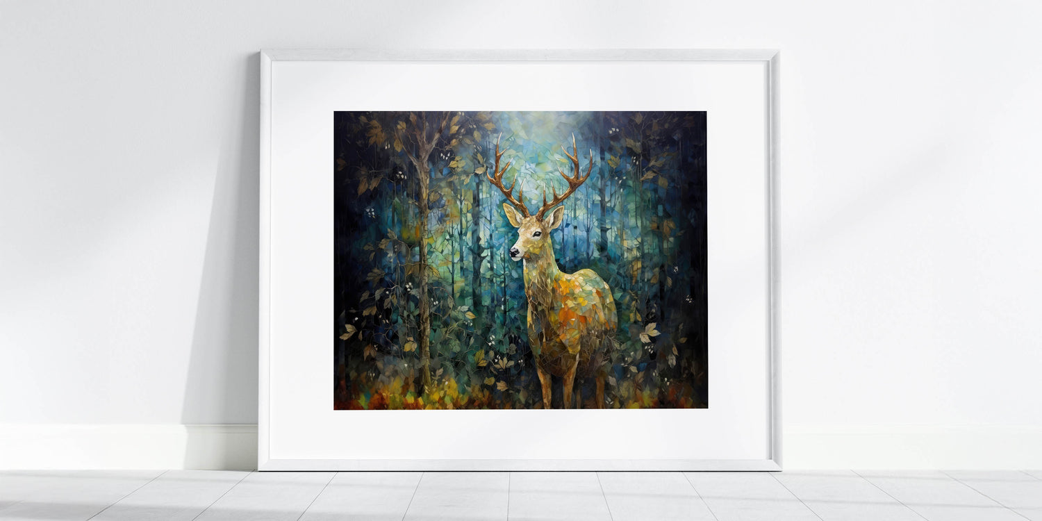 Transform your space with this majestic antelope wall art, capturing the grace and beauty of wildlife. This stunning antelope print showcases a serene antelope in a lush forest setting, brought to life with vibrant colors and intricate details. The harmonious blend of blues, greens, and earthy tones makes this piece a captivating addition to any decor style.