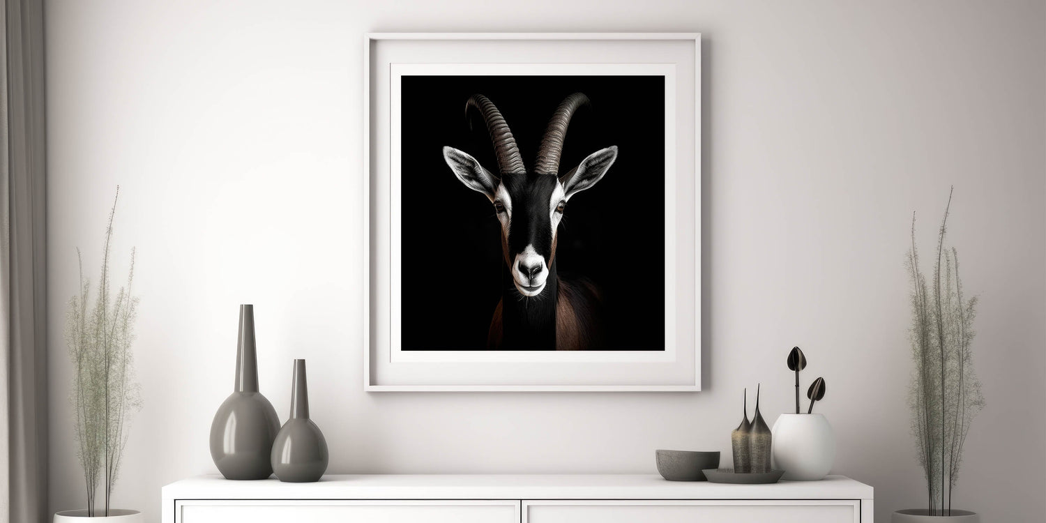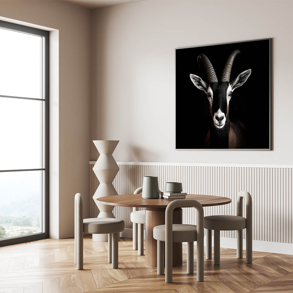 Bring the serene beauty of the wilderness into your space with this Majestic Black Antelope Portrait. This exquisite wall art features a striking antelope with bold, curved horns, captured in a stunning black and white composition that emphasizes the animal's elegance and strength. The deep black background enhances the antelope's detailed features, making this piece a captivating focal point in any room.