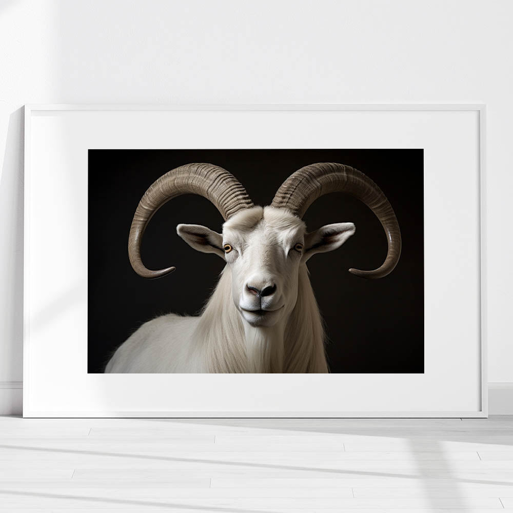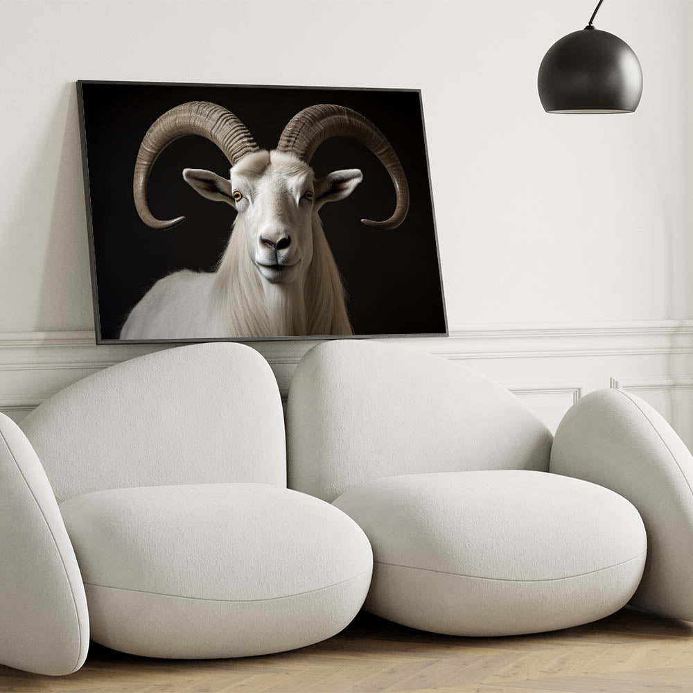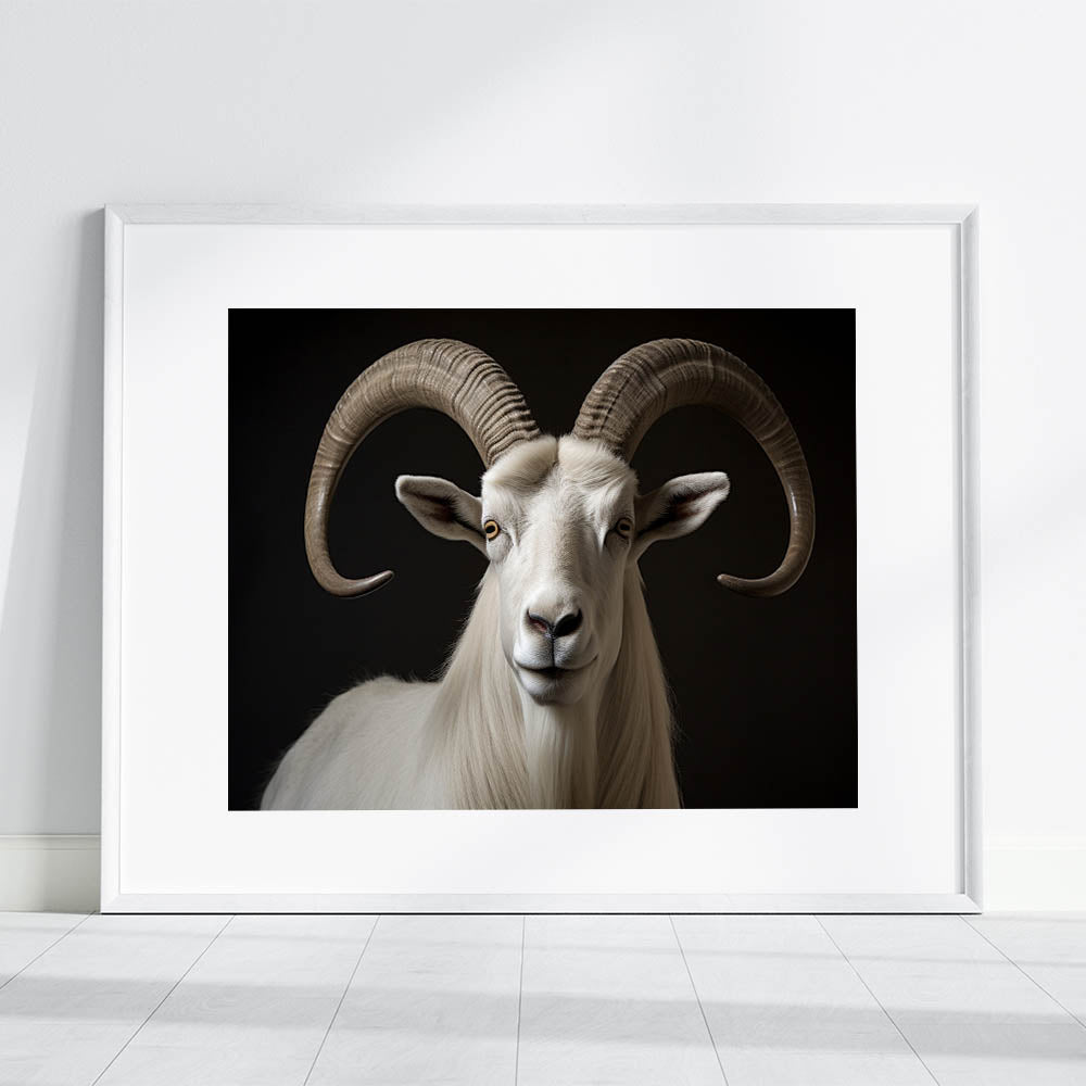 Elevate your home decor with this captivating piece of antelope wall art, featuring a majestic white antelope with strikingly curled horns. The simplicity of the dark background enhances the elegance and regal presence of the antelope, making it a standout piece in any room. The fine details in the horns and fur are meticulously captured, offering a lifelike and mesmerizing depiction of this noble creature.