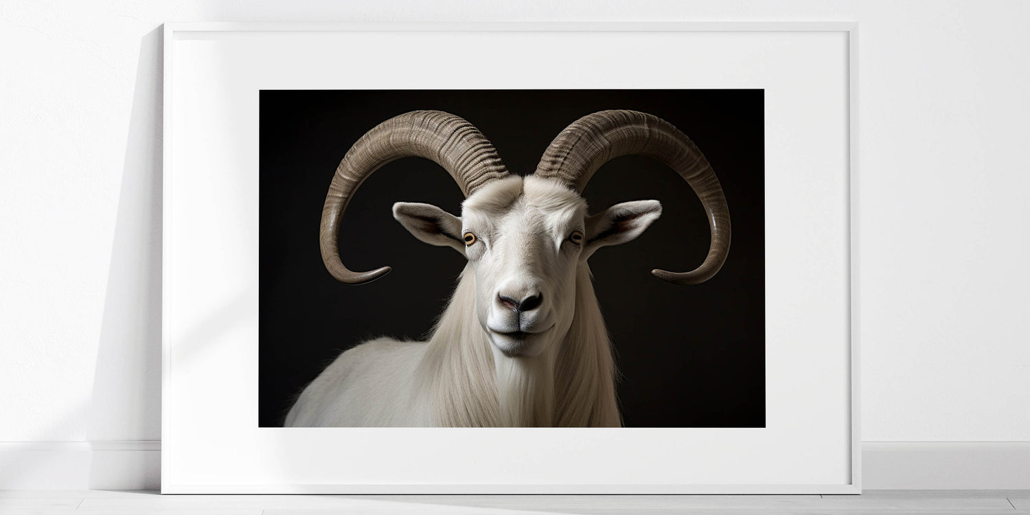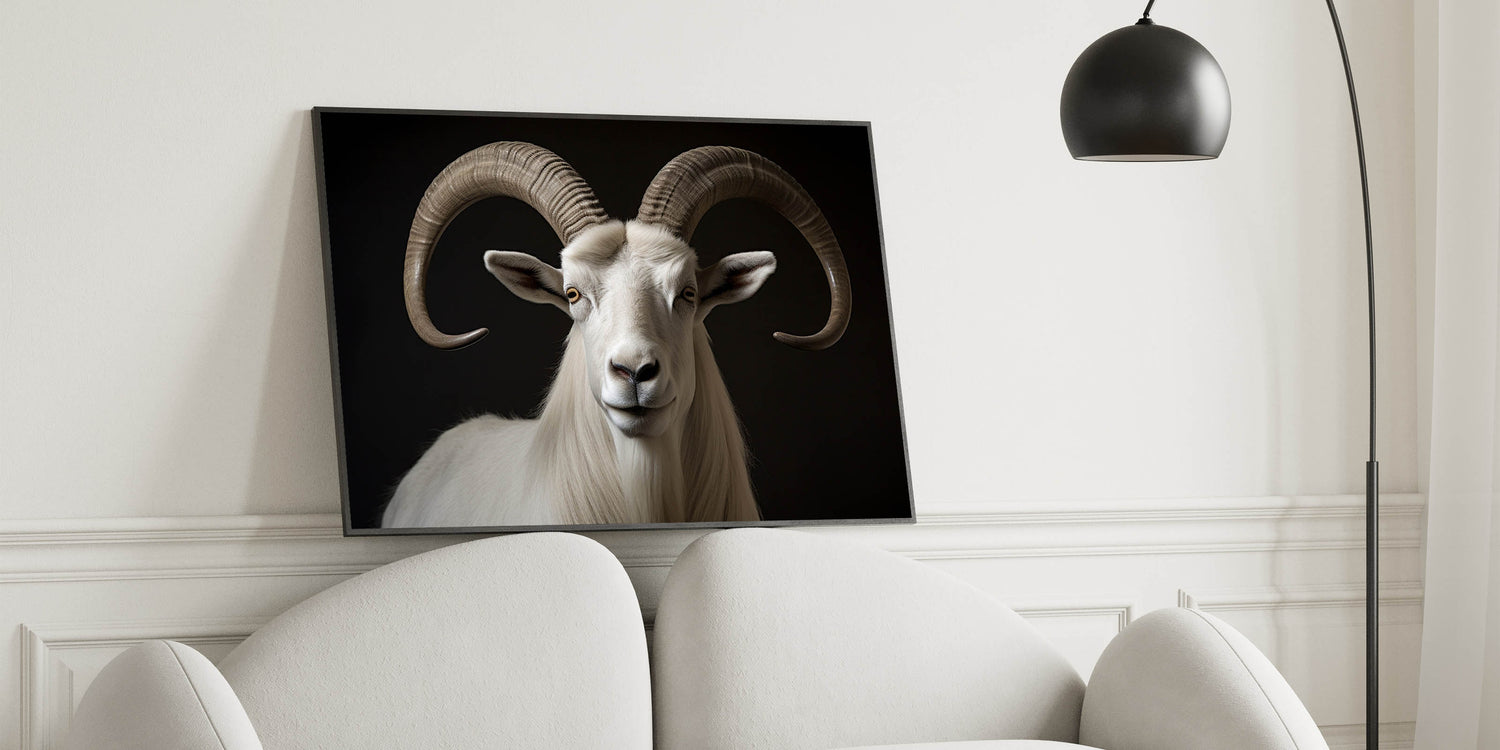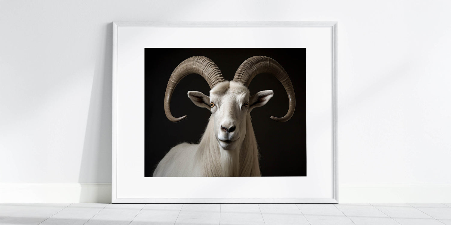 Elevate your home decor with this captivating piece of antelope wall art, featuring a majestic white antelope with strikingly curled horns. The simplicity of the dark background enhances the elegance and regal presence of the antelope, making it a standout piece in any room. The fine details in the horns and fur are meticulously captured, offering a lifelike and mesmerizing depiction of this noble creature.